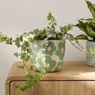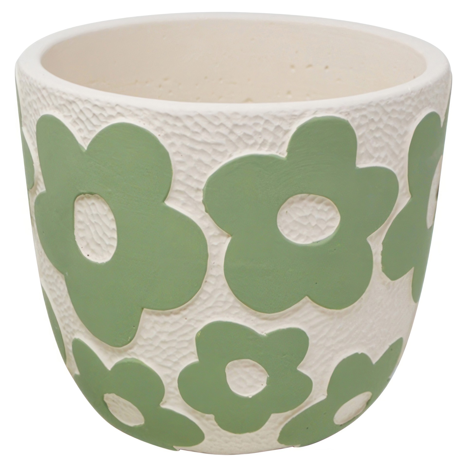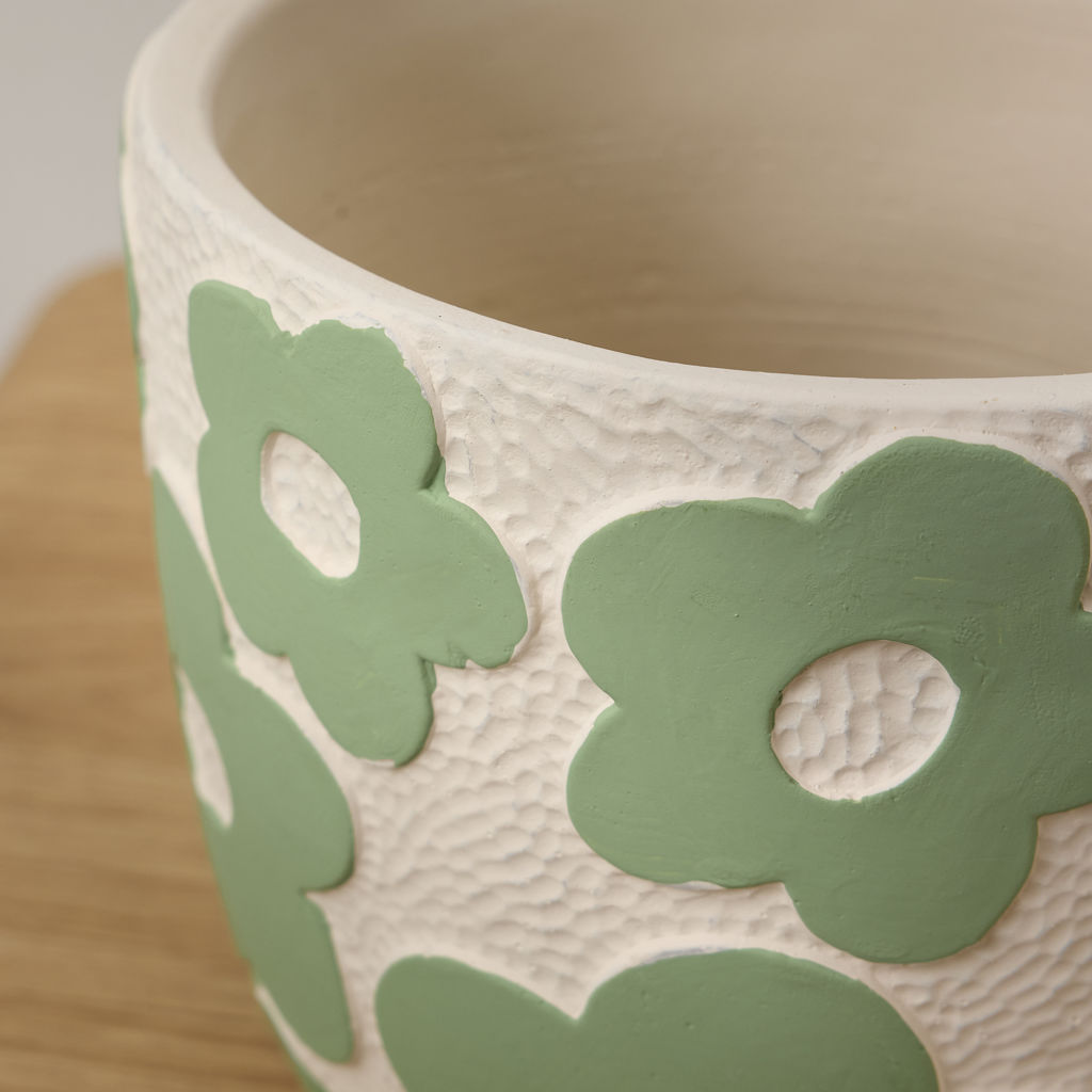 Ce pot en ciment est décoré de grandes fleurs stylisées en vert sur un fond blanc texturé, ce qui lui donne un air gai et printanier.