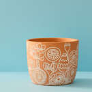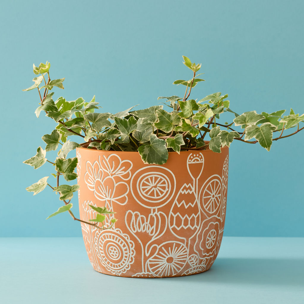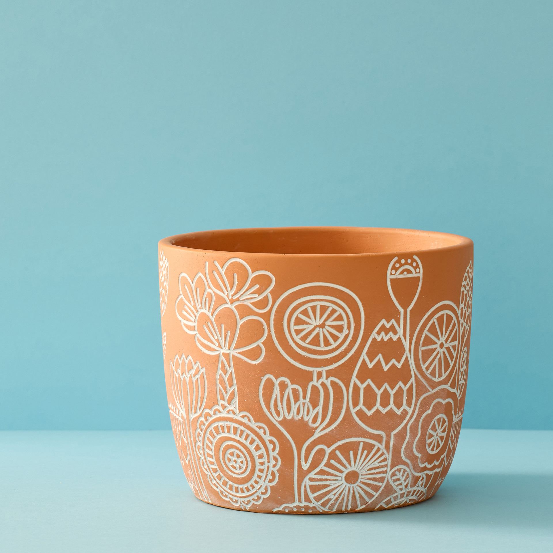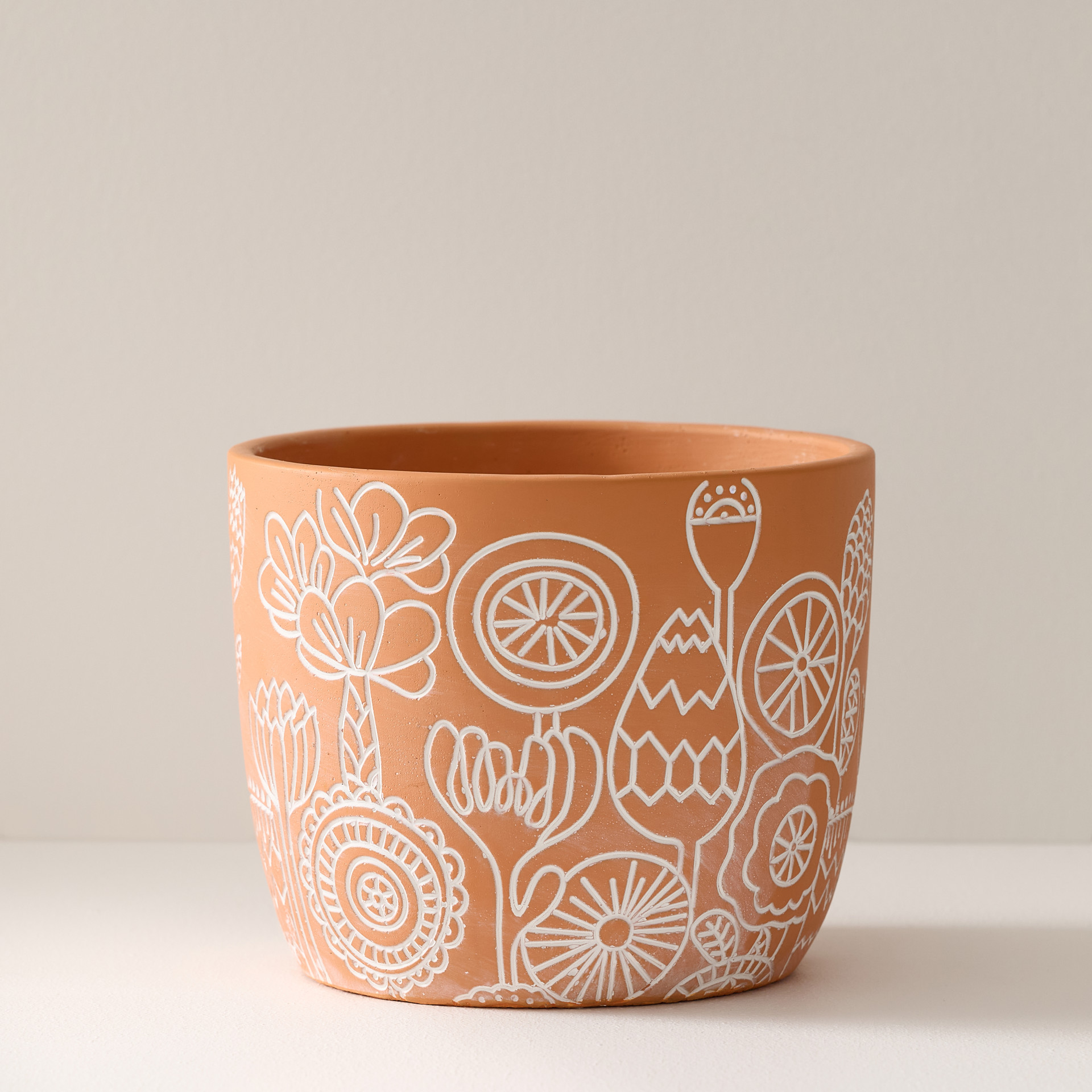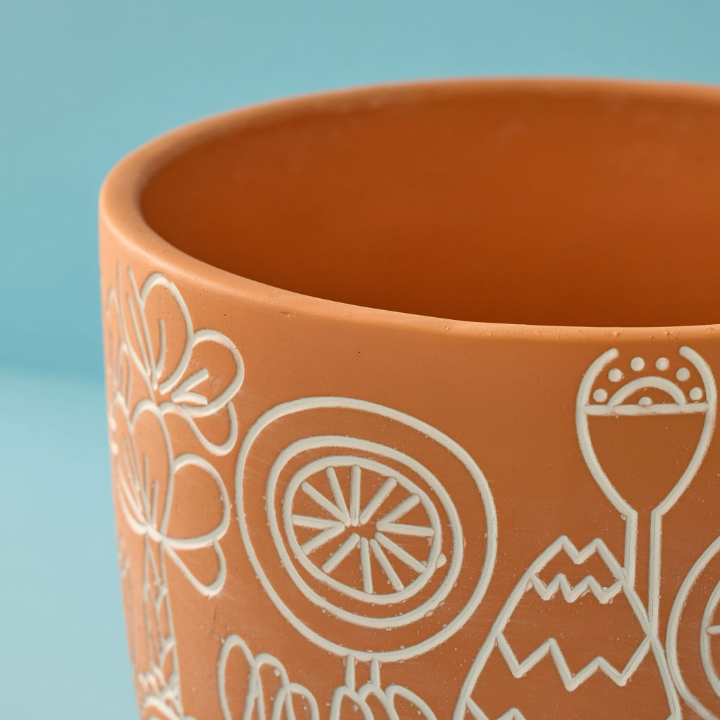 Ce pot en ciment présente un design frais et floral, avec des gravures de fleurs et de motifs botaniques qui lui confèrent un style naturel et détendu.