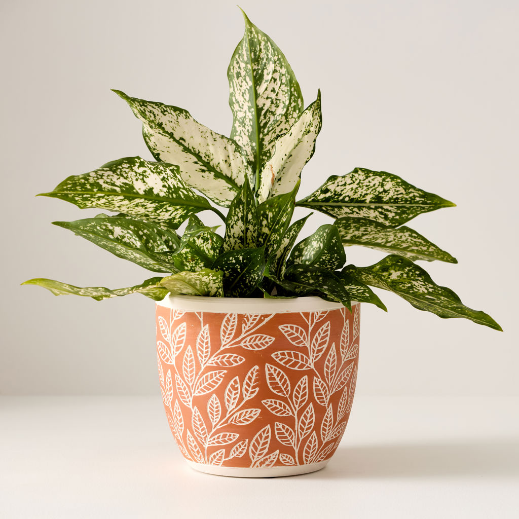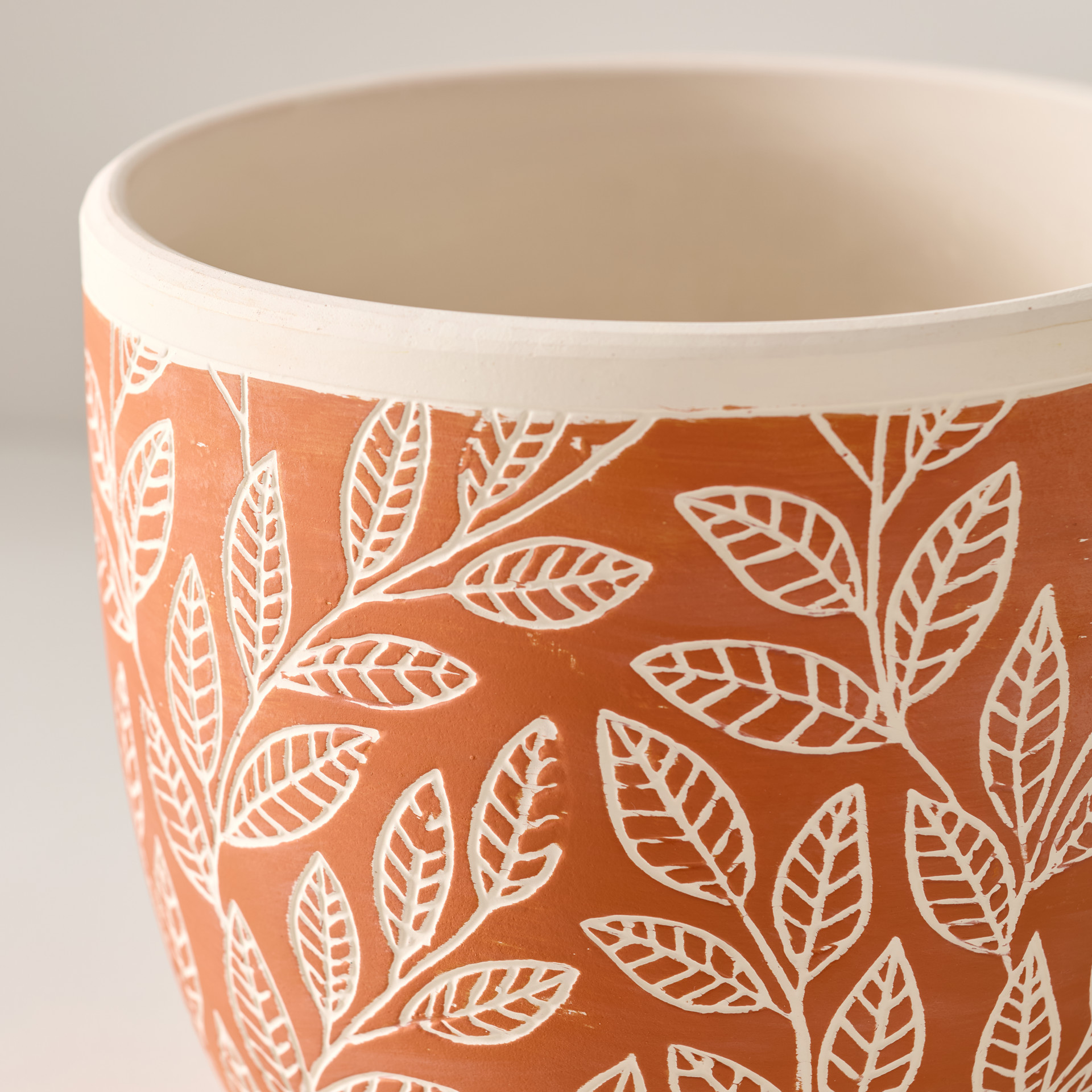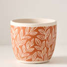 Pot de fleur en céramique orange avec un motif de feuilles blanches, pour une touche de nature dans votre intérieur.