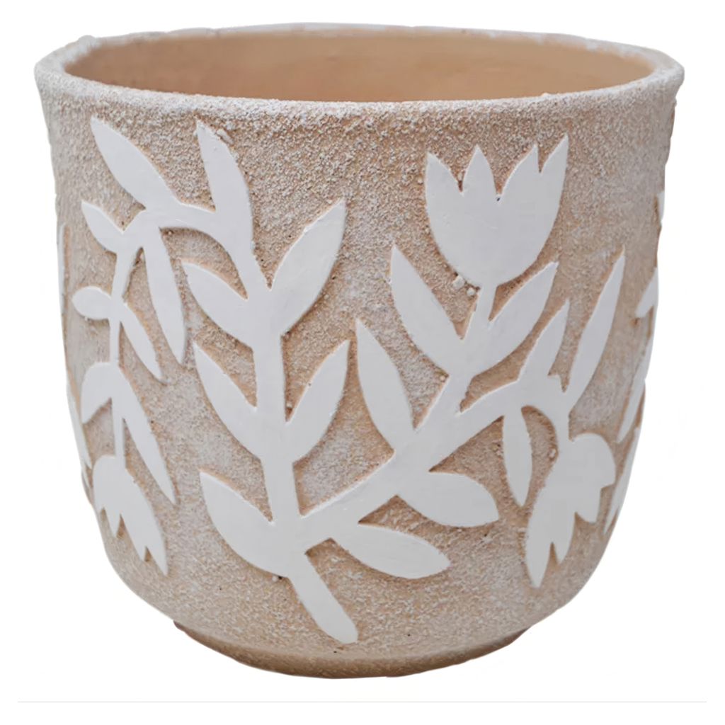 Ce pot en céramique au fini texturé arbore un magnifique motif floral en relief. Son design artisanal et ses tons naturels apportent une touche rustique et chaleureuse à tout espace intérieur ou extérieur.