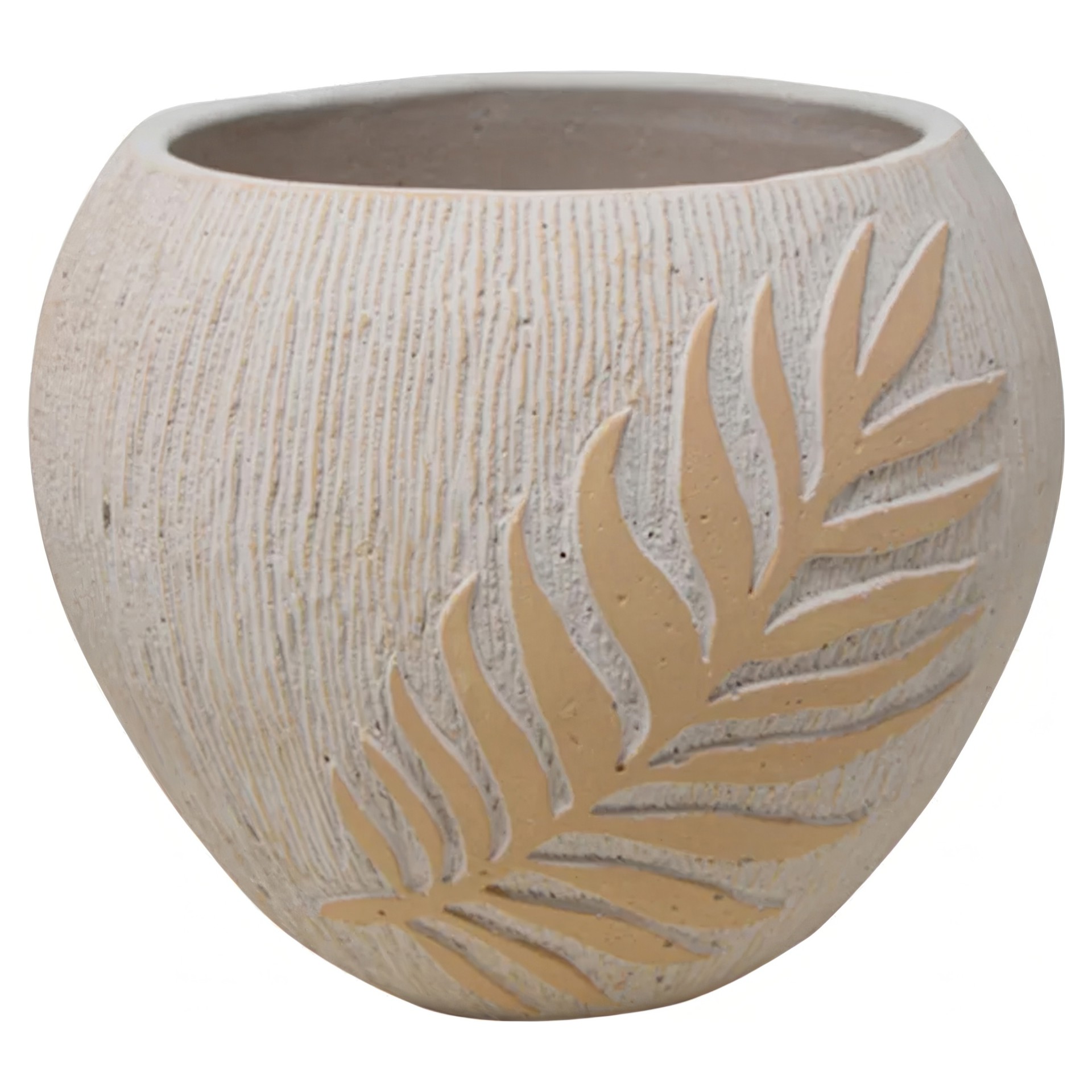 Ce pot en céramique texturée arbore un élégant motif de feuille de palmier en relief, dans des tons naturels et apaisants. Son design arrondi et artisanal apporte une touche exotique et chaleureuse à tout espace intérieur ou extérieur.