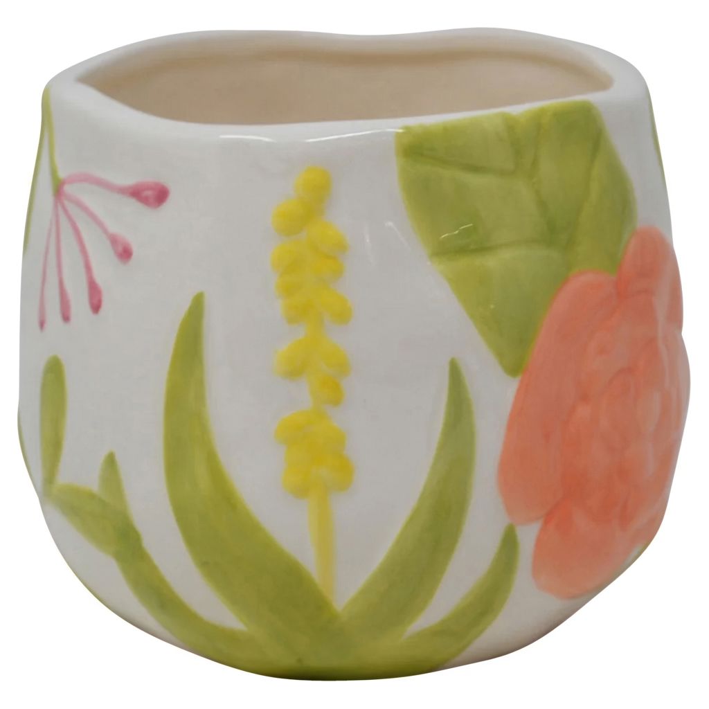 Ce cache-pot en céramique peint à la main séduit par ses couleurs fraîches et son motif floral délicat.