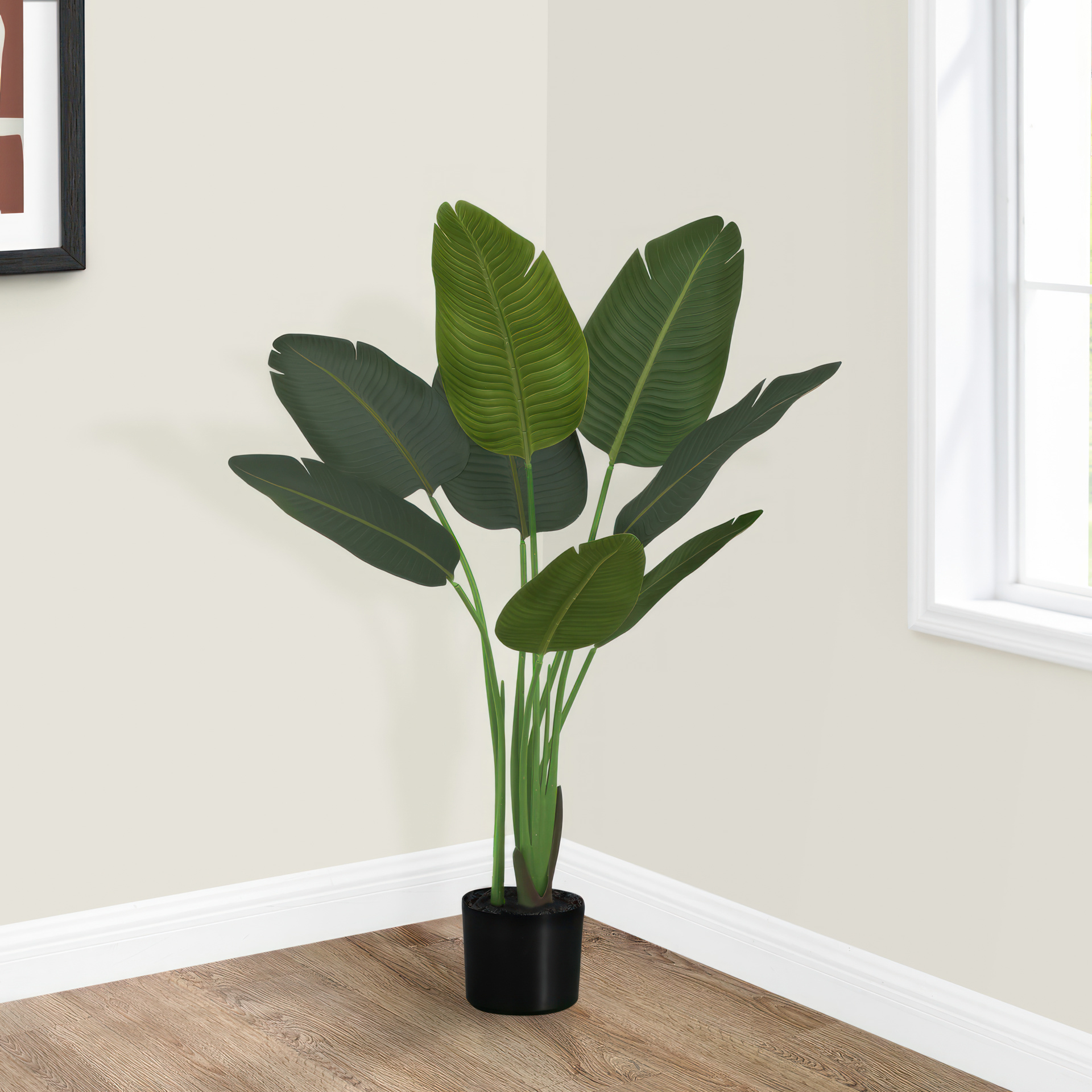 Cet arbre oiseau du paradis artificiel de 44 po de haut donne une touche attrayante et élégante à toute maison ou bureau contemporain. Il a 8 feuilles qui ont une sensation de soie, et il est solidement planté dans un pot noir élégant de 5 po.