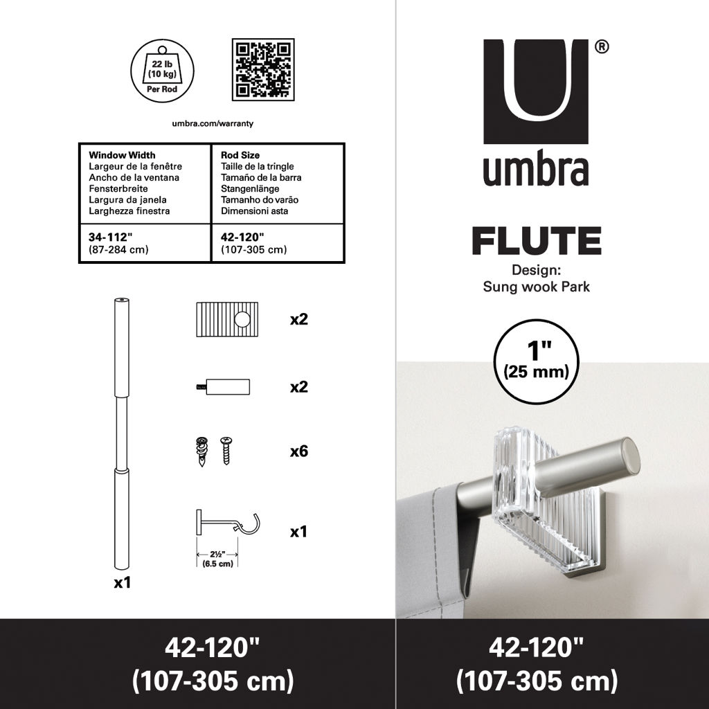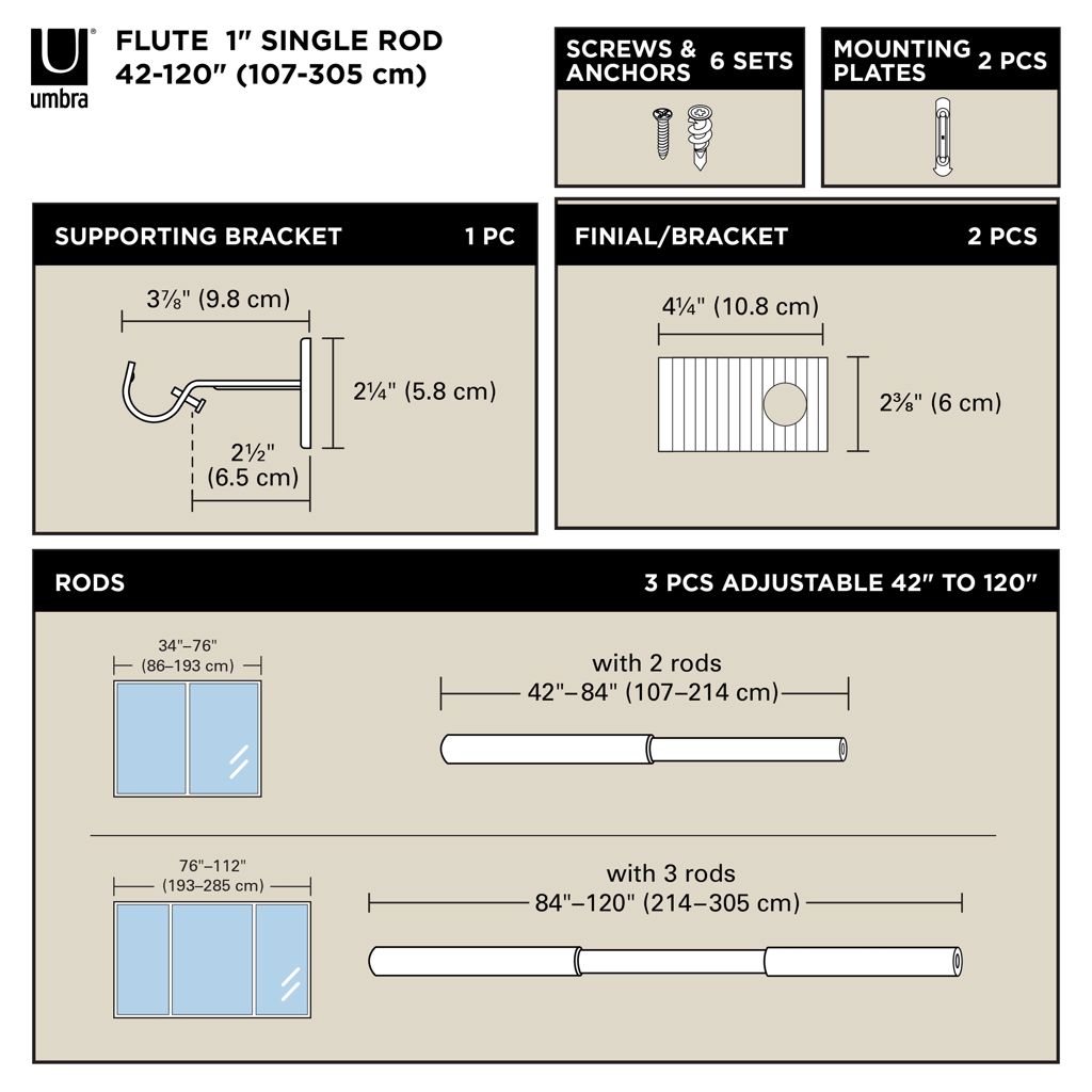 Les détails subtils ajoutent juste assez de caractère sans détourner l'attention de votre décor parfait pour les chambres, les salons ou partout où vous souhaitez une touche finale soignée. La tringle à rideaux Flute de 1 po (2,5 cm) de diamètre est réglable pour s'adapter à une large gamme de fenêtres, de 42 à 120 po (107 - 305 cm) et supporte les rideaux pesant jusqu'à 10 kg (22 lb). Afin de supporter le poids maximal de 10 kg (22 lb), il est nécessaire d'installer le support central inclus.