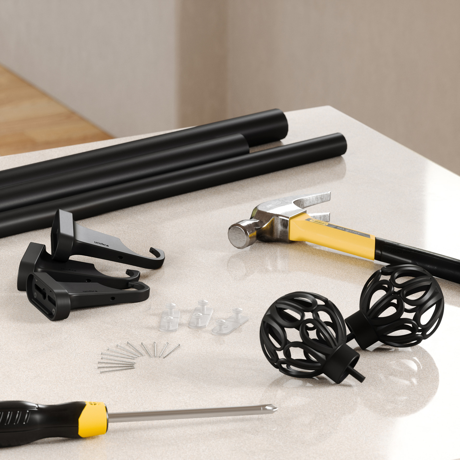 Le système de montage PINPOINT™ assure une installation rapide et sécurisée avec un impact minimal sur le mur, ce qui facilite la pose, le rafraîchissement ou le repositionnement de vos rideaux sans endommager vos murs.