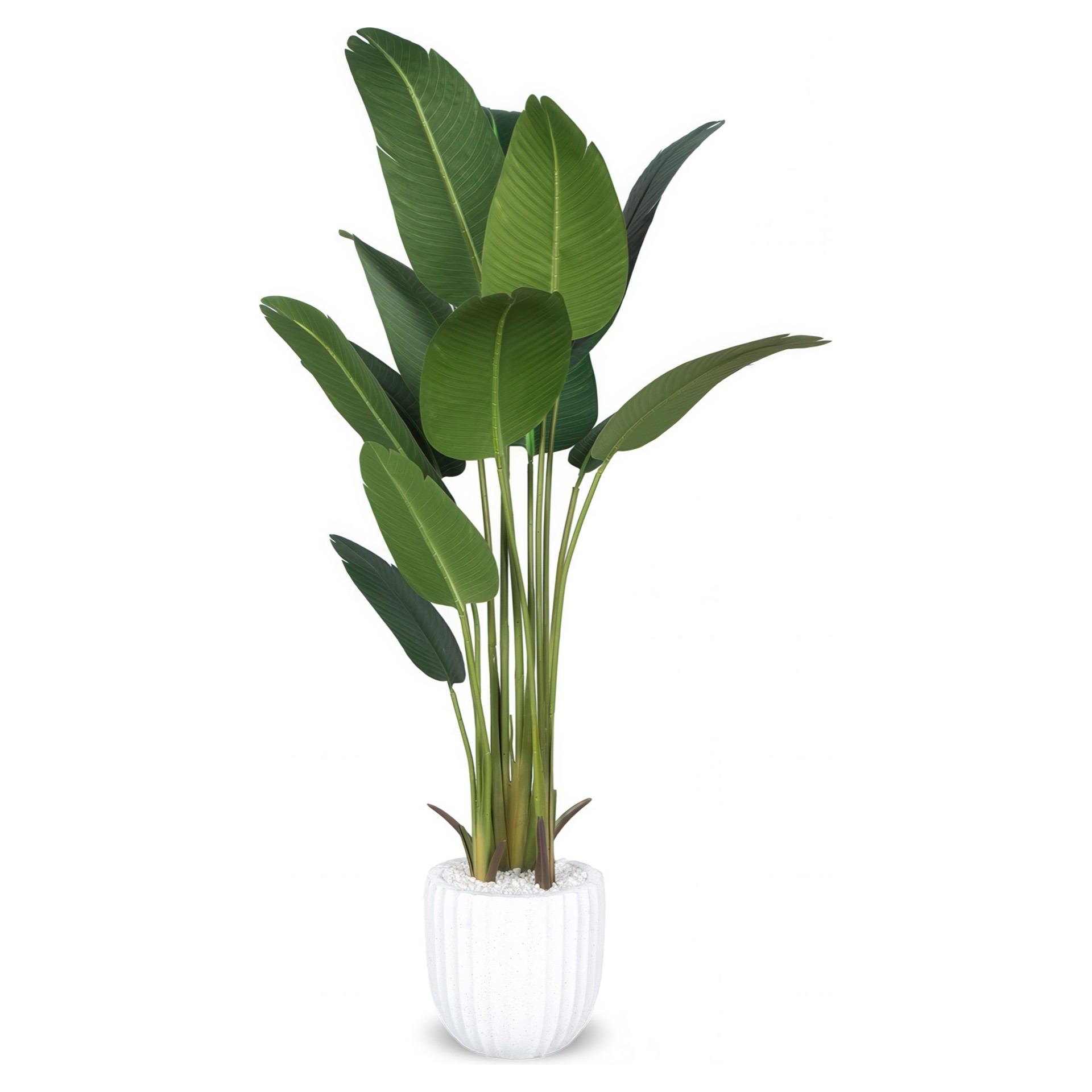 Le Palmier du voyageur artificiel dans un pot de fibre de verre blanc de 72 po de hauteur est une plante éternelle abordable aux allures réalistes qui étanchera votre soif de beauté.