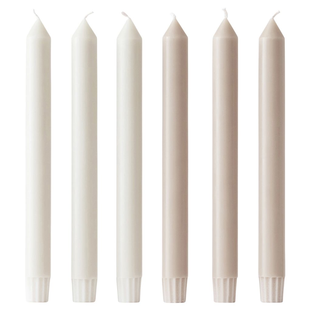 Ces magnifiques chandelles coulées à la main sont offertes en ensembles de six comprenant deux teintes polyvalentes.