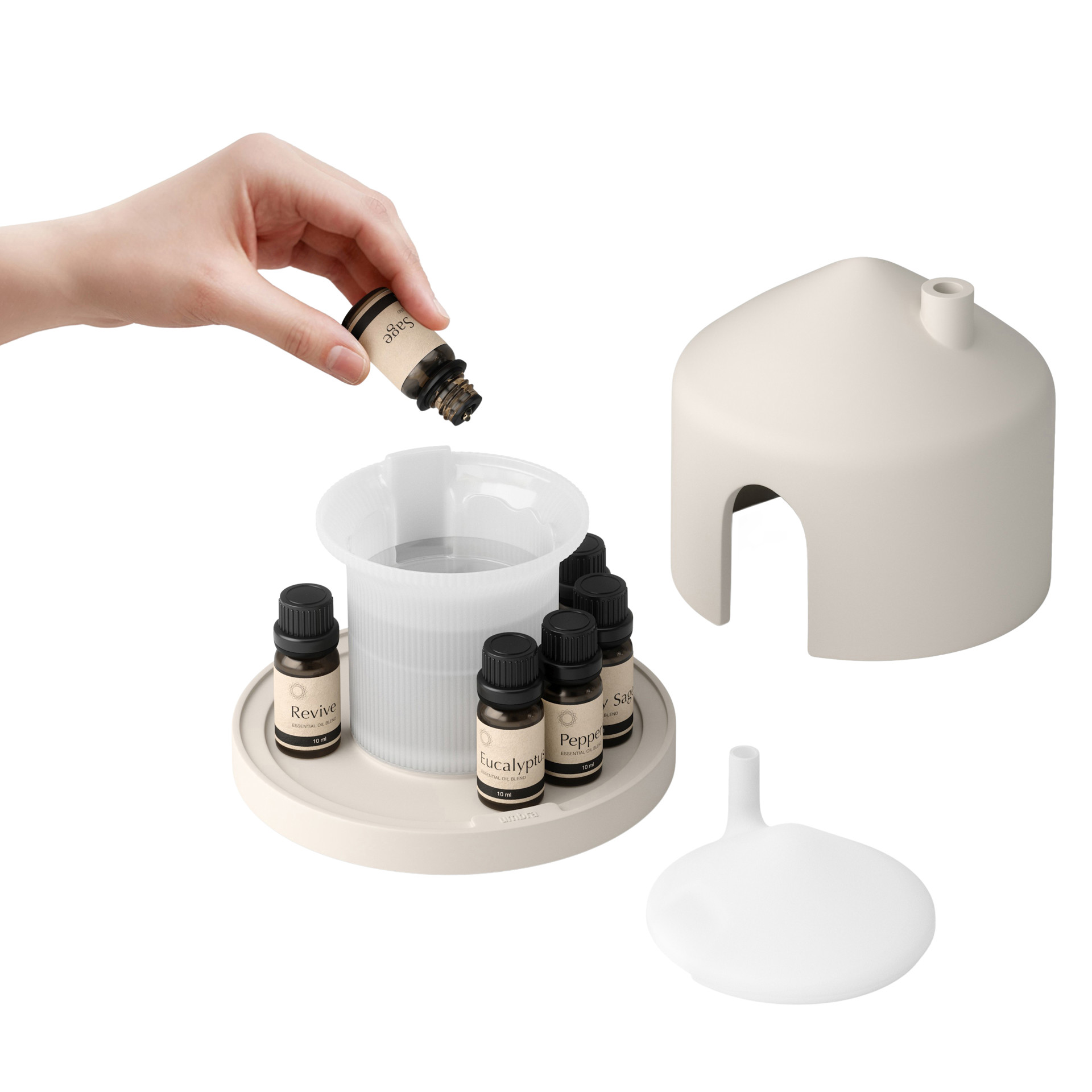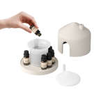 Le diffuseur offre de 5 à 6 heures d'utilisation continue ou de 8 à 10 heures de diffusion intermittente, il s'arrête automatiquement lorsque le niveau d'eau est bas. Son réservoir de 150 ml est parfait pour les pièces de taille moyenne, tandis qu'un compartiment discret sous la base du diffuseur permet de ranger jusqu'à 8 flacons d'huiles essentielles de 15 ml ou 10 flacons de 10 ml.