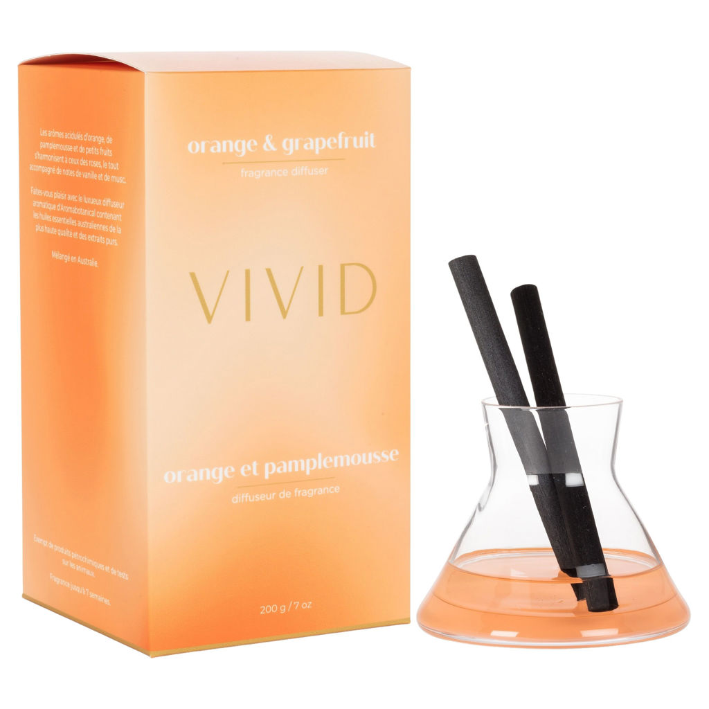 Le diffuseur moderne orange et pamplemousse diffuse un parfum d'orange et de pamplemousse acidulé, associé à des baies sucrées et des roses roses sur un fond de vanille crémeuse et de musc.
