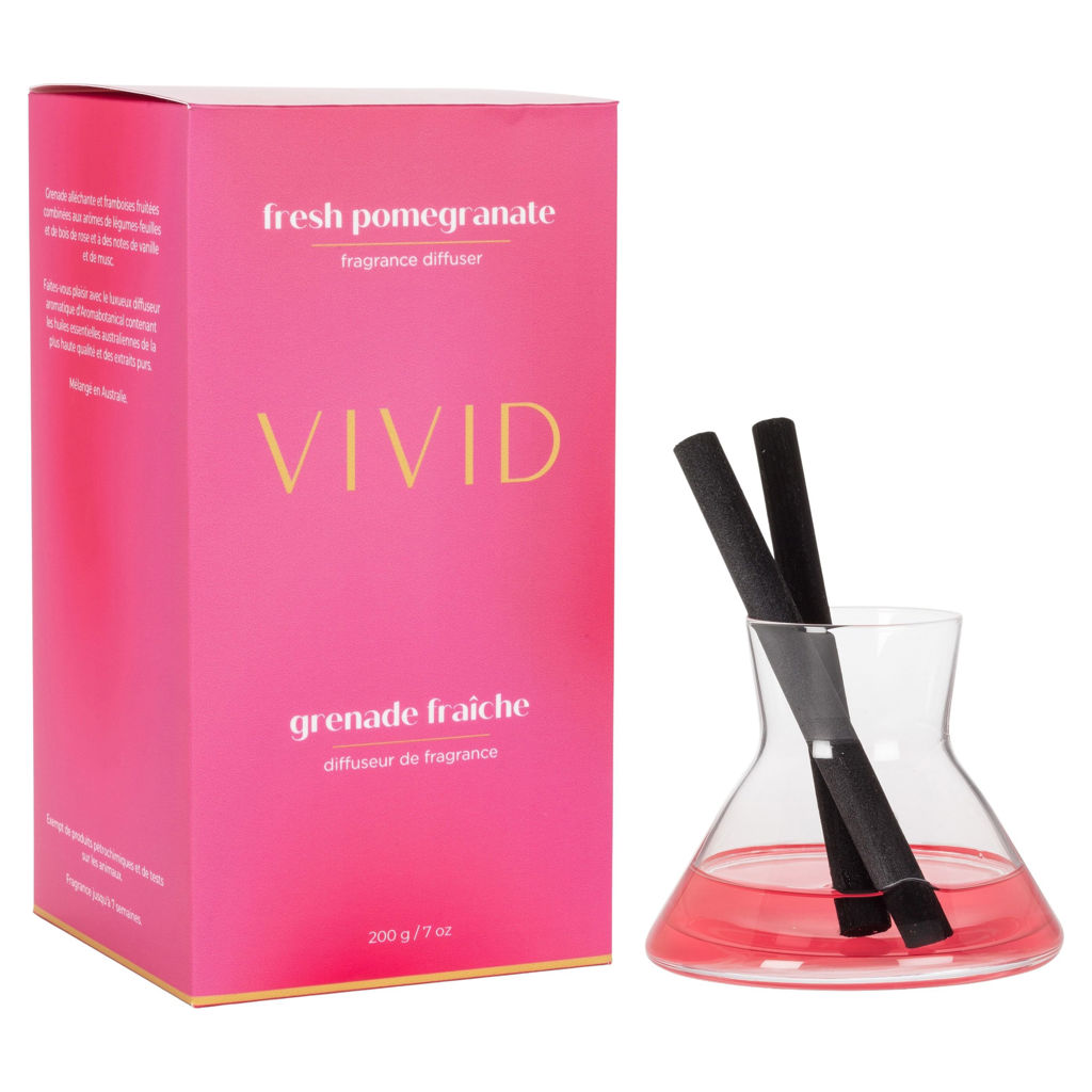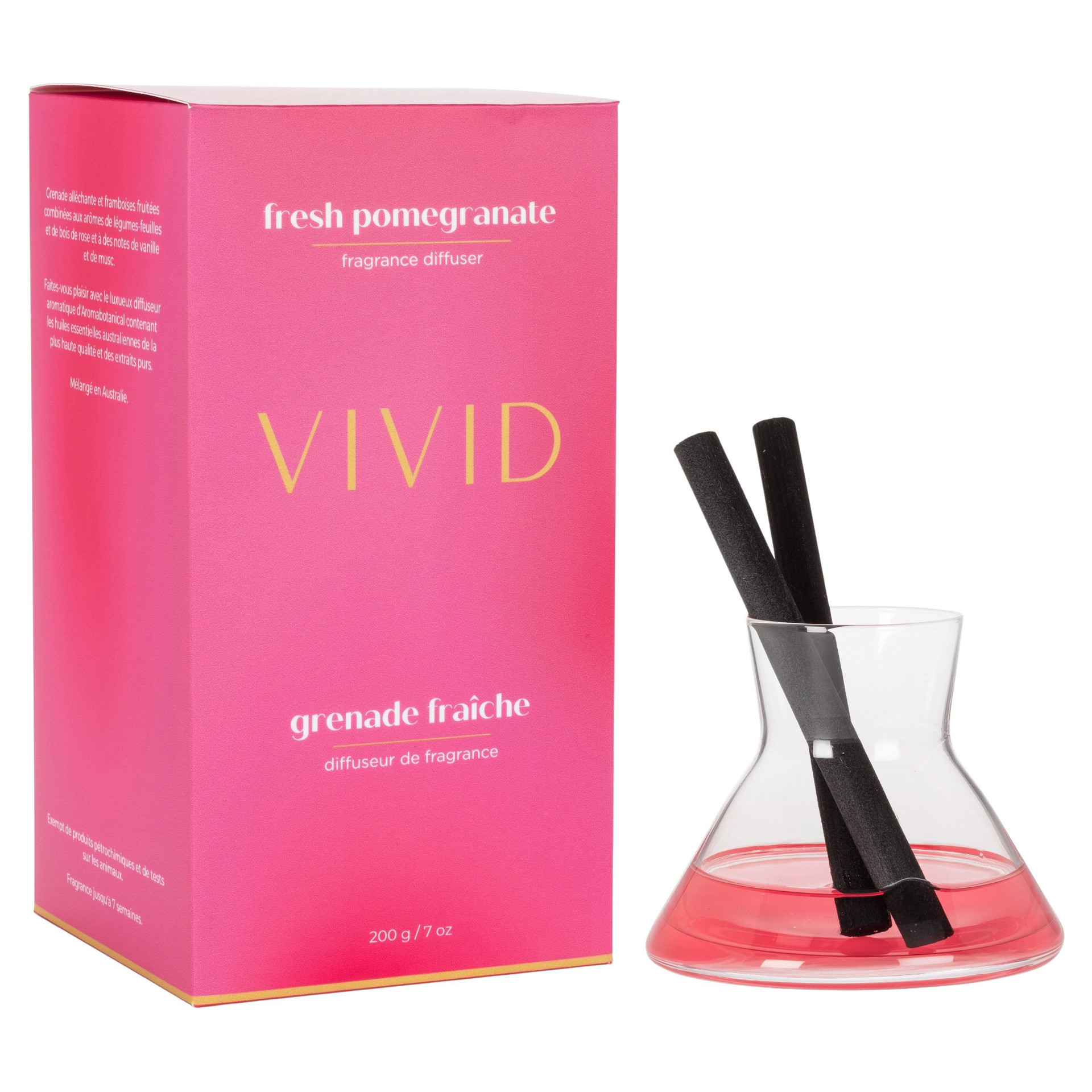 Le diffuseur moderne grenade fraîche diffuse un parfum de grenade mêlé à des notes vertes feuillues, fruits sucrés, framboise, bois de rose et vanille crémeuse avec musc.