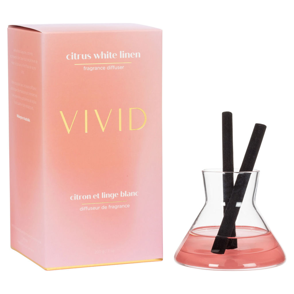 Le diffuseur moderne lin blanc et agrumes diffuse un parfum de citron méditerranéen frais et fruité avec un cur exotique de pêche et melon sur une base sucrée de racine d'iris.