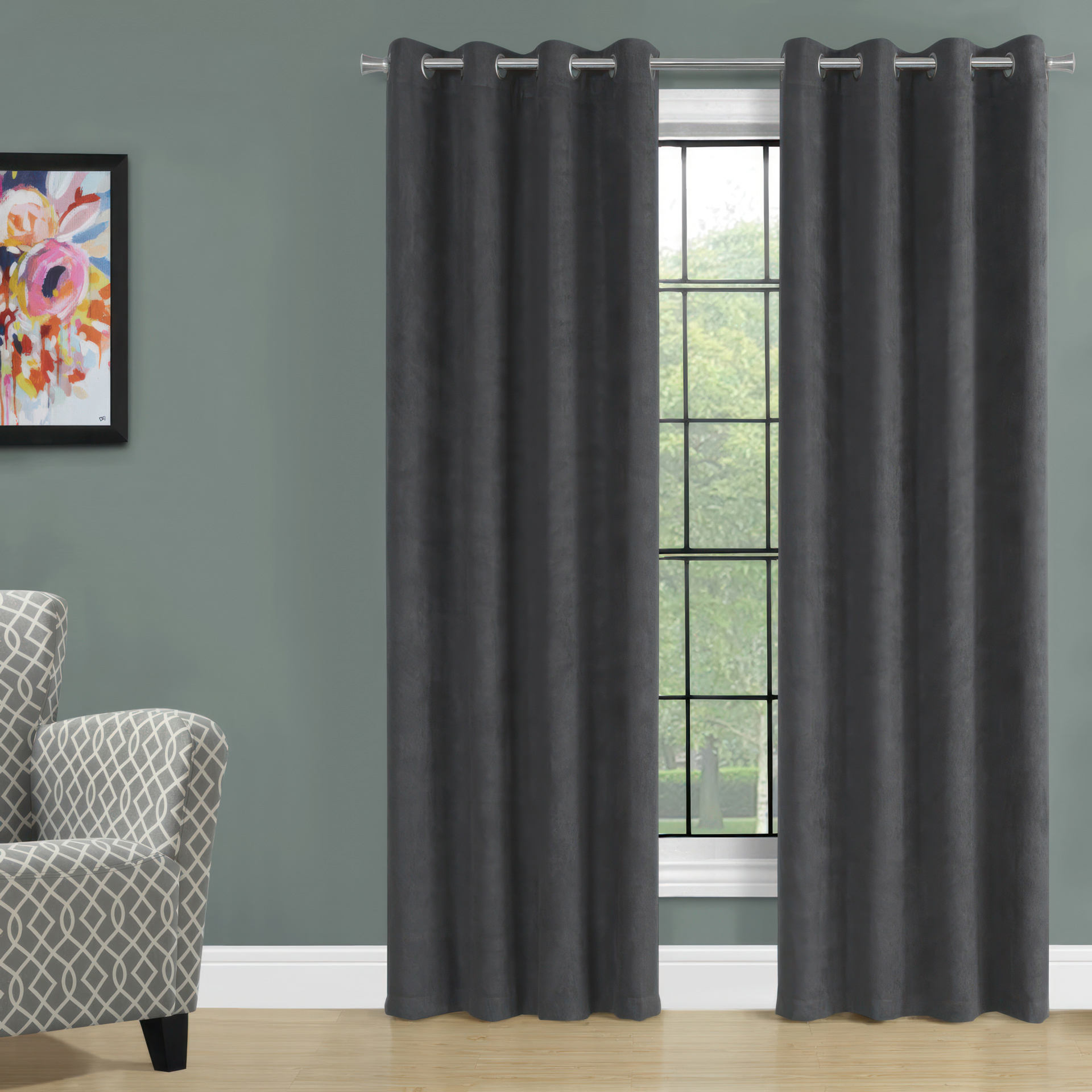 Cet ensemble de 2 rideaux grises aux lignes épurées peut être placé dans un salon, une chambre ou une salle à manger.