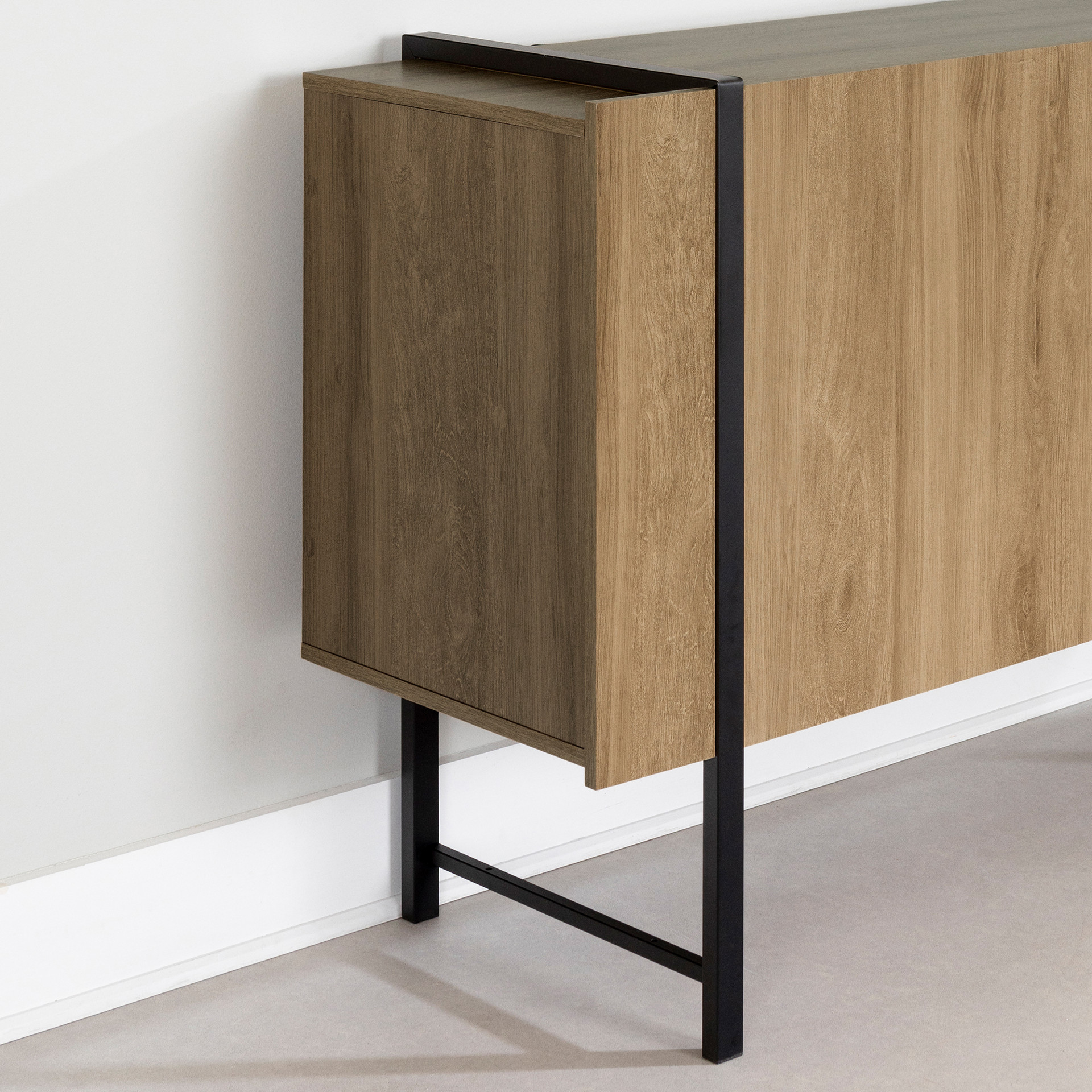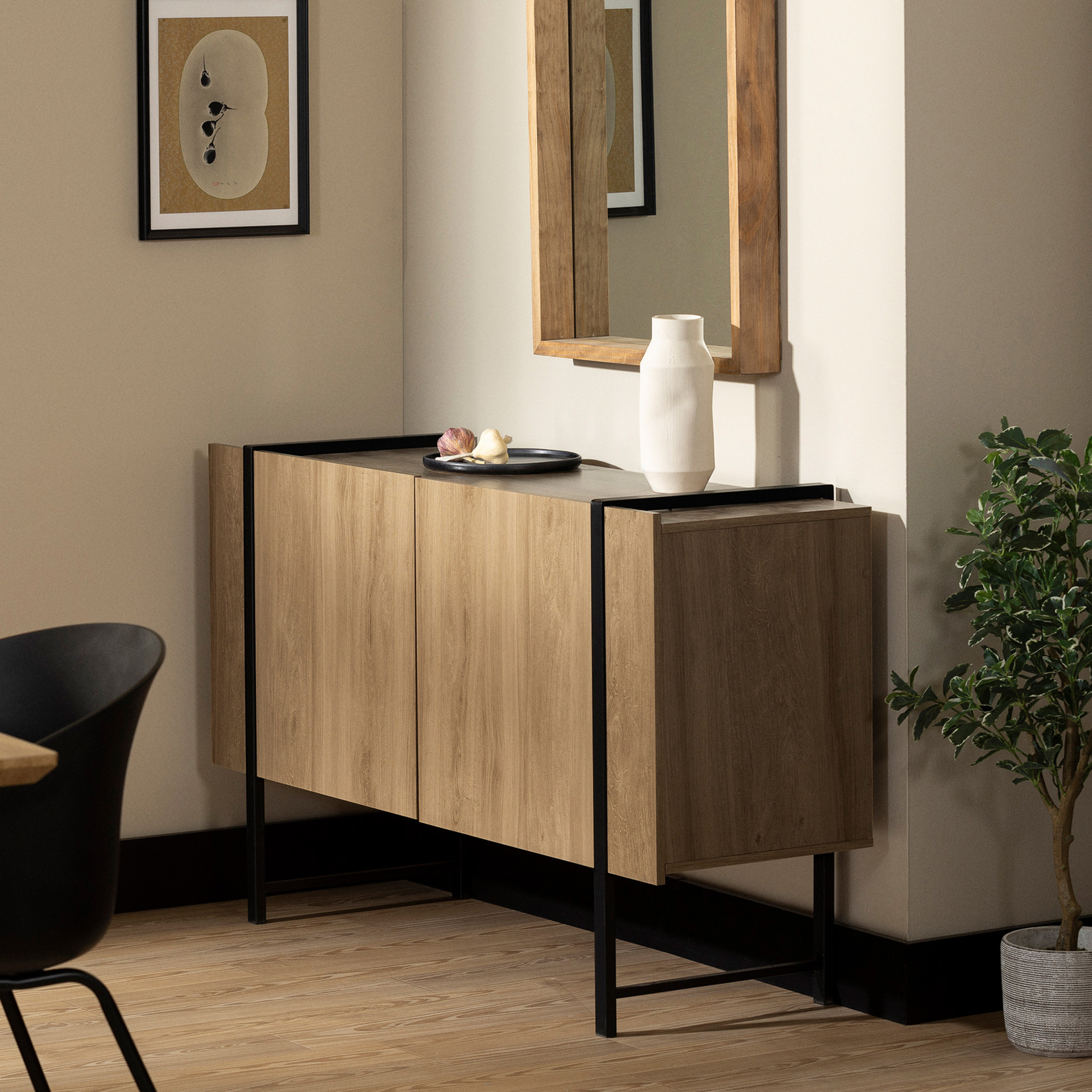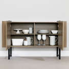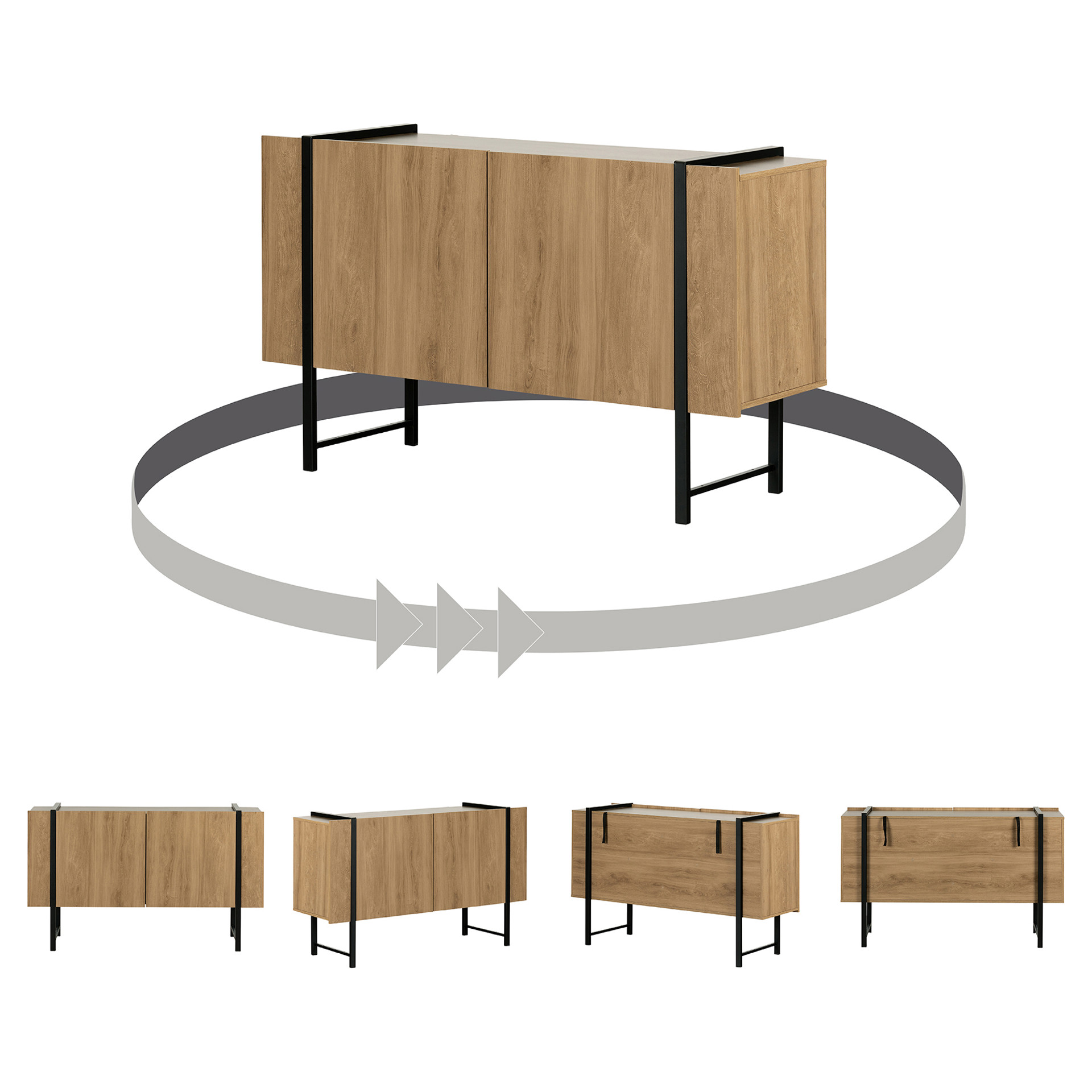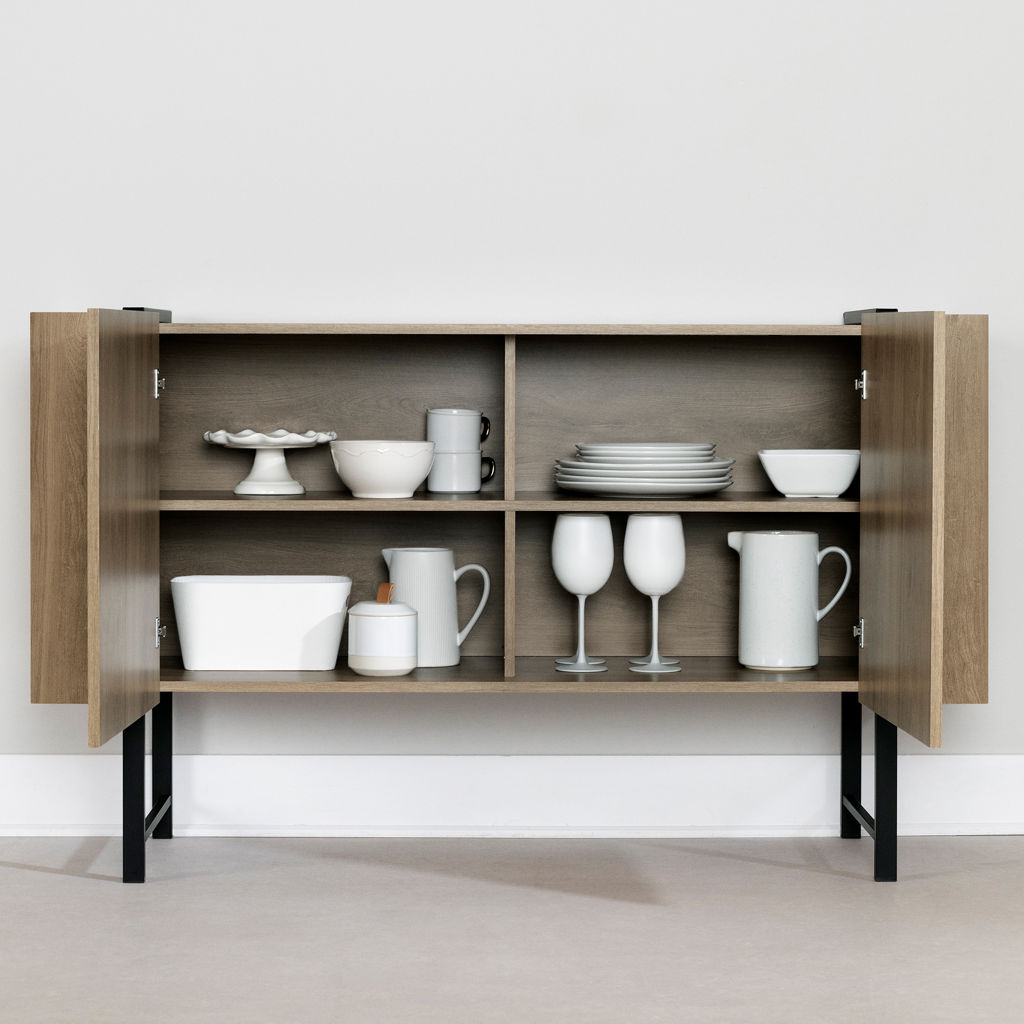 L´allure de ce buffet est largement inspirée du style moderne urbain, caractérisé par son influence citadine et sa petite touche industrielle. Les pattes noires carrées en métal contournent entièrement le meuble, respectant parfaitement le caractère net et recherché de cette tendance contemporaine. Ainsi, que vous soyez au coeur de la ville ou en banlieue, vous parviendrez à optimiser votre espace tout en profitant d´une solution de rangement élégante. En effet, le buffet peut être adossé à un mur ou placé au centre d´une pièce, puisque le dos est entièrement fini.