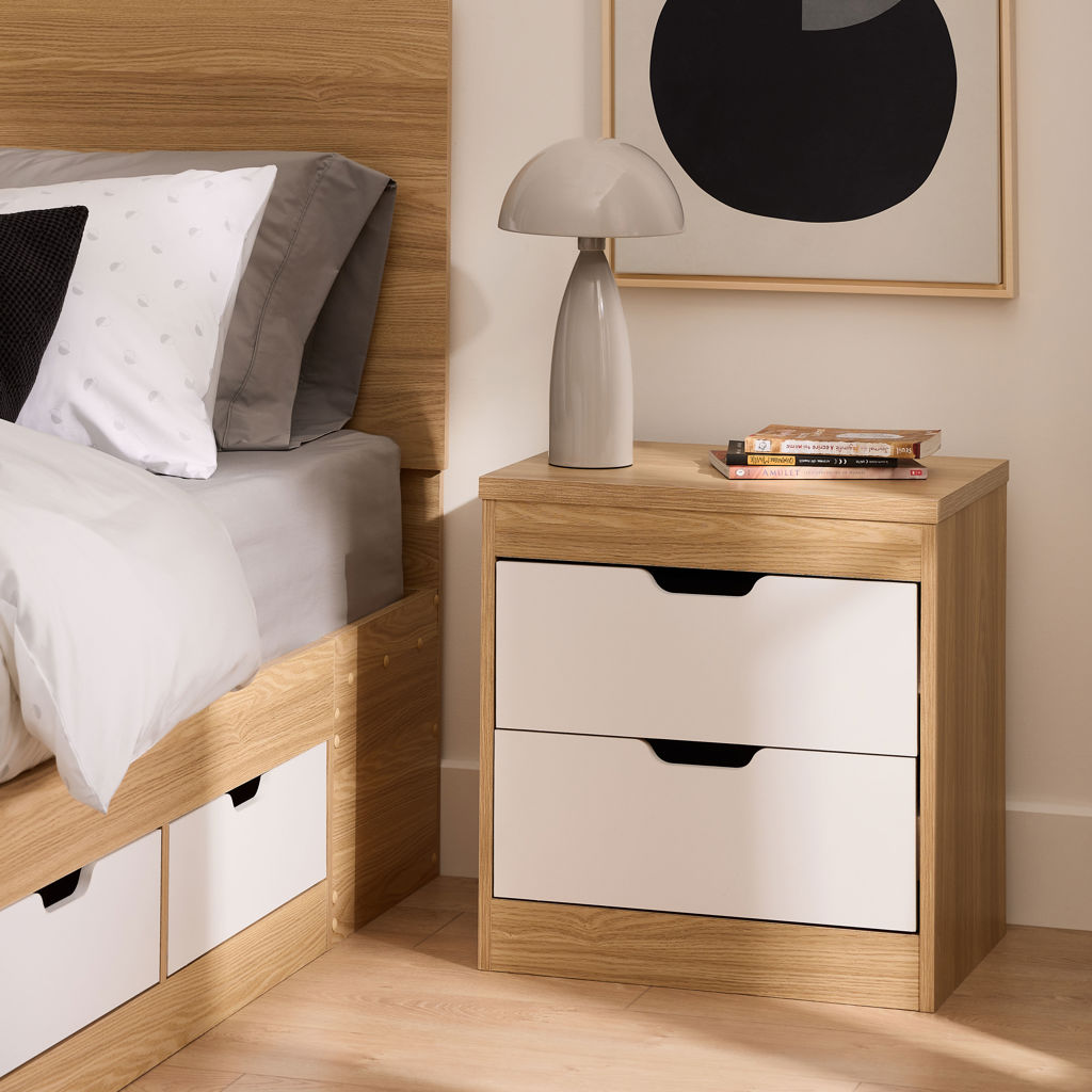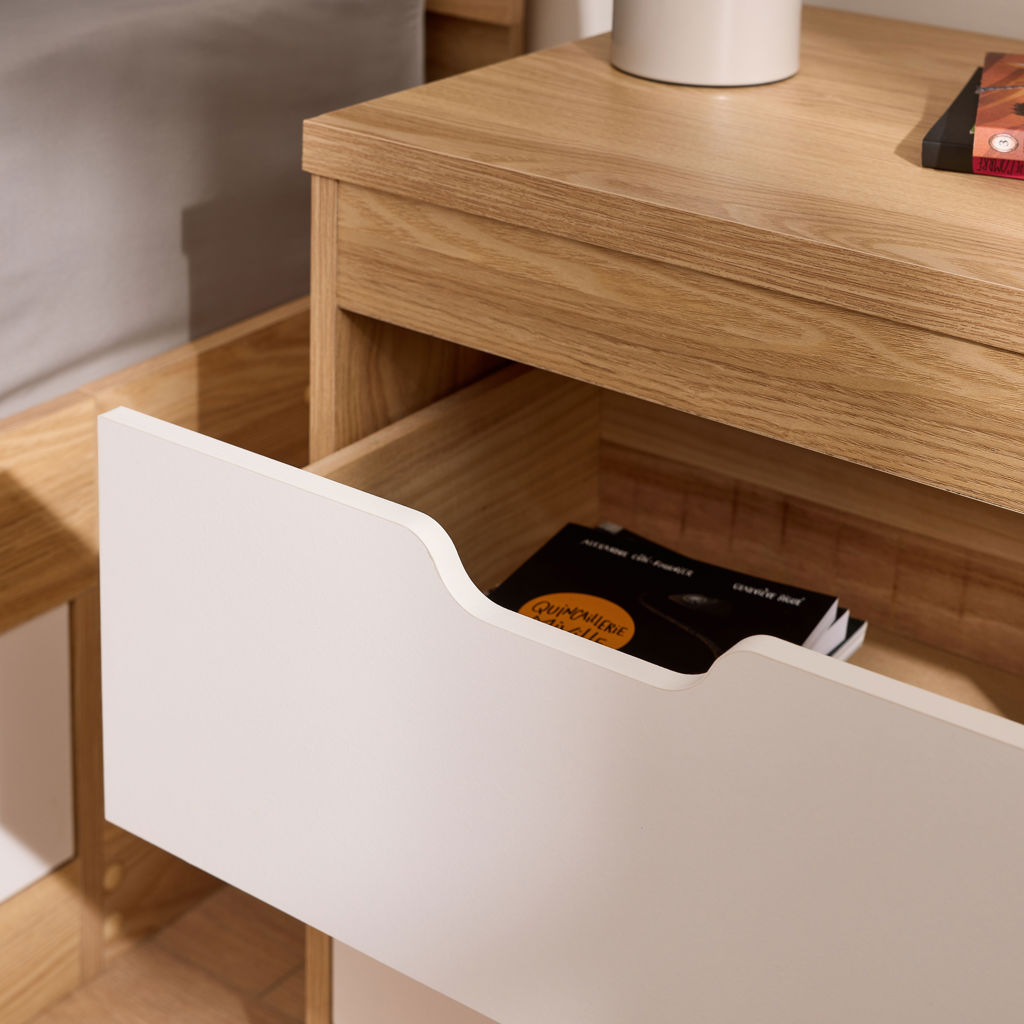 Compacte et fonctionnelle, cette table de chevet s'intègre naturellement à votre chambre. Ses deux tiroirs spacieux offrent un rangement discret pour vos essentiels du quotidien : livre en cours, lunettes, chargeur ou petits objets personnels.