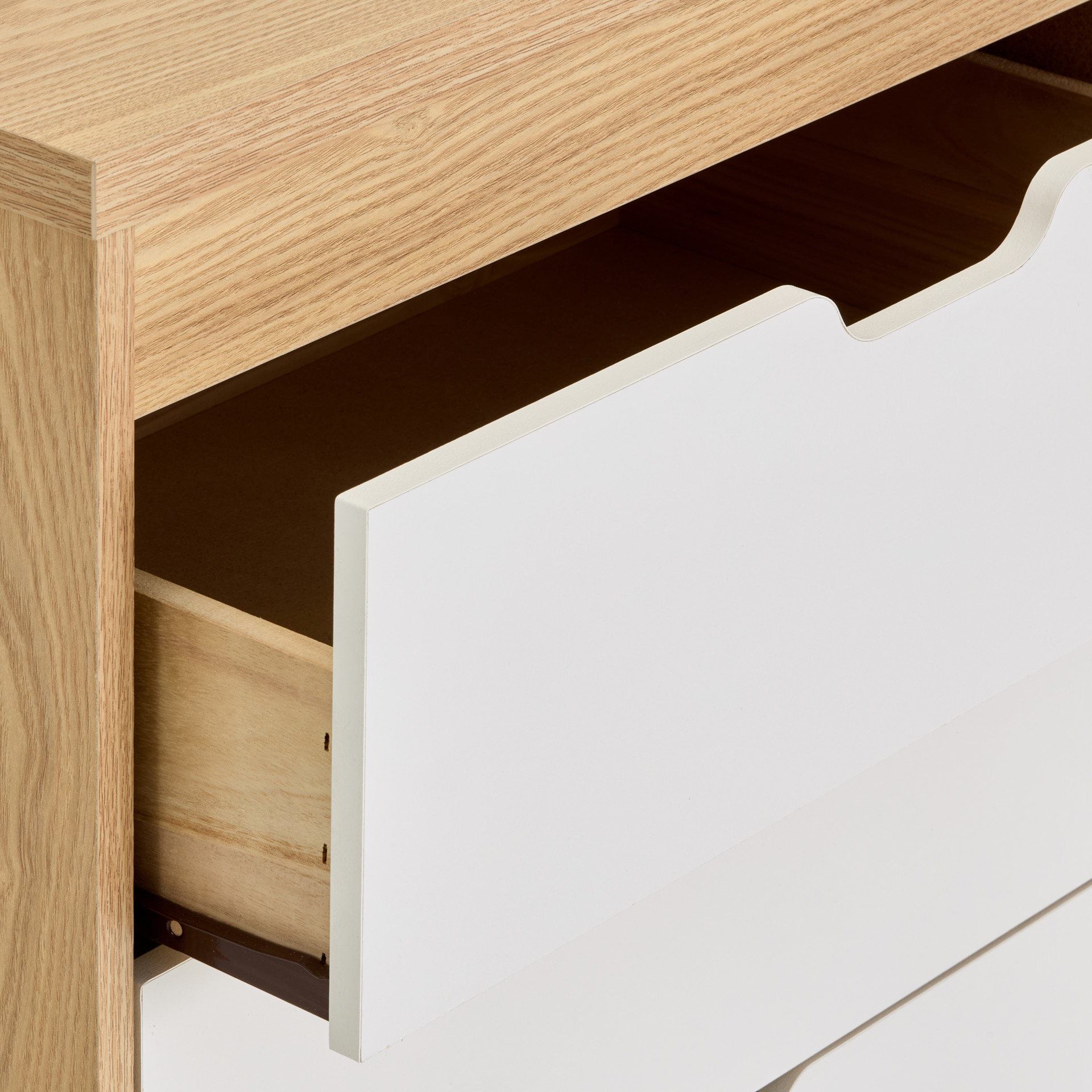 La finition bicolore crée un effet visuel harmonieux qui s'adapte facilement à votre décor. Les poignées discrètes facilitent l'ouverture, même dans la pénombre. Sa construction en mélamine assure durabilité et entretien facile - un simple coup de chiffon suffit.