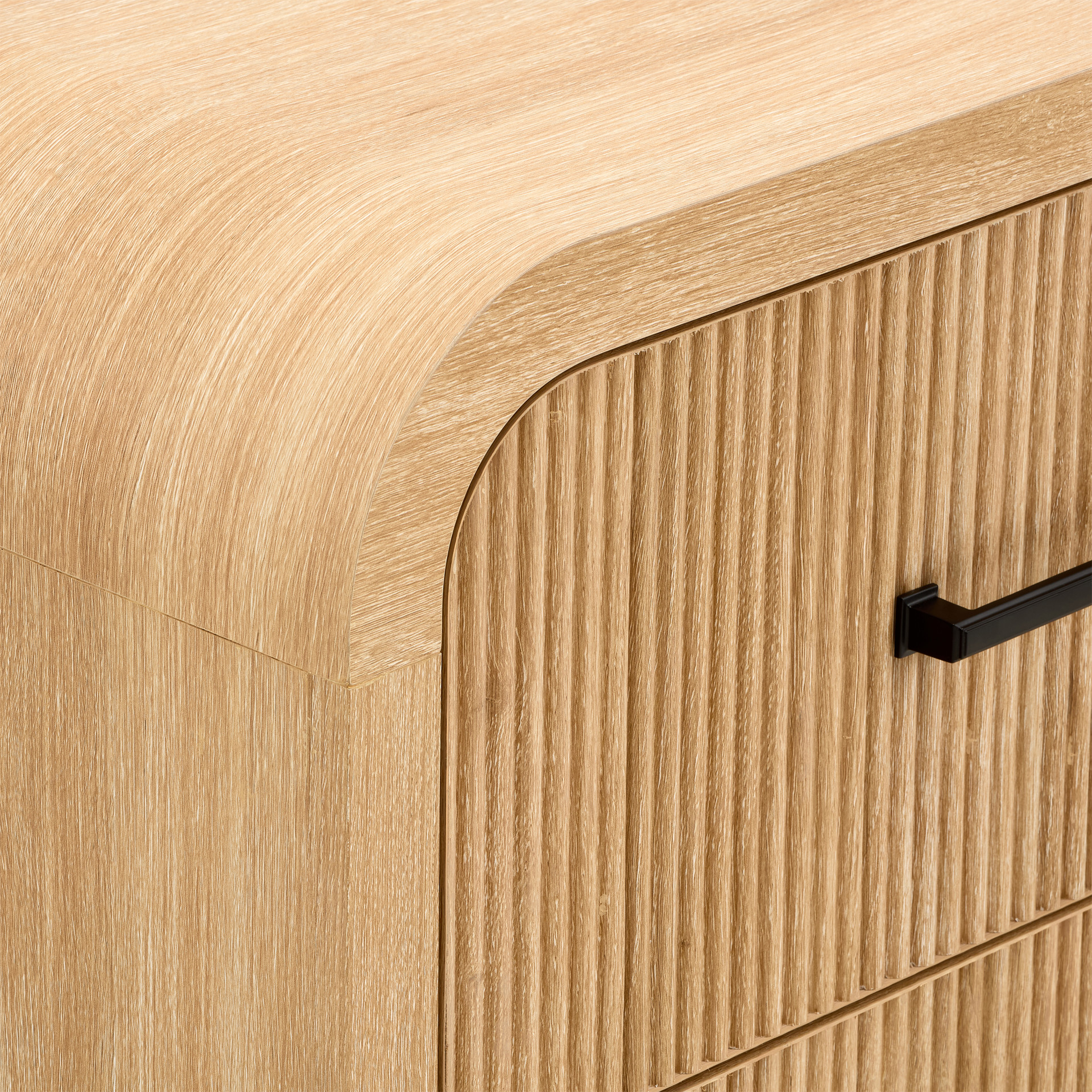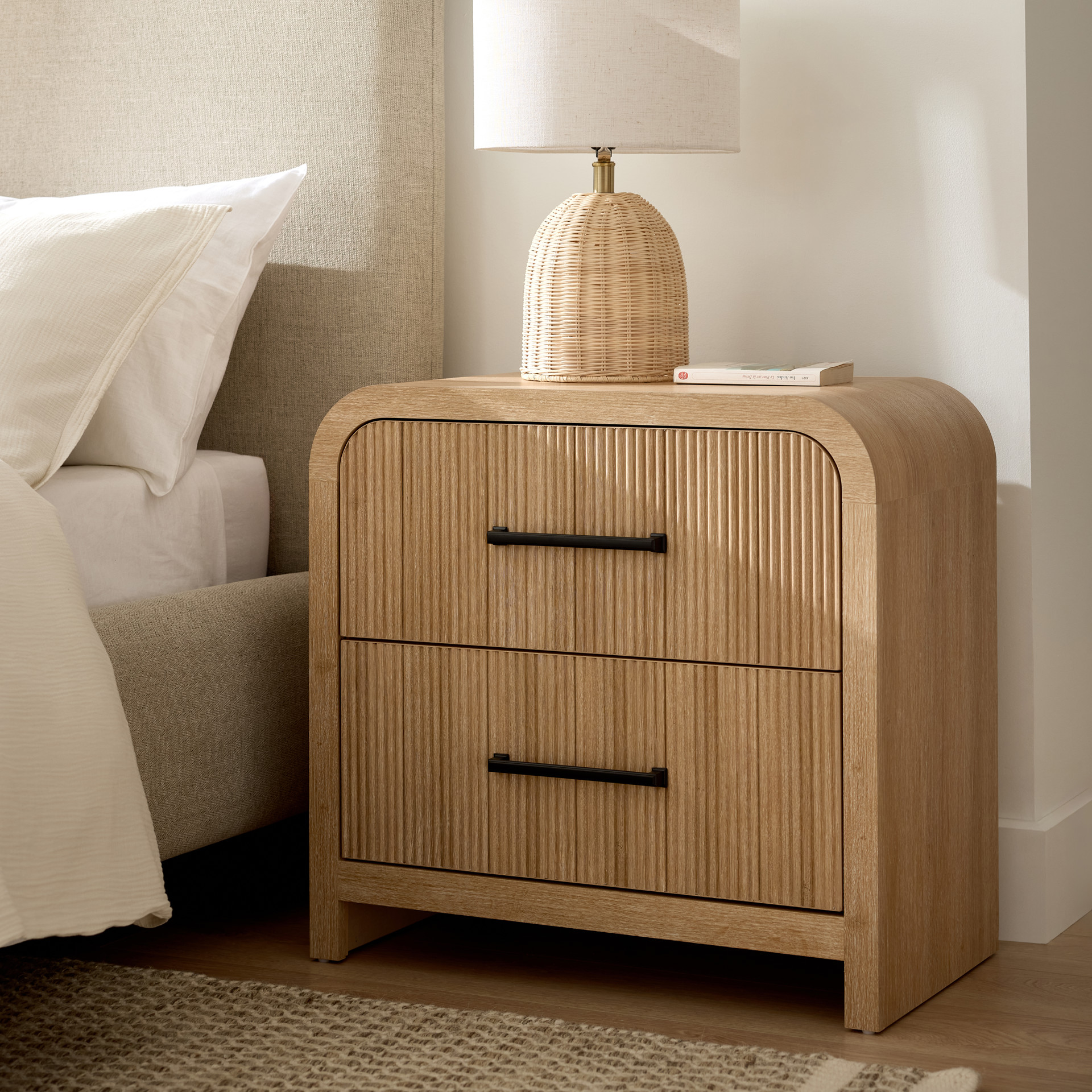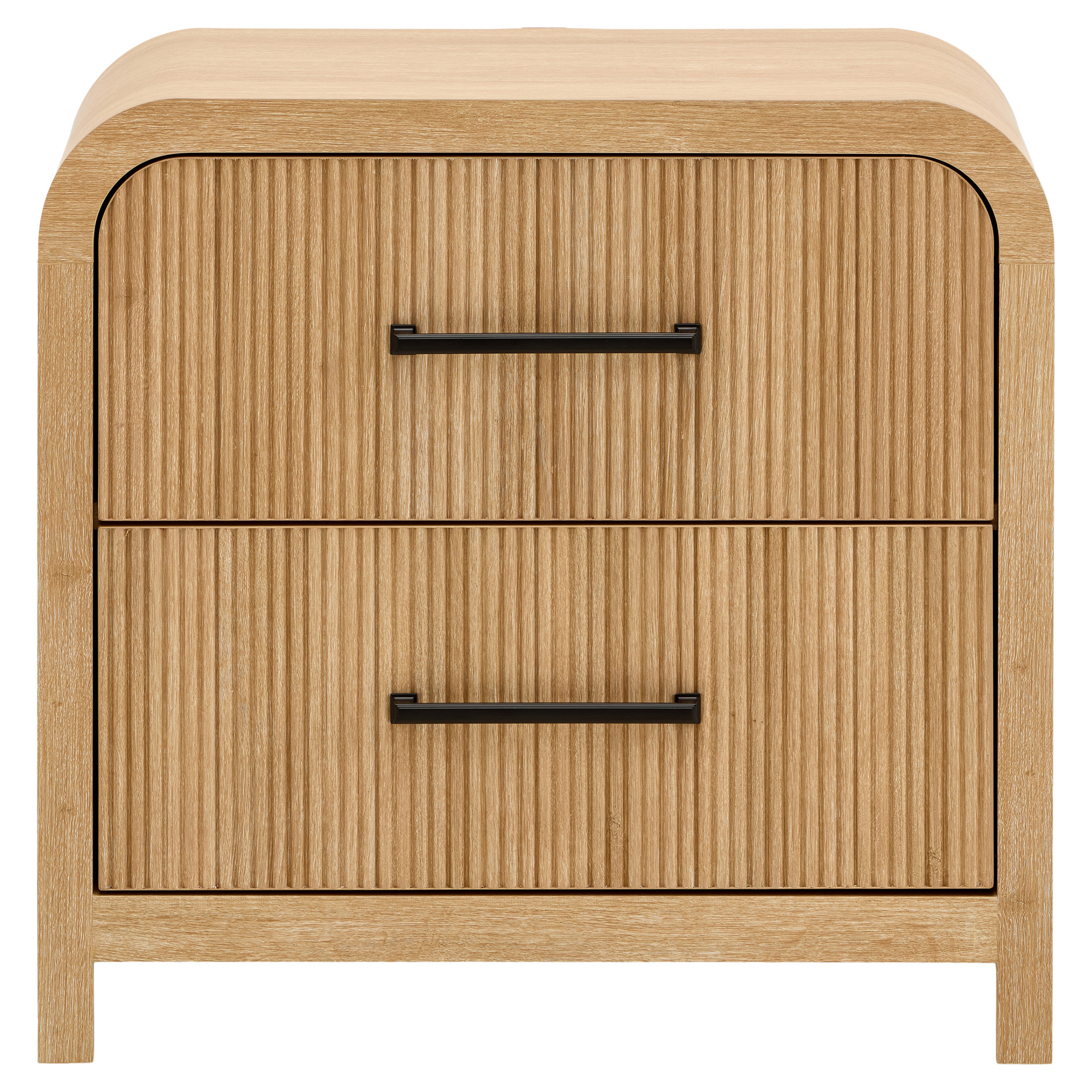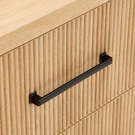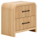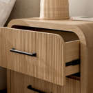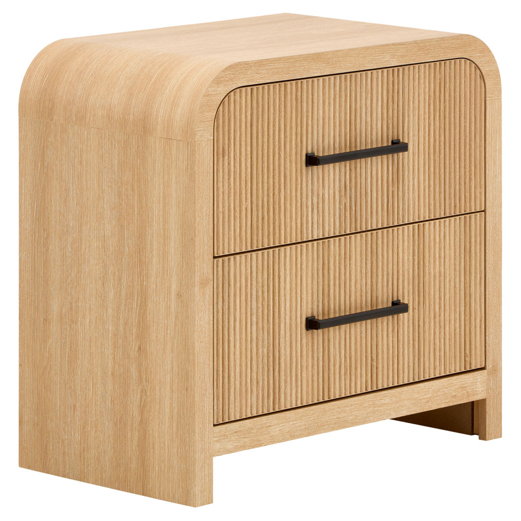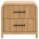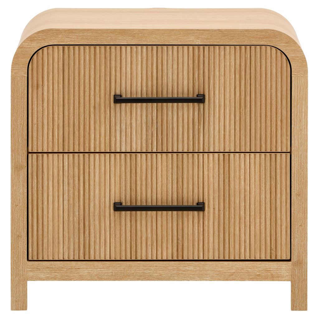Dotée de glissières de tiroirs à roulement à billes pour un fonctionnement en douceur et d'un placage en papier pour une finition sophistiquée, cette table de chevet se distingue par ses panneaux nervurés et ses élégantes ferrures en métal noir.