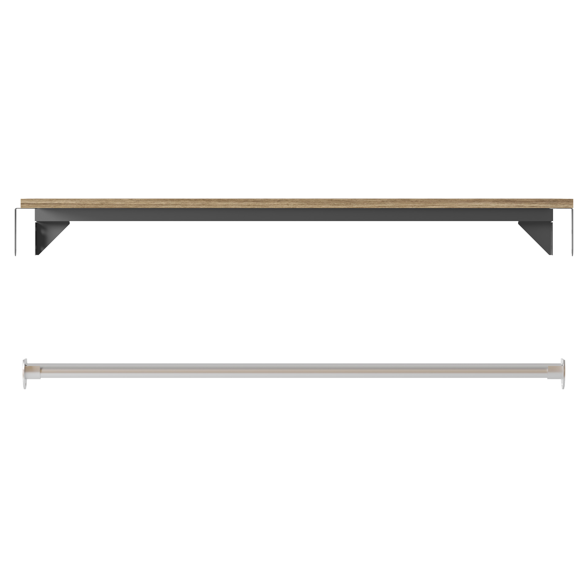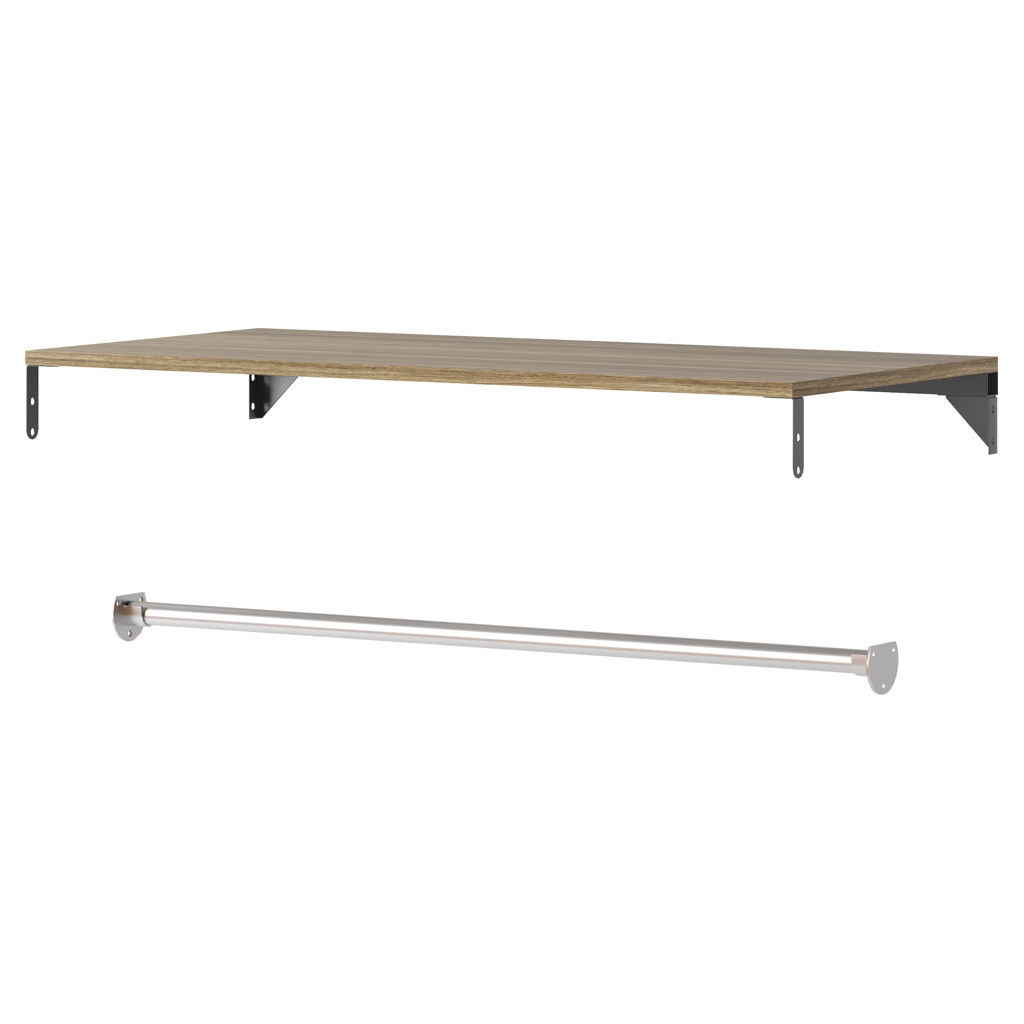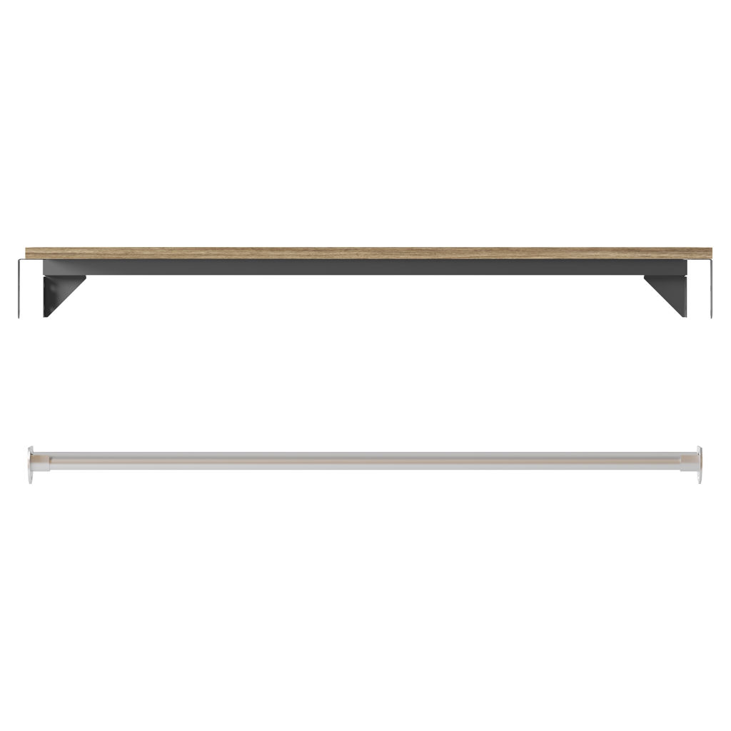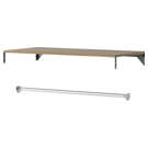 La finition noyer chaleureuse et accueillante de l'étagère associée au poteau en nickel brossé rehausse n'importe quel placard.