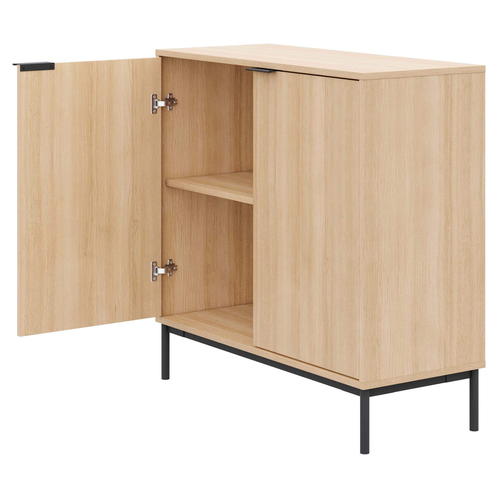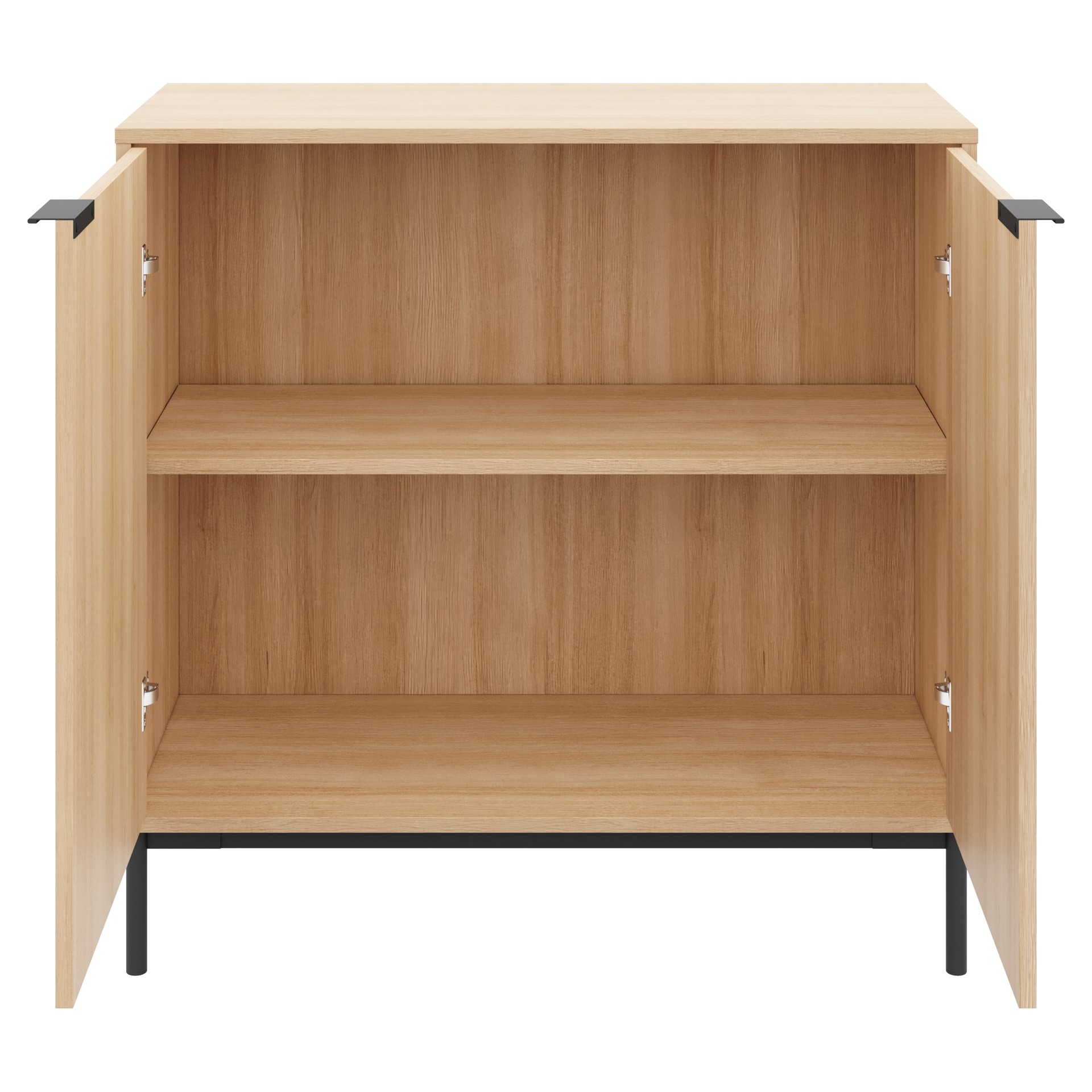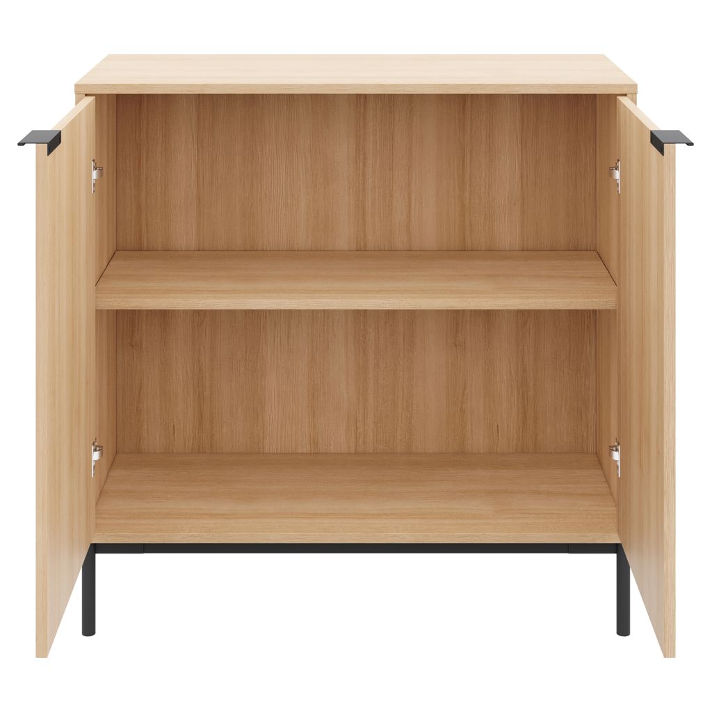 Derrière les portes à fermeture douce, deux tablettes permettent de ranger vos essentiels du quotidien, à l'abri des regards.