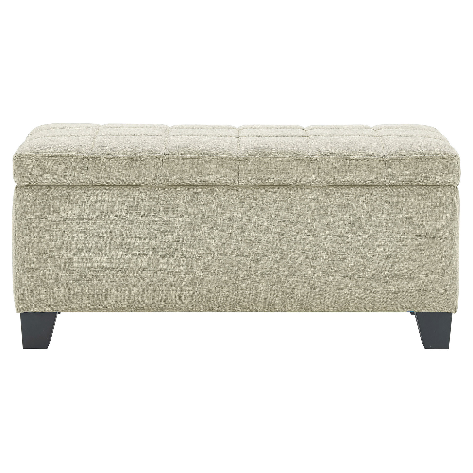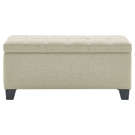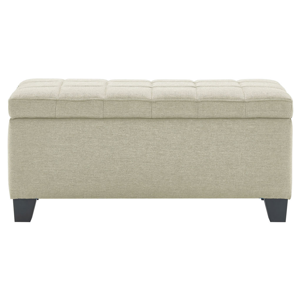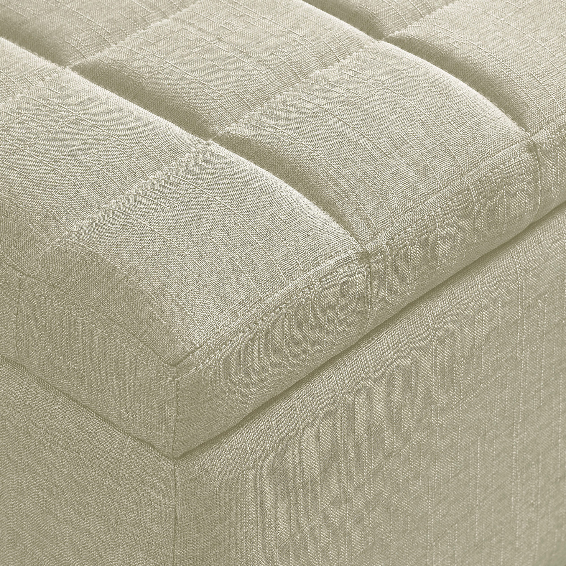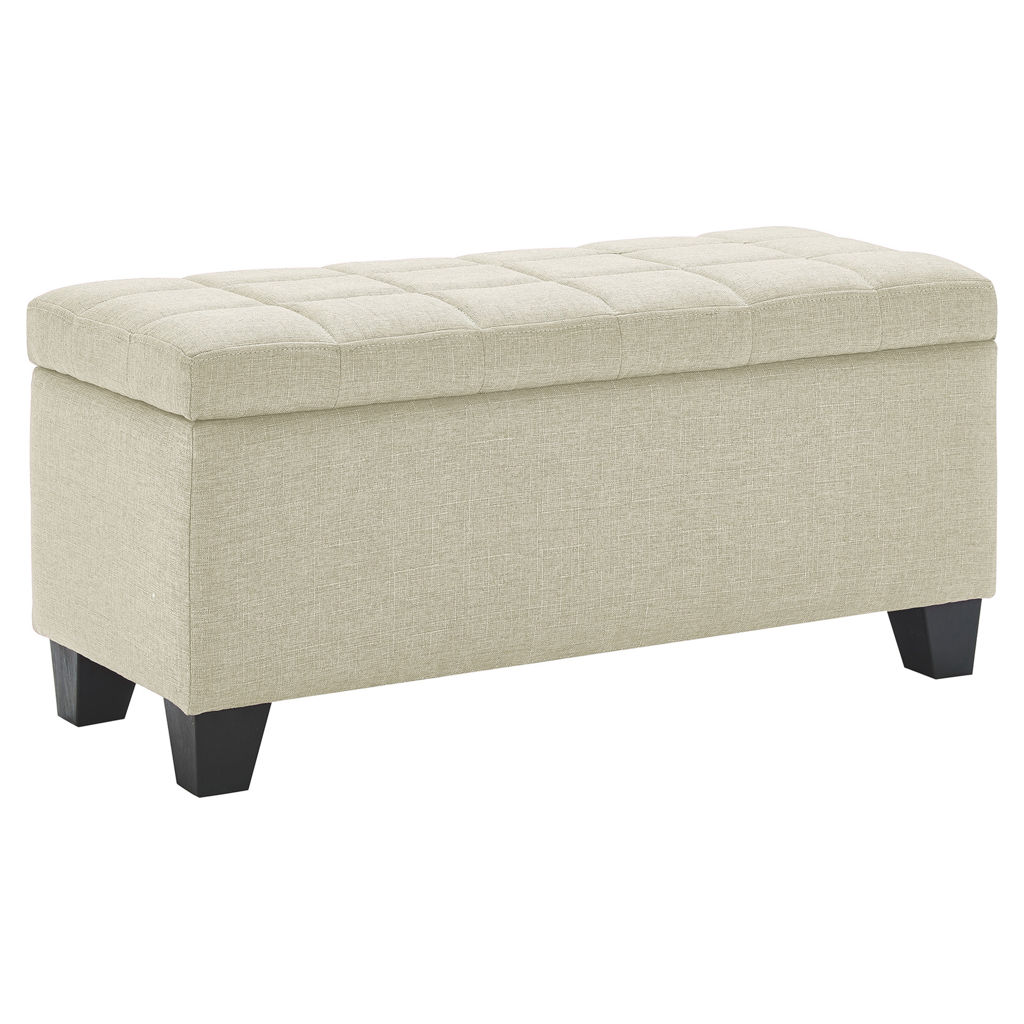 L'atout majeur? Son espace de rangement dissimulé qui vous permet d'organiser discrètement couvertures, oreillers, jouets ou tout autre objet du quotidien. Les solides pieds en bois foncé assurent une stabilité parfaite, que vous l'installiez au pied du lit, dans l'entrée ou au salon.