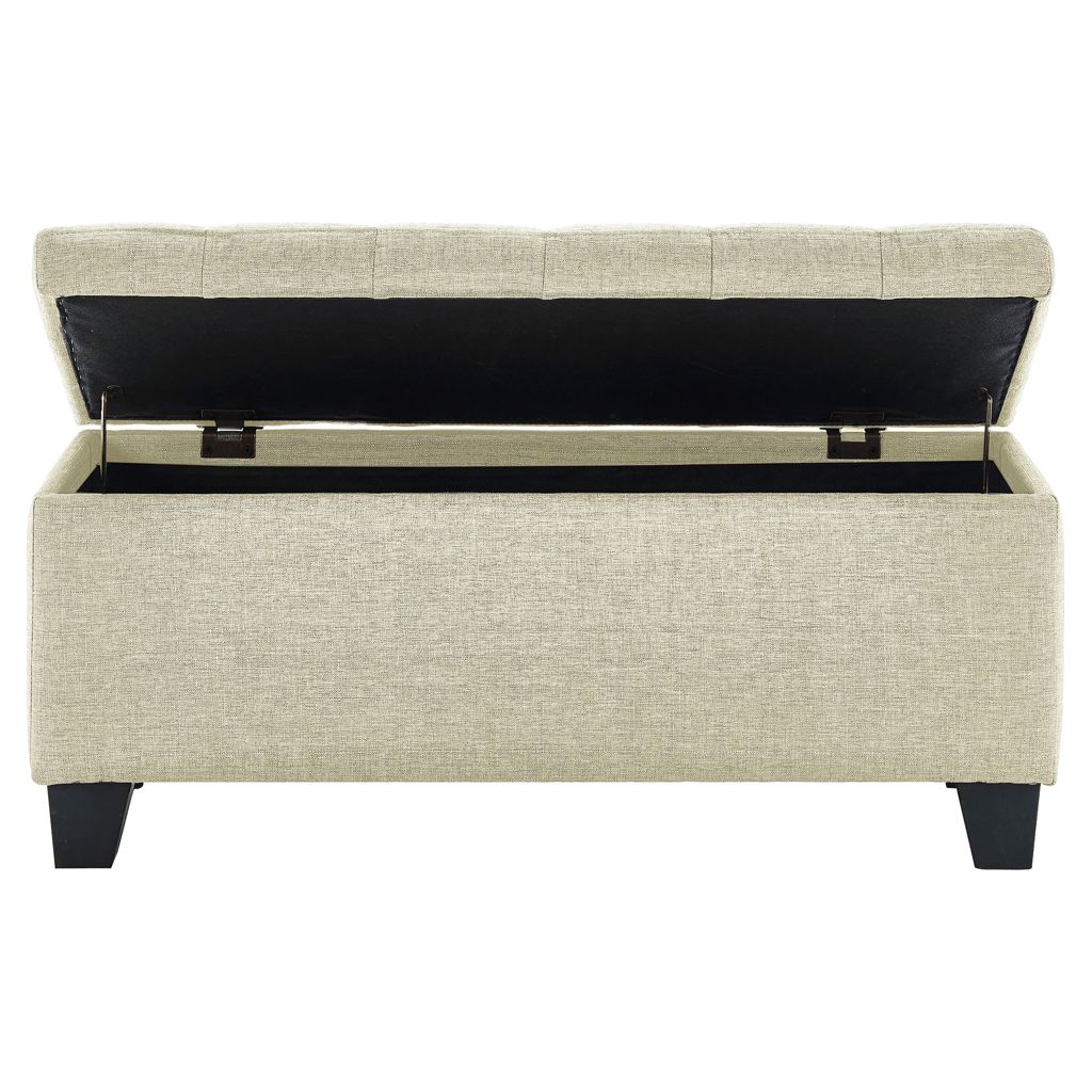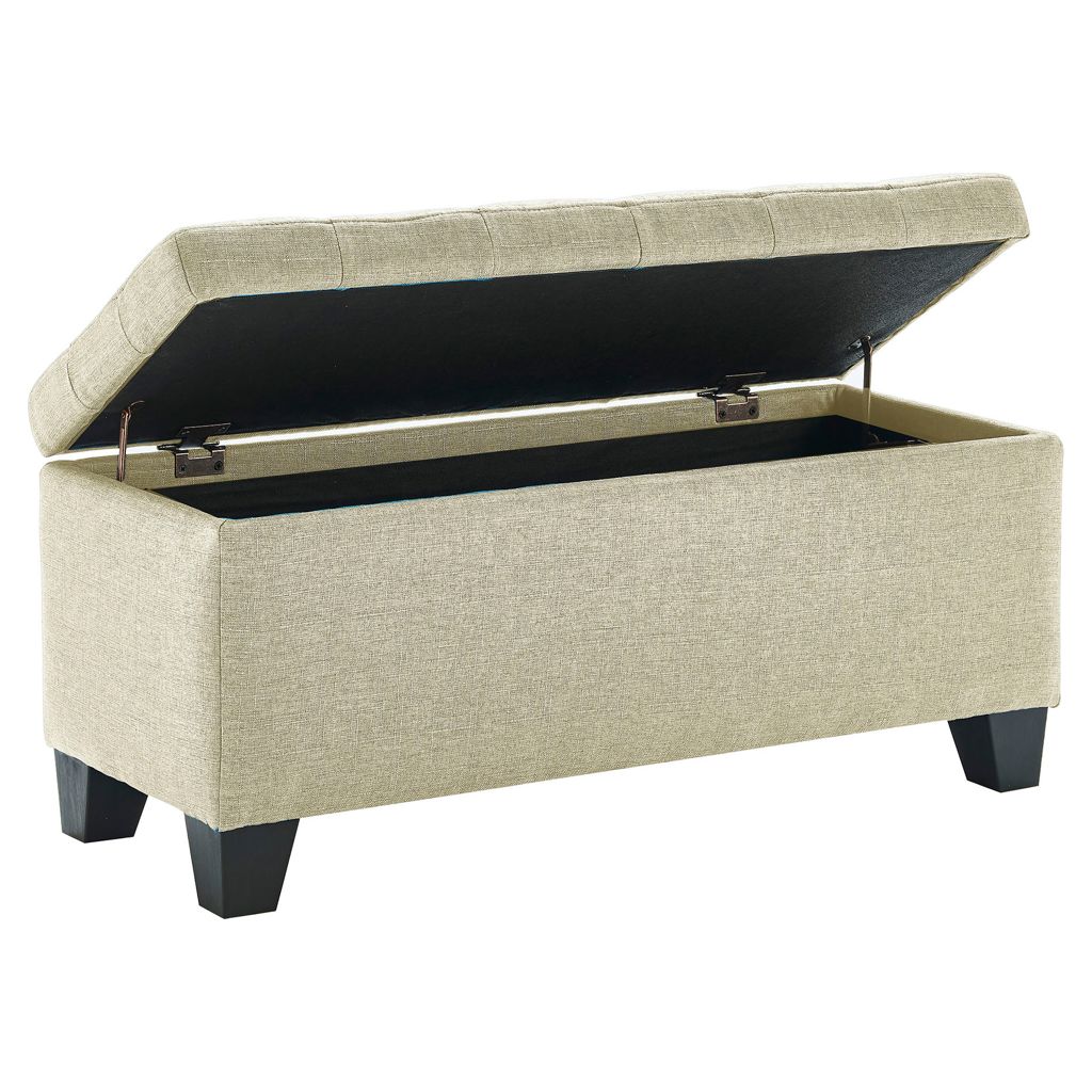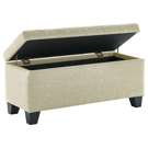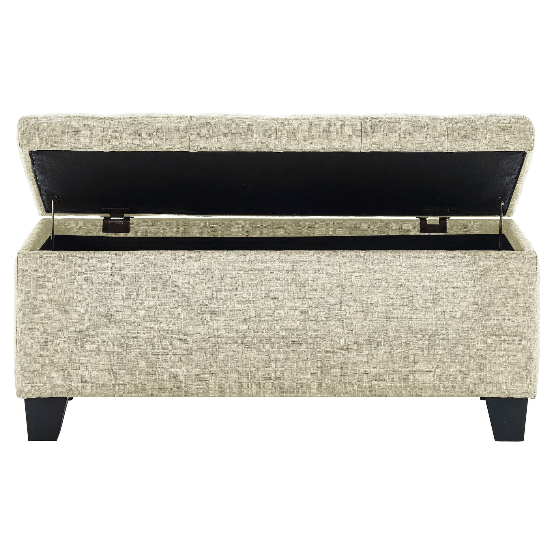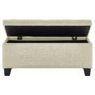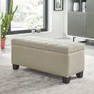 L'atout majeur? Son espace de rangement dissimulé qui vous permet d'organiser discrètement couvertures, oreillers, jouets ou tout autre objet du quotidien. Les solides pieds en bois foncé assurent une stabilité parfaite, que vous l'installiez au pied du lit, dans l'entrée ou au salon.