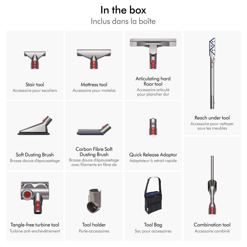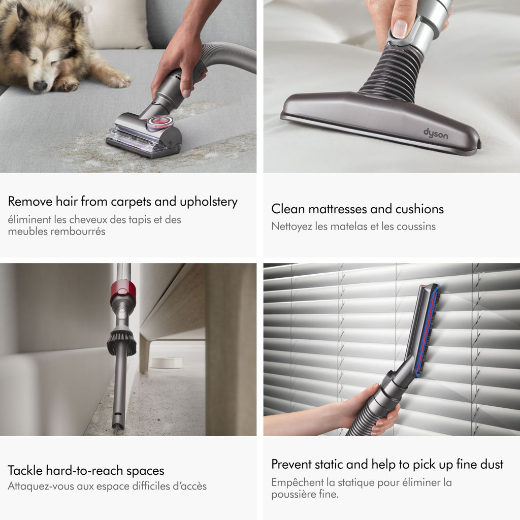 L’aspirateur-traîneau Dyson Big Ball Total Clean est conçu pour un nettoyage puissant, complet et minutieux de toute la maison. Sa tête d’aspirateur concentre la puissance d’aspiration pour ramasser efficacement la saleté sur tous les types de planchers. Il comprend un accessoire combiné, un accessoire pour escaliers, une brosse douce d’époussetage en fibre de carbone, une brosse douce d’époussetage, un accessoire articulé pour planchers durs, une tête d’aspirateur anti-enchevêtrement, un accessoire pour matelas, un accessoire pour nettoyer sous les meubles, un adaptateur à dégagement rapide, un porte-accessoires et un sac pour accessoires.