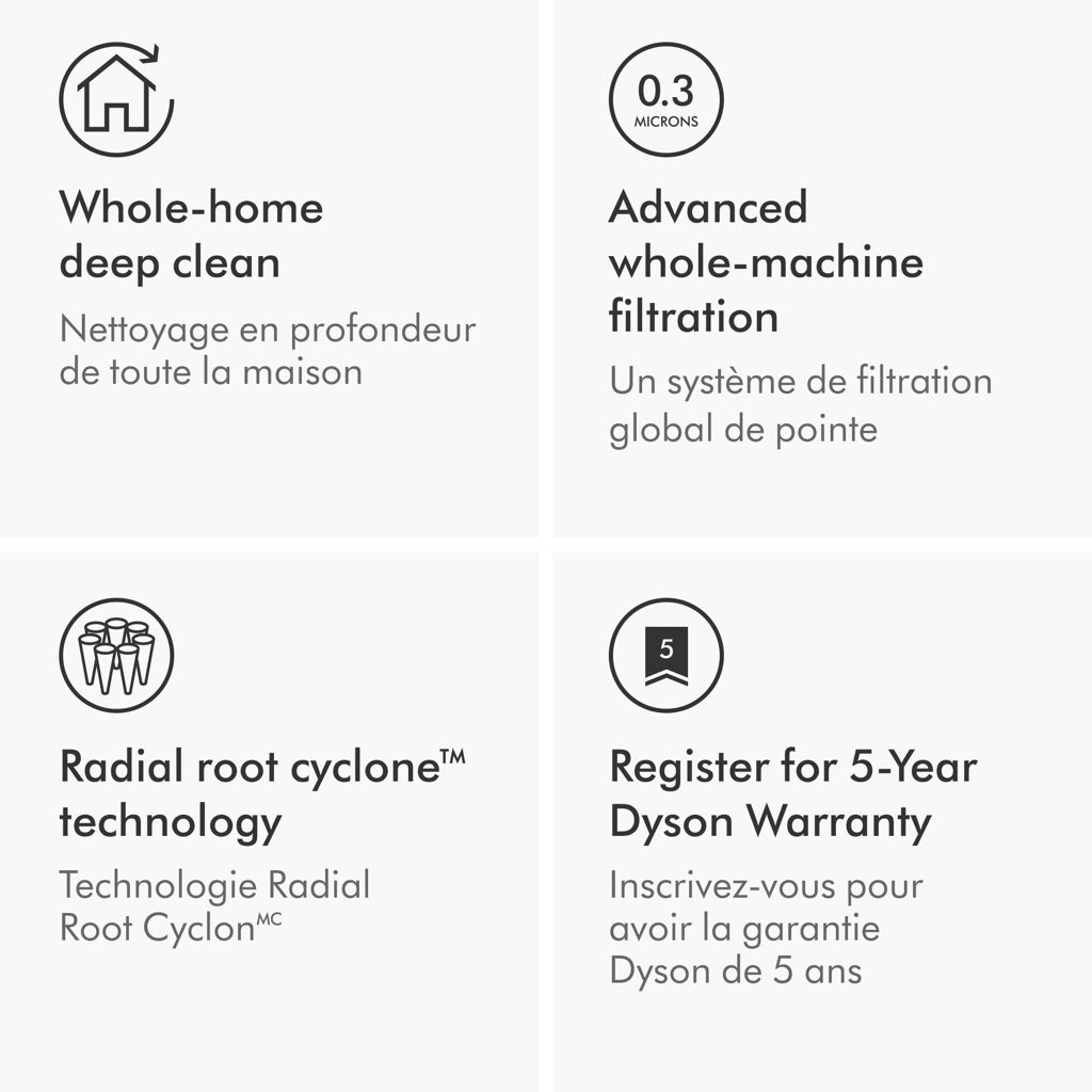 • Il est couvert par une garantie de 5 ans et son propriétaire bénéficie du service d’assistance de Dyson pendant toute la durée de vie de l’appareil