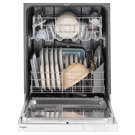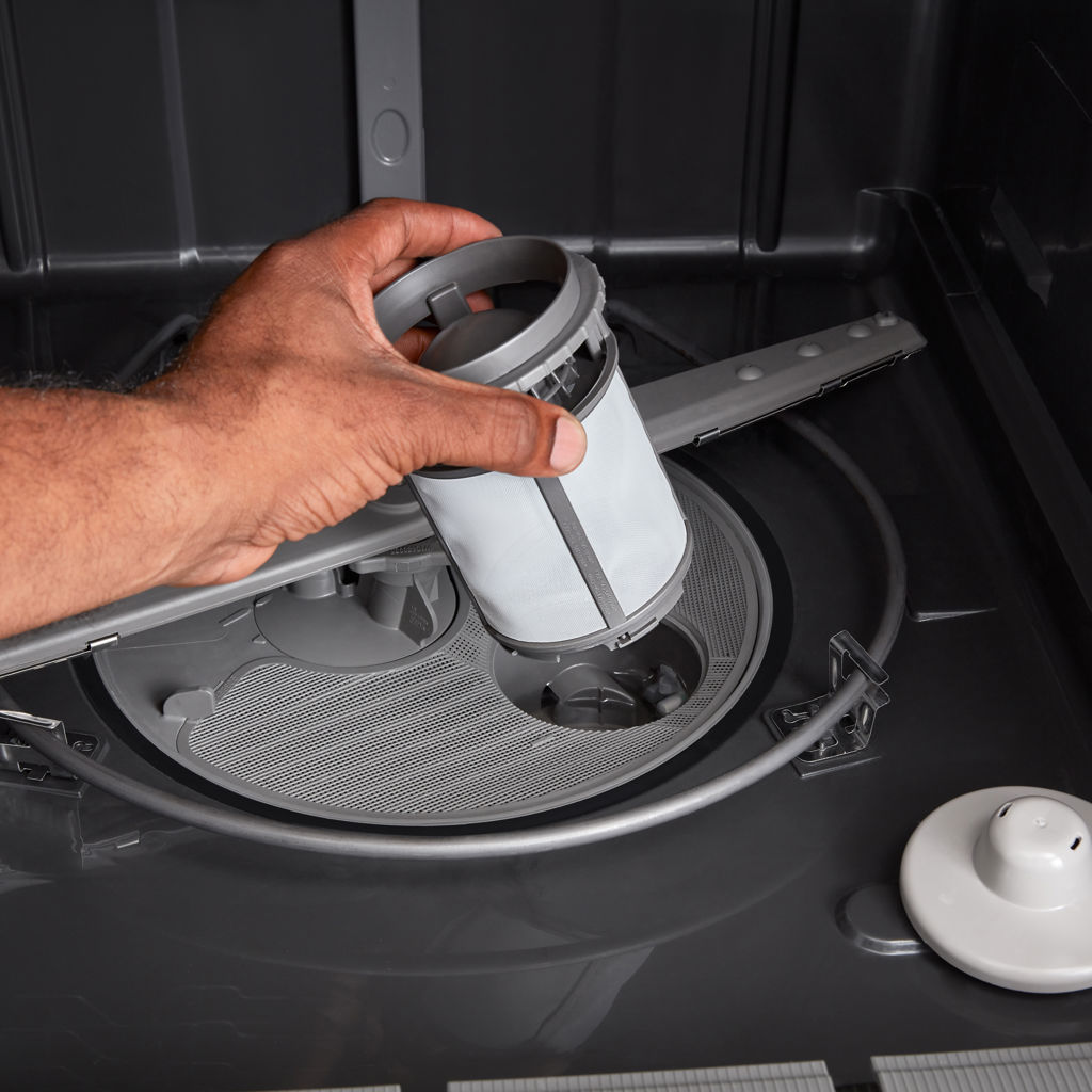 Une cuve hybride avec intérieur gris foncé aide à masquer les taches de nourriture avec une porte intérieure en acier inoxydable et une cuve en plastique gris foncé.