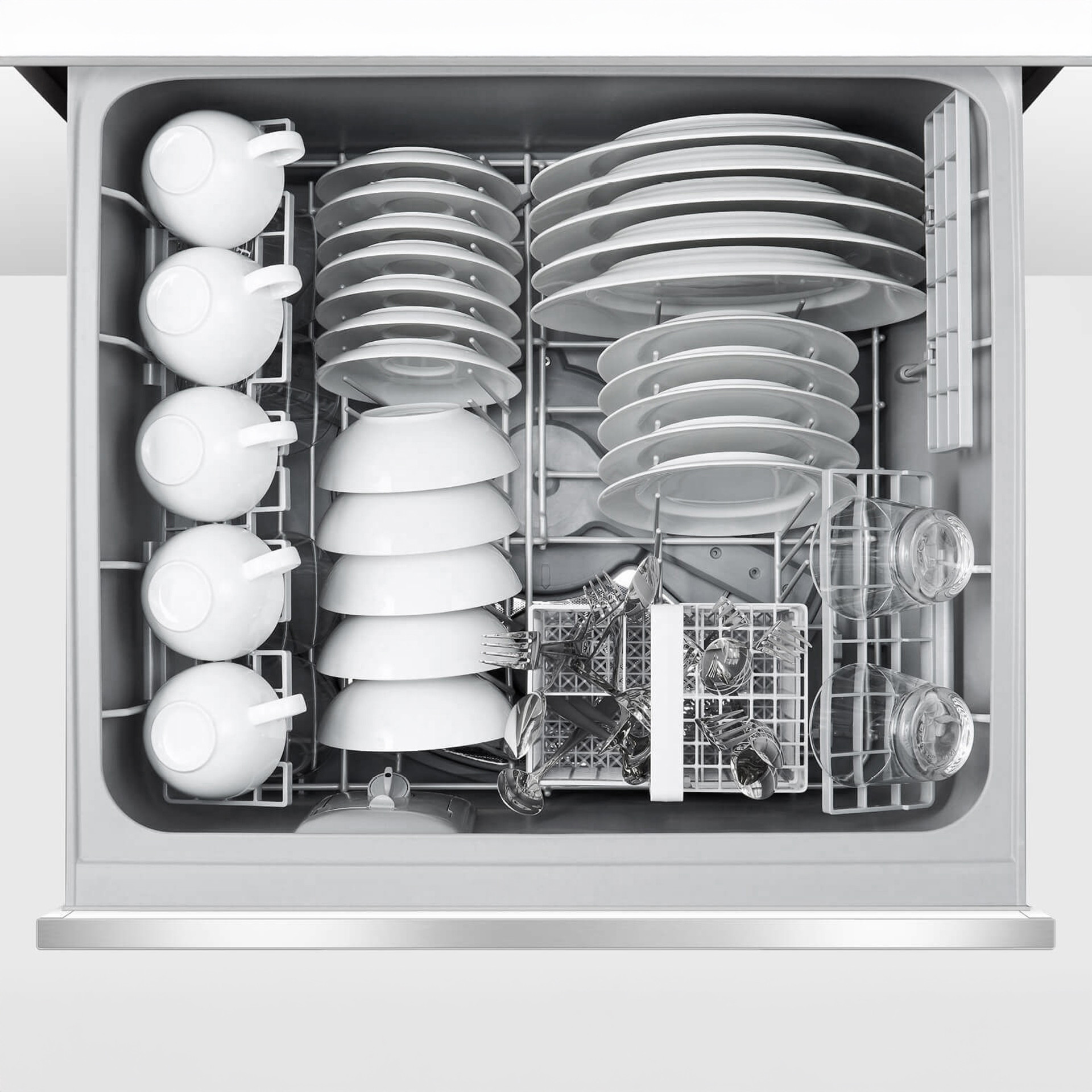 Les lave-vaisselle DishDrawer s’utilisent facilement grâce à leurs tiroirs à fermeture douce. Le grand tiroir peut contenir vos plus grandes assiettes mesurant jusqu’à 12 1/4 po, alors que le tiroir inférieur est parfait pour les petits lavages. Les paniers à chargement flexible incluent un support à hauteur ajustable pour les verres et des supports pour les verres à vin.