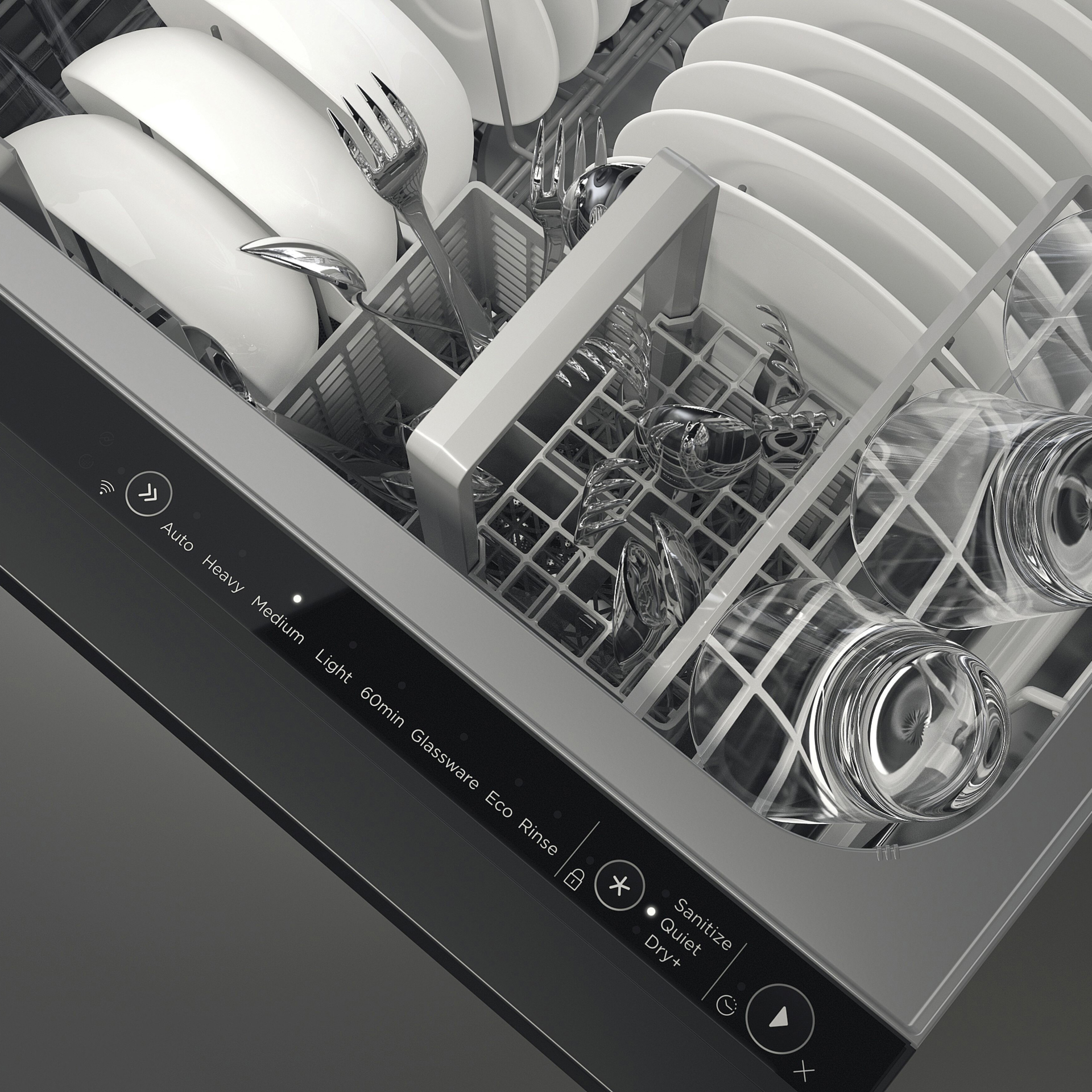 Huit programmes de lavage, dont Auto, 60 minutes et Verrerie, tandis que des modificateurs tels que Sanitize, Dry+ et Quiet offrent une flexibilité de lavage supplémentaire. Le modificateur de lavage silencieux réduit le bruit sur certains cycles tout en conservant les performances – parfait pour le lavage de fin de soirée.