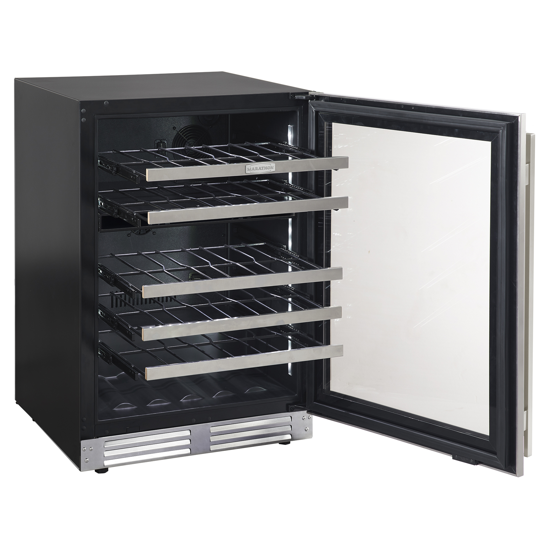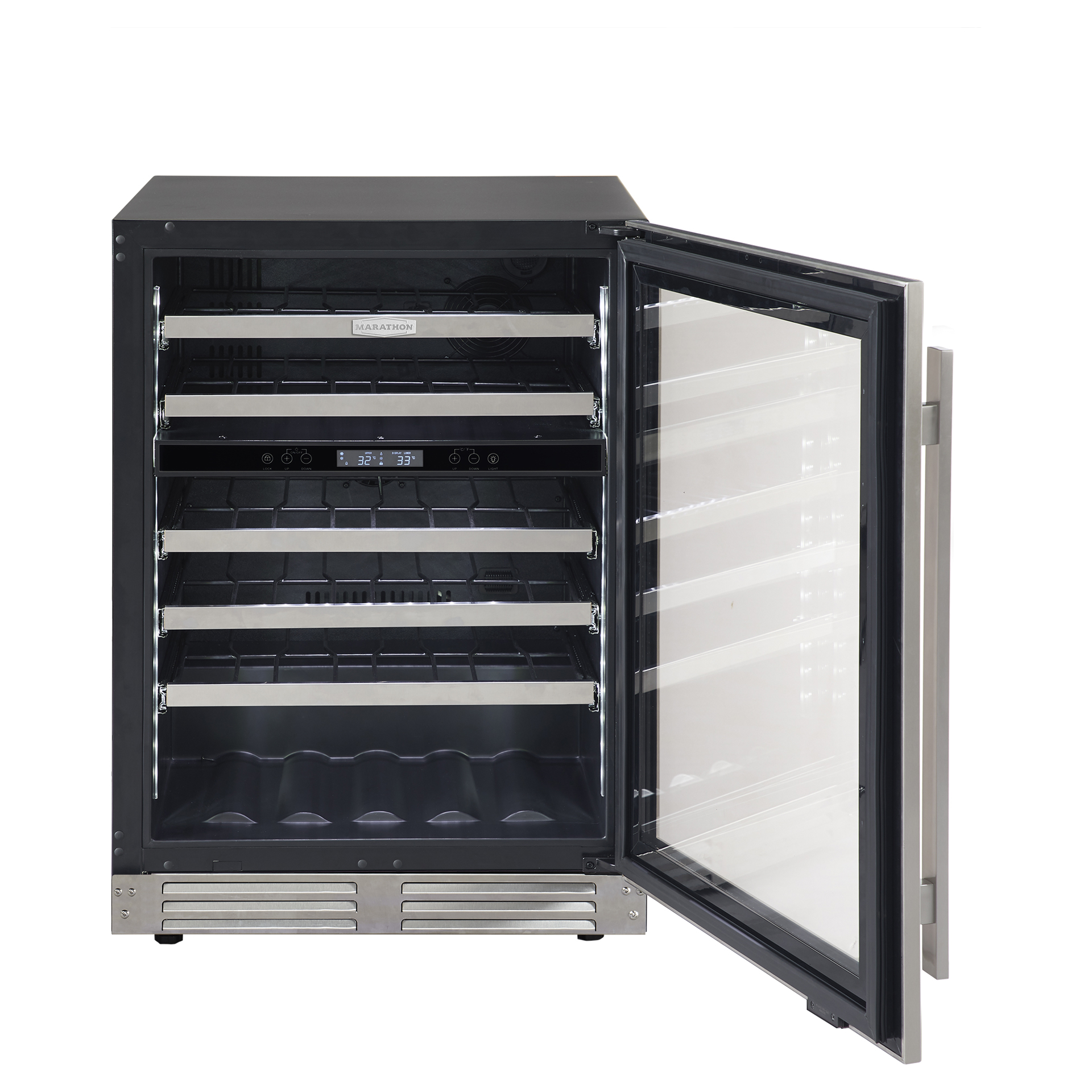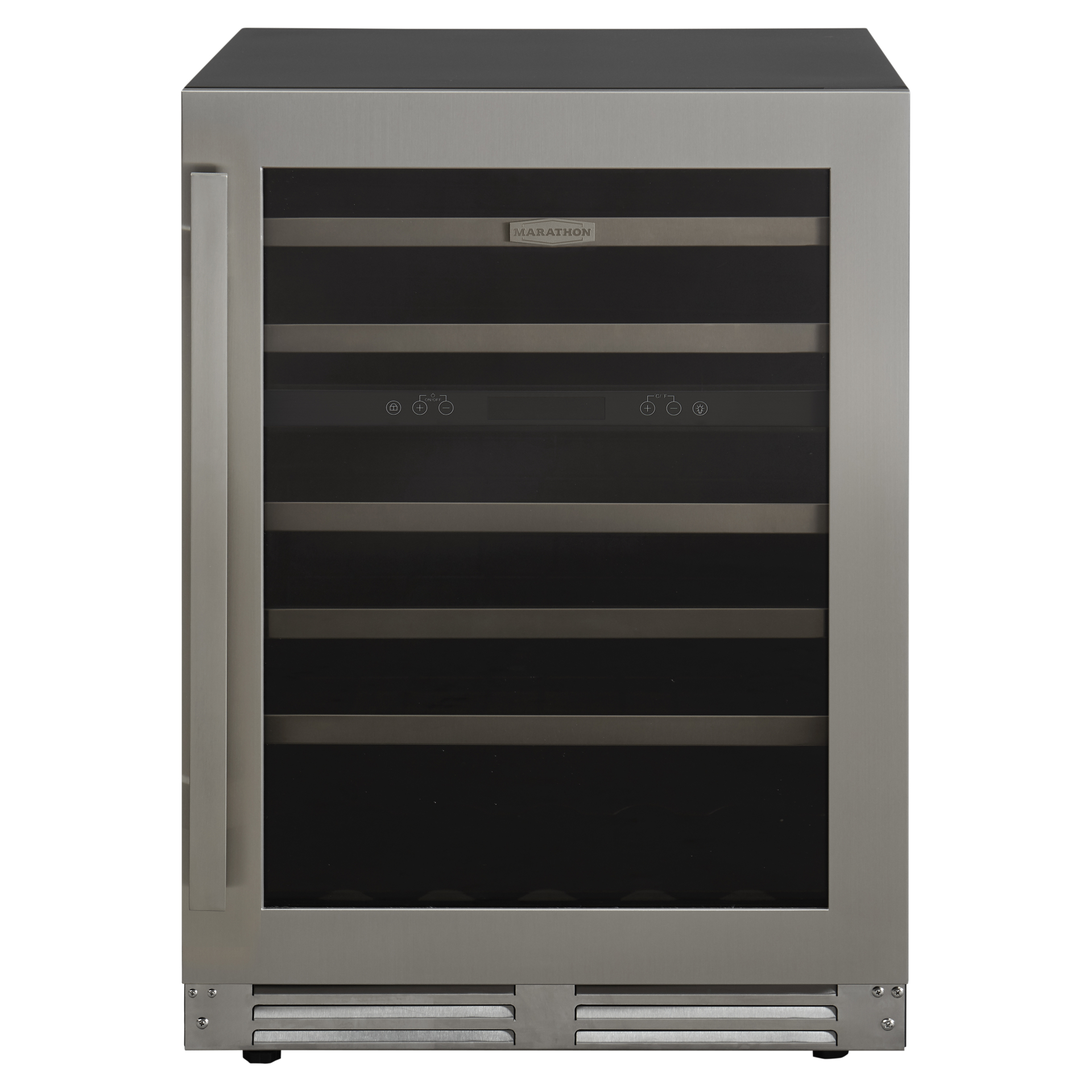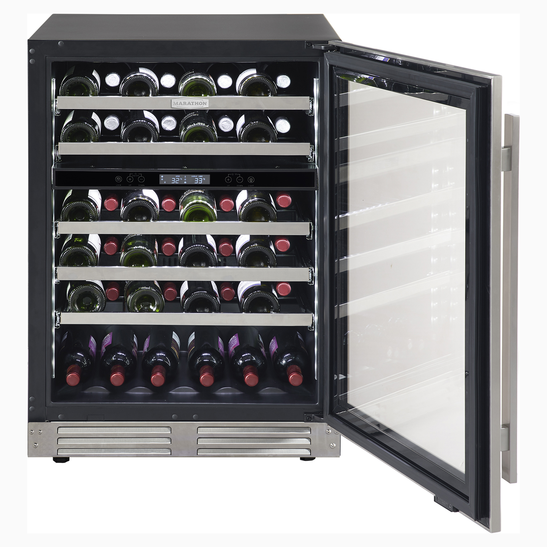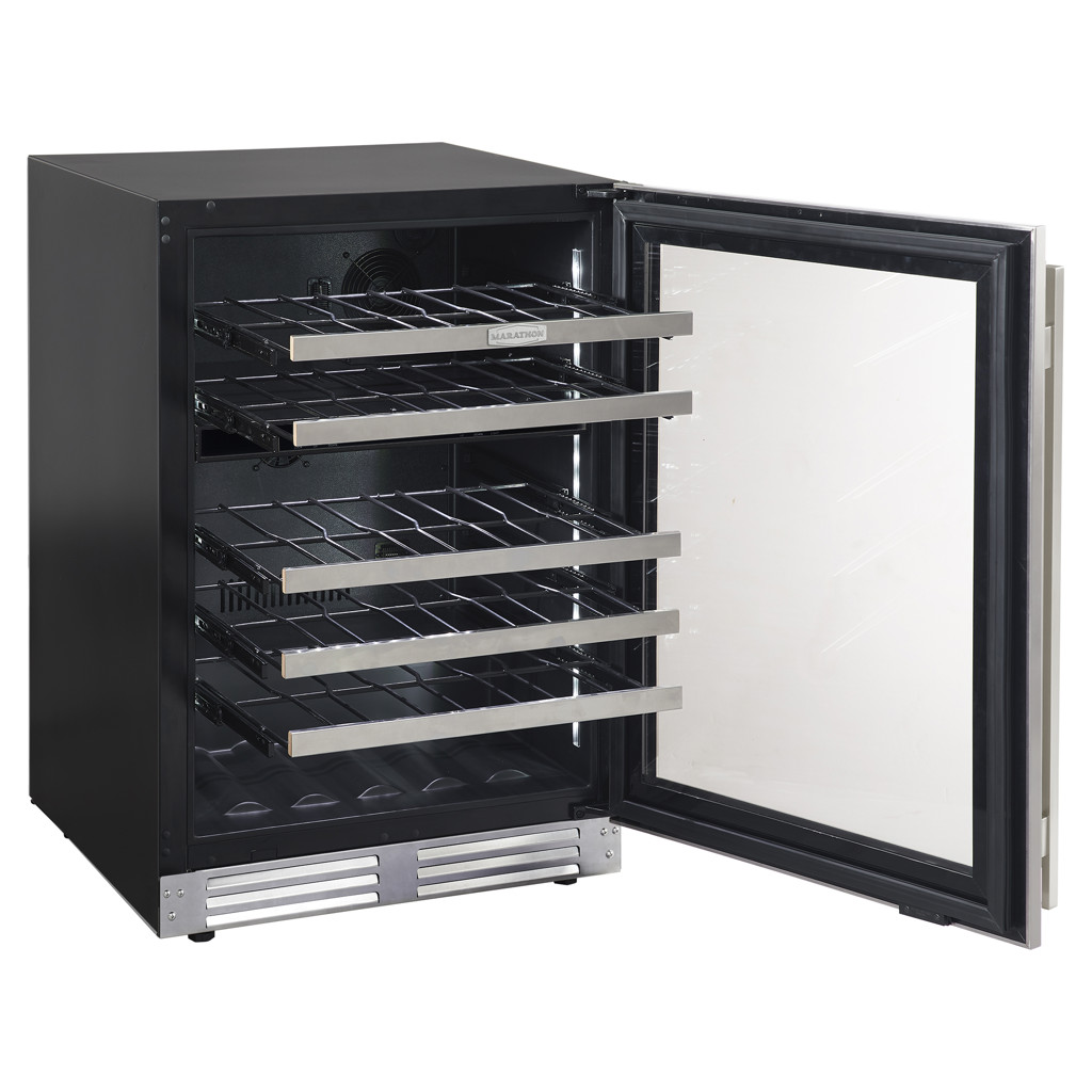 Marathon s’efforce de concevoir des appareils de haute performance et de luxe. La porte en acier inoxydable est réversible et elle est munie d’une charnière spécialisée qui permet l’installation à affleurement de comptoir sans la nécessité d'ajouter un dégagement latéral supplémentaire. Ce cellier peut être installé dans n’importe quelle cuisine ou bar et s’illumine avec splendeur grâce à son éclairage de type DEL avec intensité progressive lors de l’ouverture de la porte.
