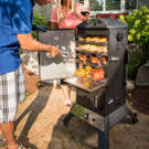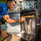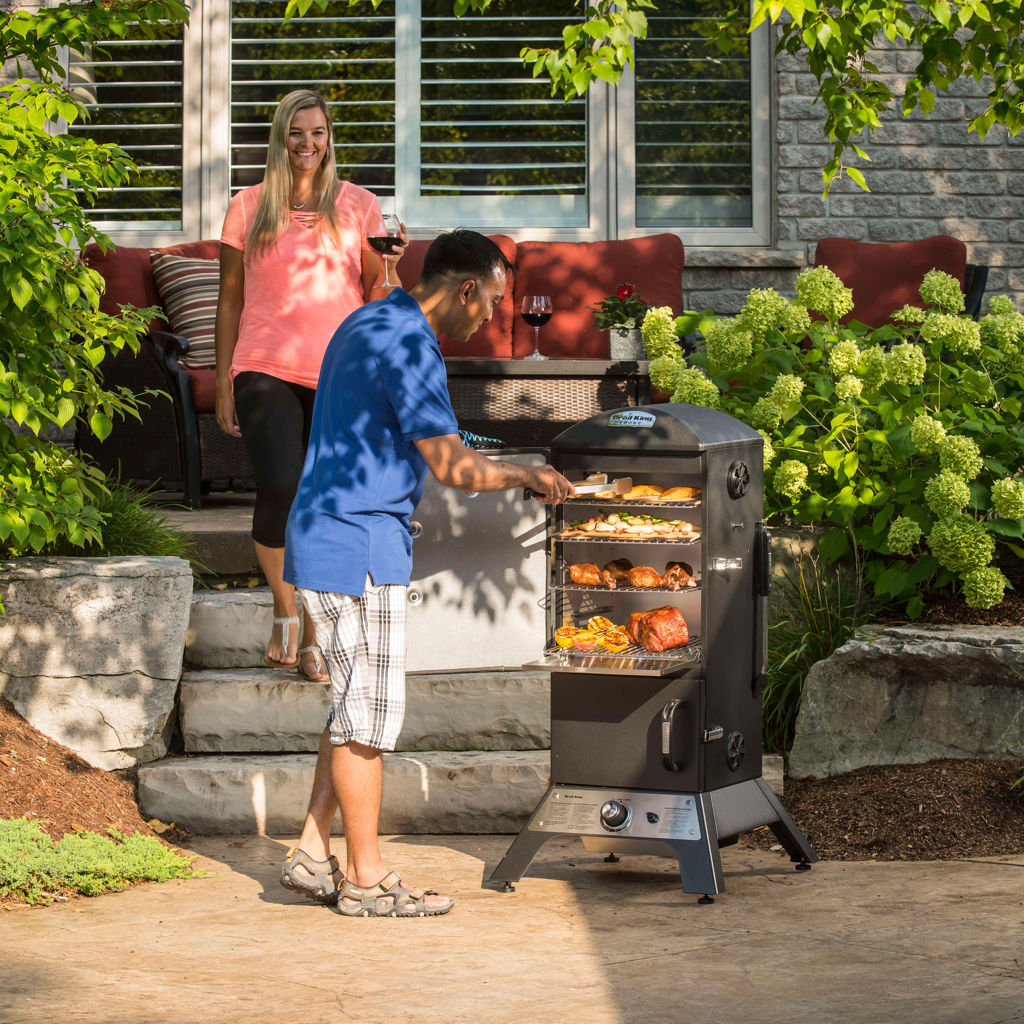 Le fumoir à gaz vertical dispose d'un espace de cuisson total de 770 po², de quatre grilles de cuisson réglables en acier inoxydable, d'un système d'allumage électronique, d'un système d'amortisseur réglable en aluminium moulé Roto-Draft et de deux portes en acier robuste avec un système de verrouillage de qualité supérieure.