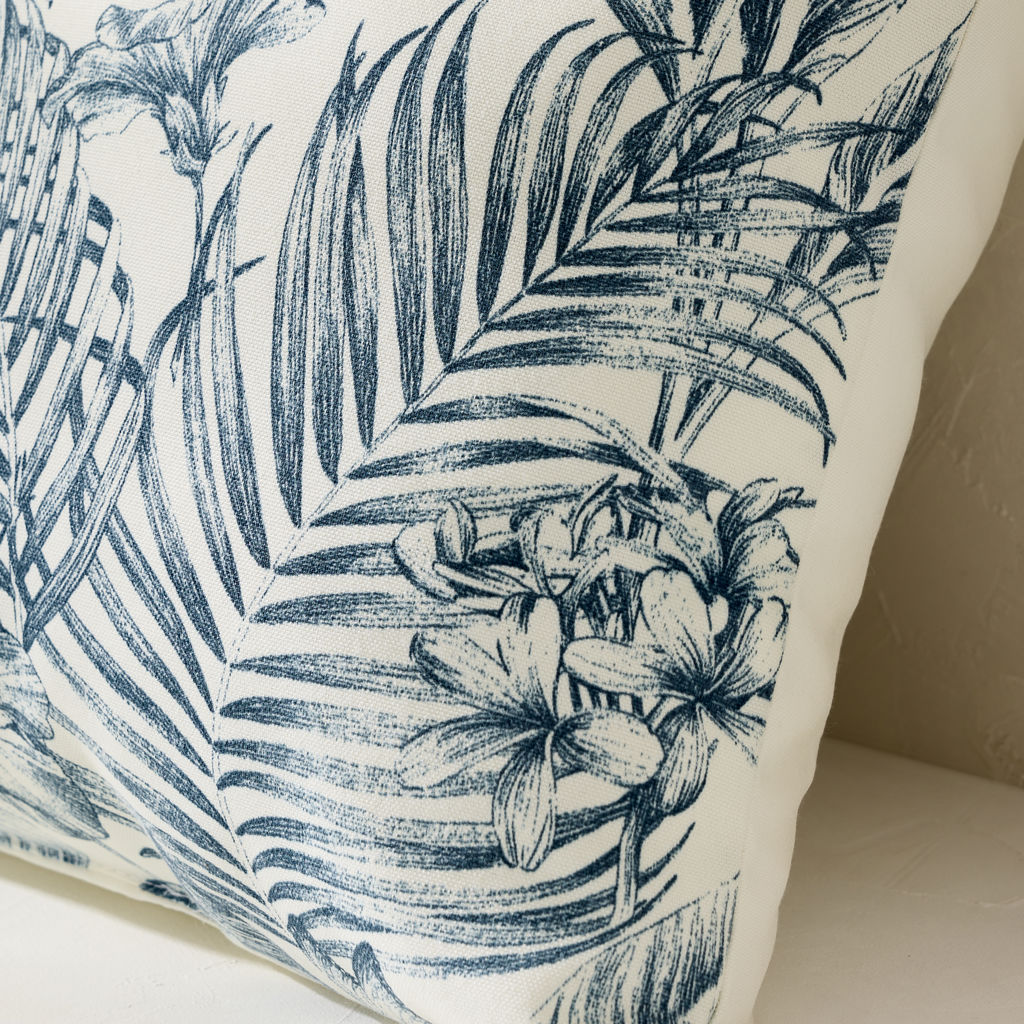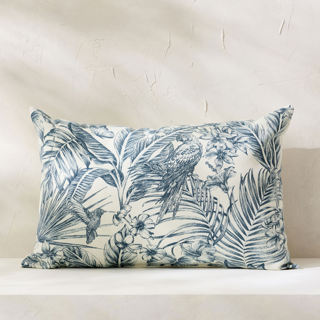 Avec ses motifs de feuillage tropical et de perroquet bleu sur fond beige, ce coussin au tissu luxueux et de grande qualité, apportera une touche à la fois chic et exotique à votre décor extérieur.