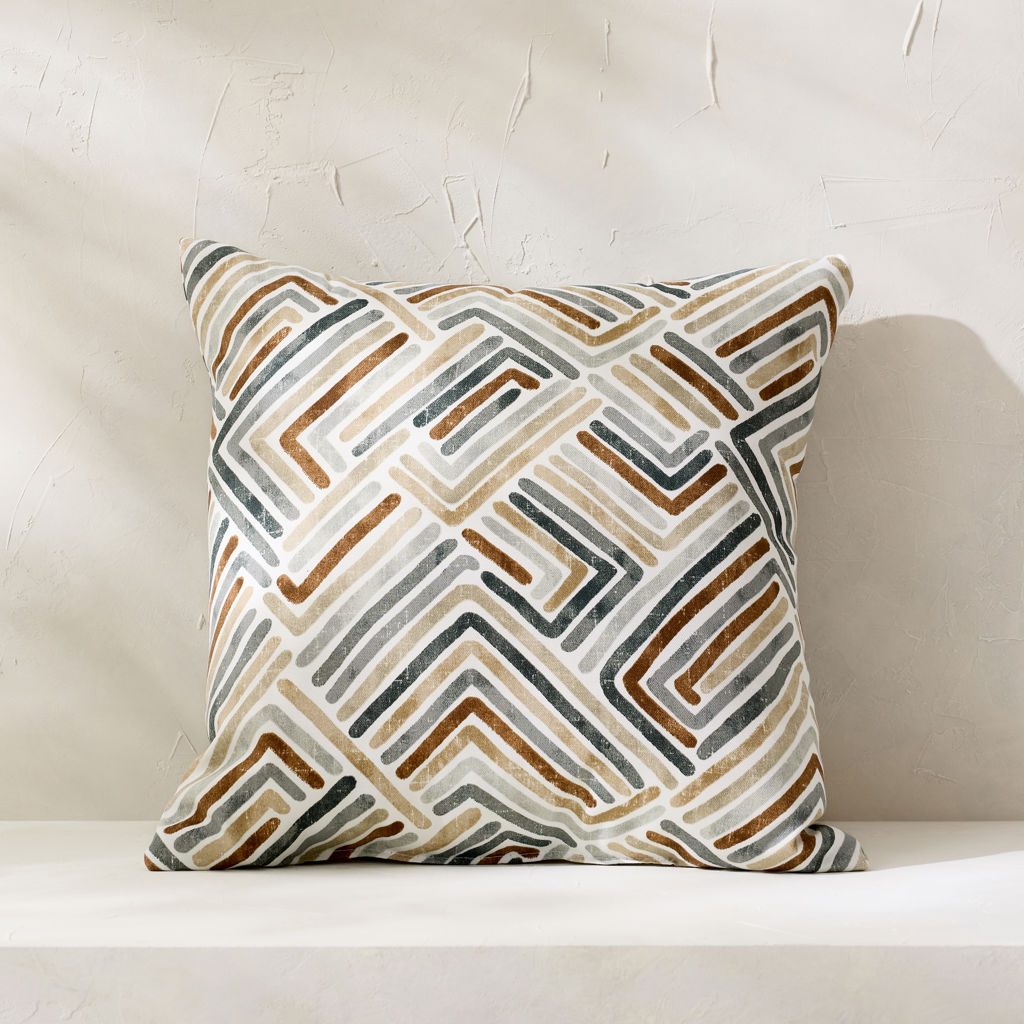 Ce coussin avec son motif géométrique dans les teintes neutres est parfait pour le patio ou le bord de la piscine.