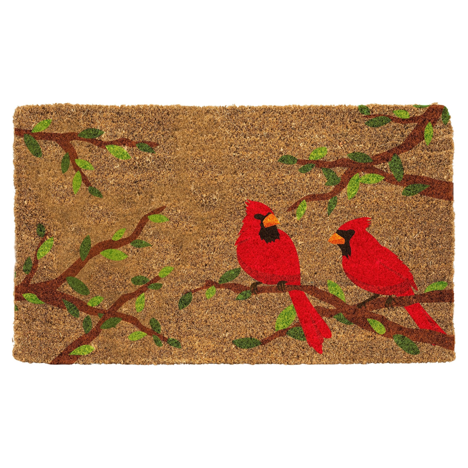 Fabriqué en fibre de coco durable pour résister aux pires intempéries hivernales, ce paillasson de couleur naturelle est orné de deux cardinaux aux couleurs vives perchés sur des branches en fleurs, apportant une touche colorée et accueillante à toute entrée.