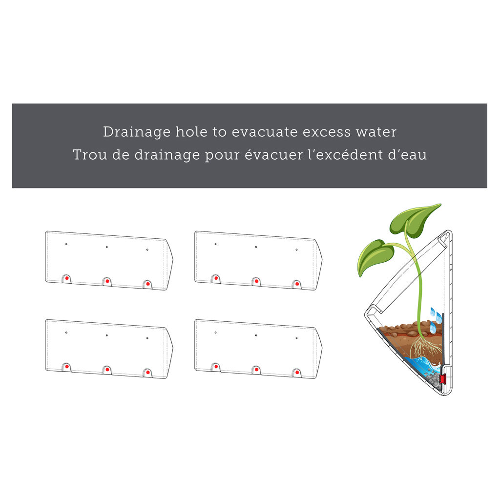 Un système de drainage est inclus dans chaque jardinière afin de permettre à l’eau de bien s’évacuer, et à votre plantes de s’épanouir.