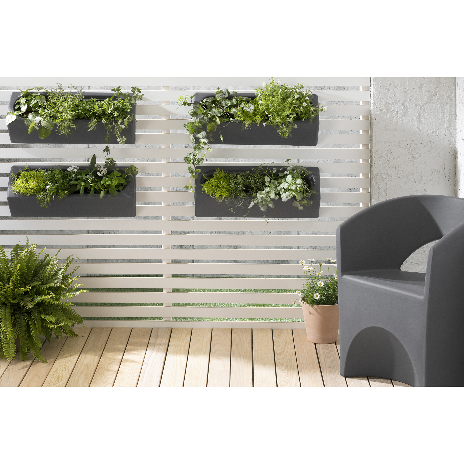 Comme vous disposerez de 4 jardinières pouvant chacune contenir 9 litres de terre, vous pourrez faire l’arrangement de votre choix et les accrocher au mur de votre terrasse, patio, ou balcon comme vous le souhaitez : laissez aller votre imagination!