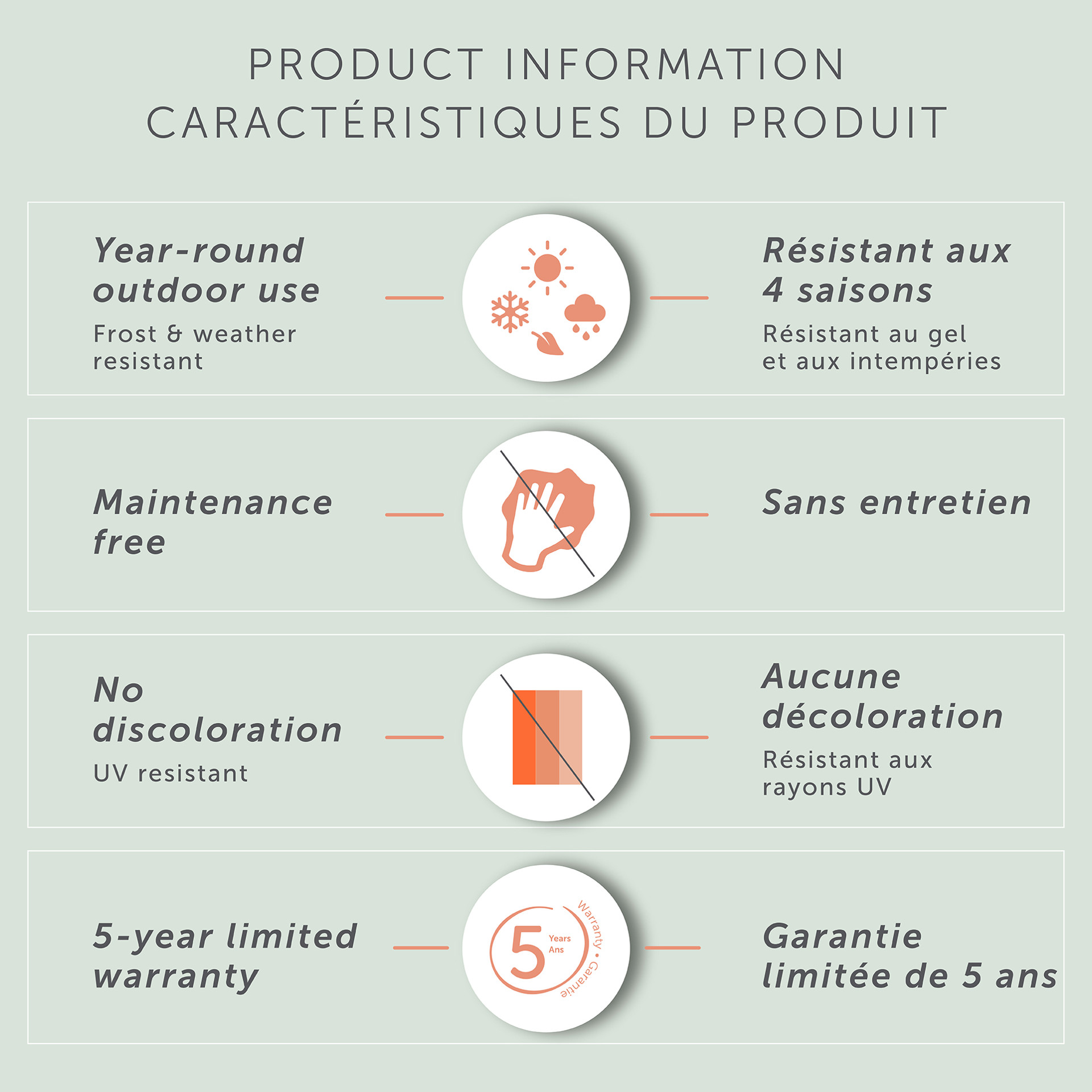 Vous pourrez les laisser dehors toute l’année sans qu’elles ne se décolorent au fil du temps.
