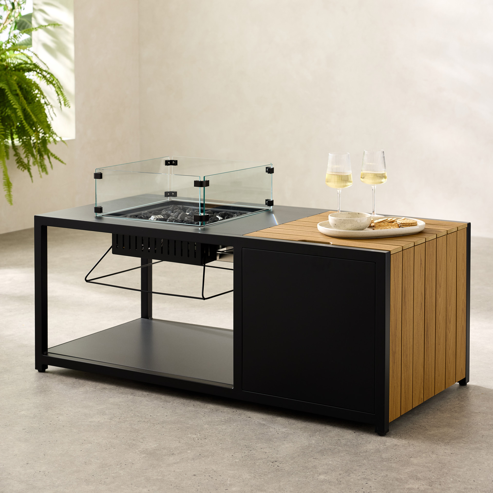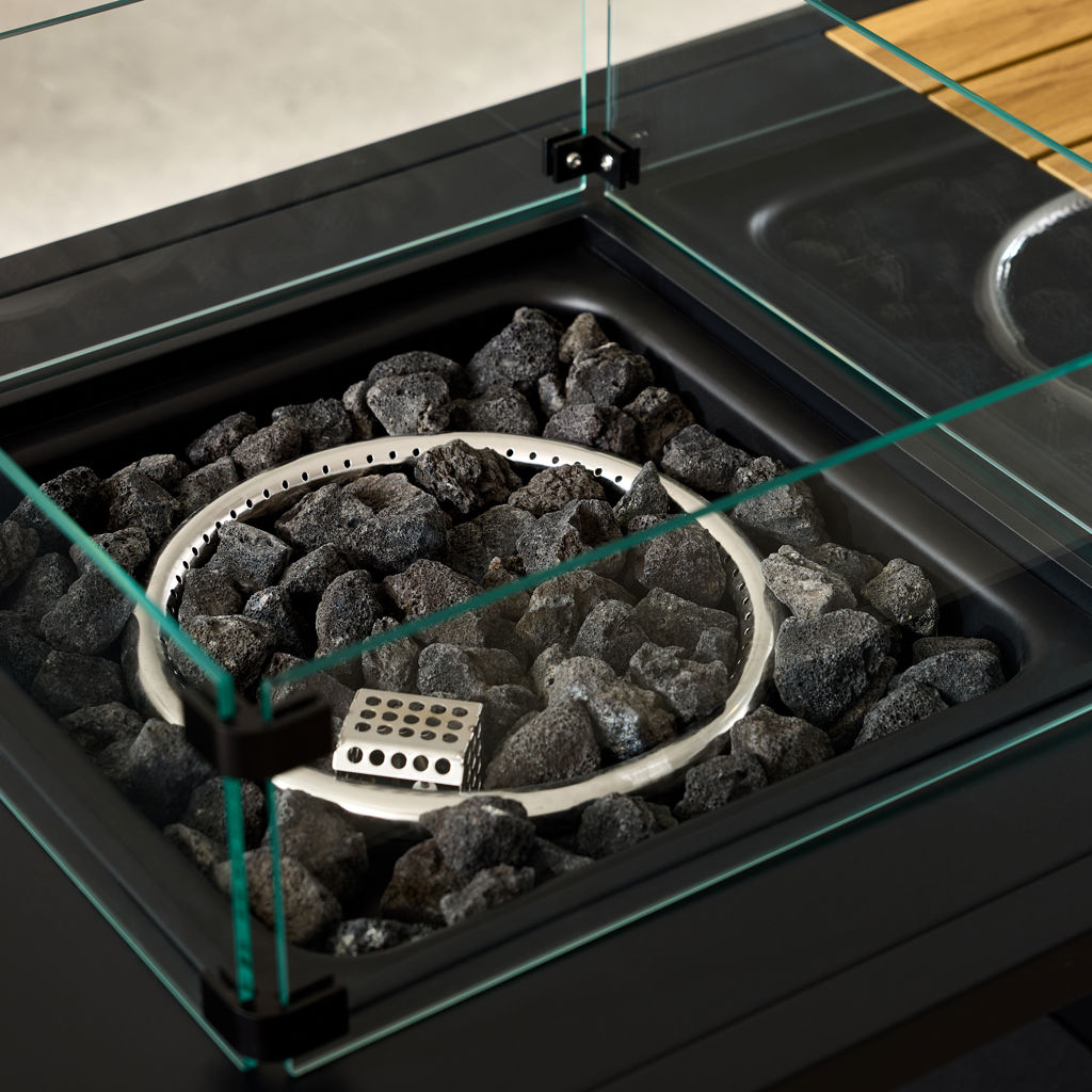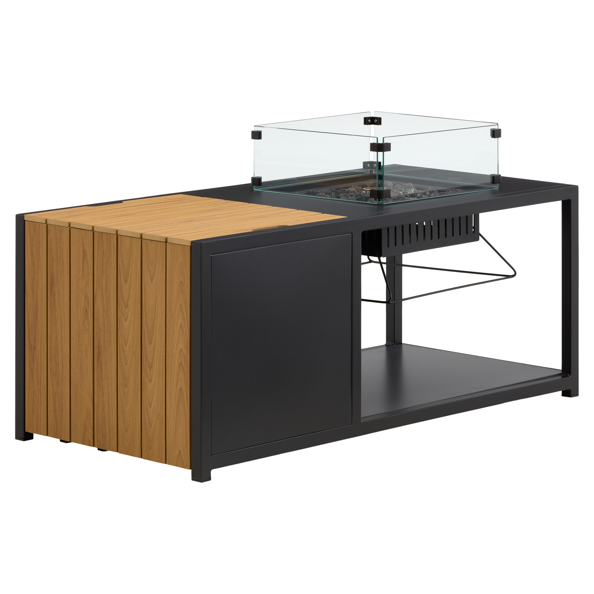 Donnant l'impression d'être dans un salon, la table foyer est dotée d'un cadre en aluminium noir, d'un "polywood" chaleureux et d'une cheminée à gaz intégrée.