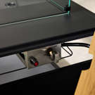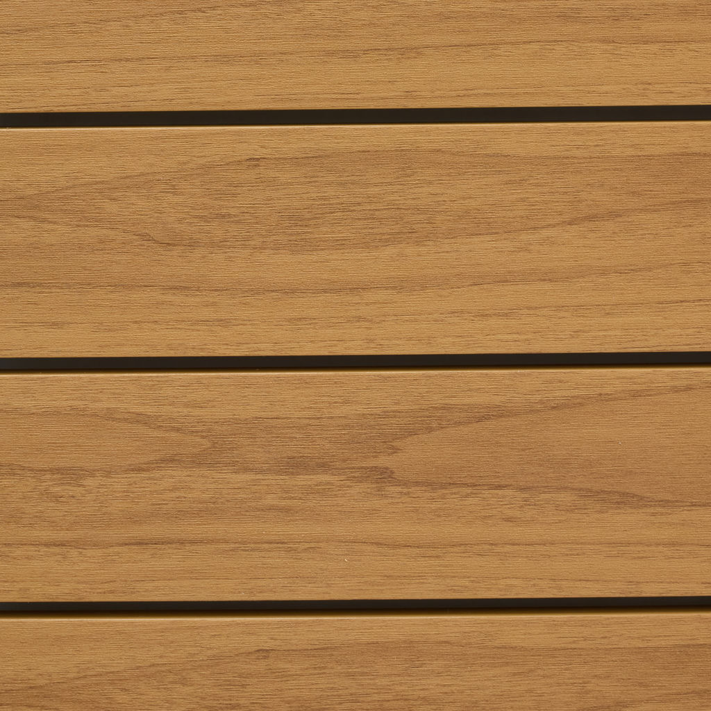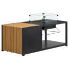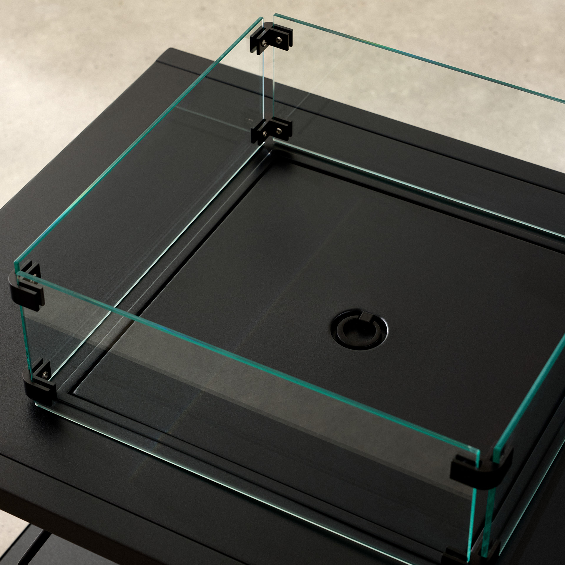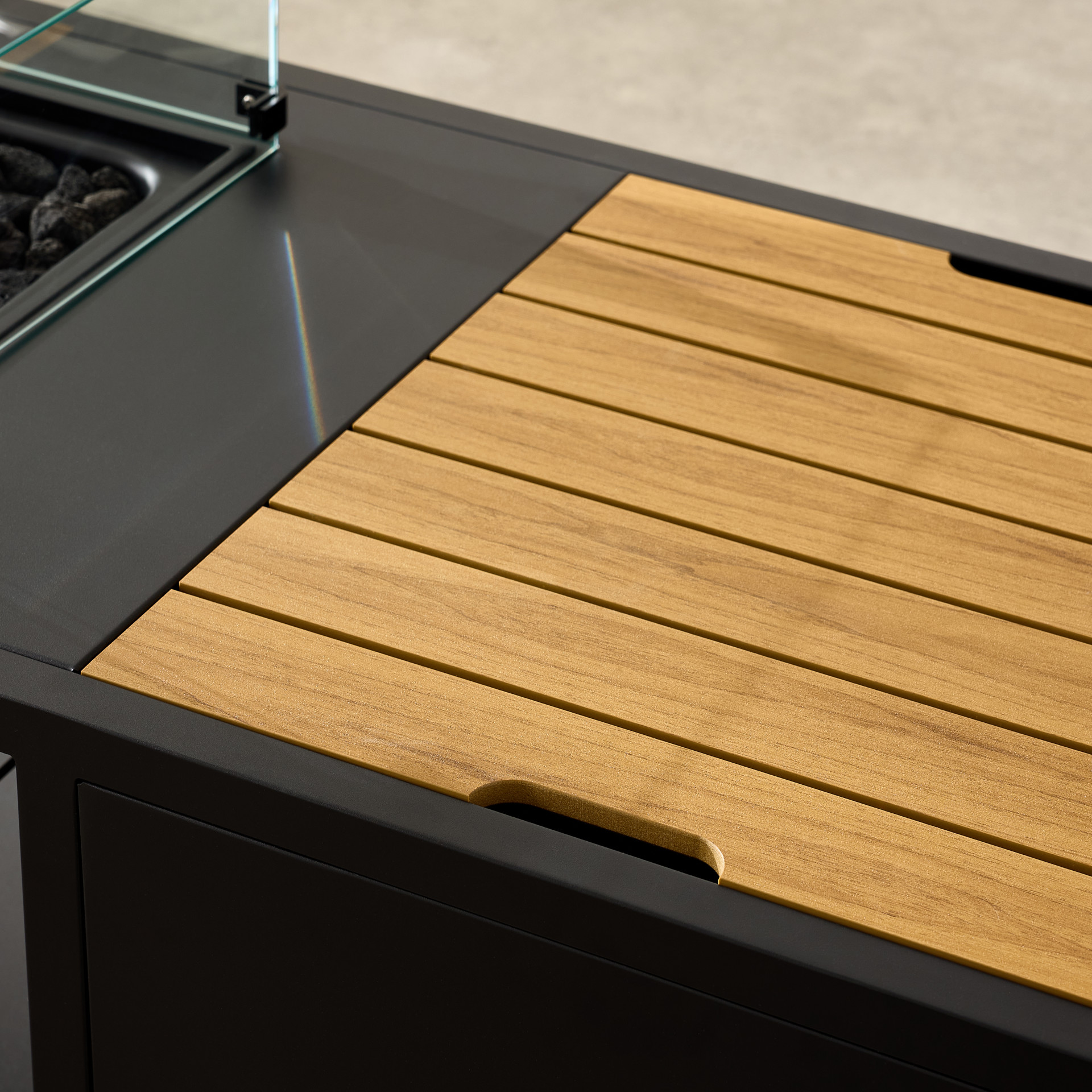 Donnant l'impression d'être dans un salon, la table foyer est dotée d'un cadre en aluminium noir, d'un "polywood" chaleureux et d'une cheminée à gaz intégrée.