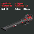 • Puissance d'air : 140 MPH/600 CFM