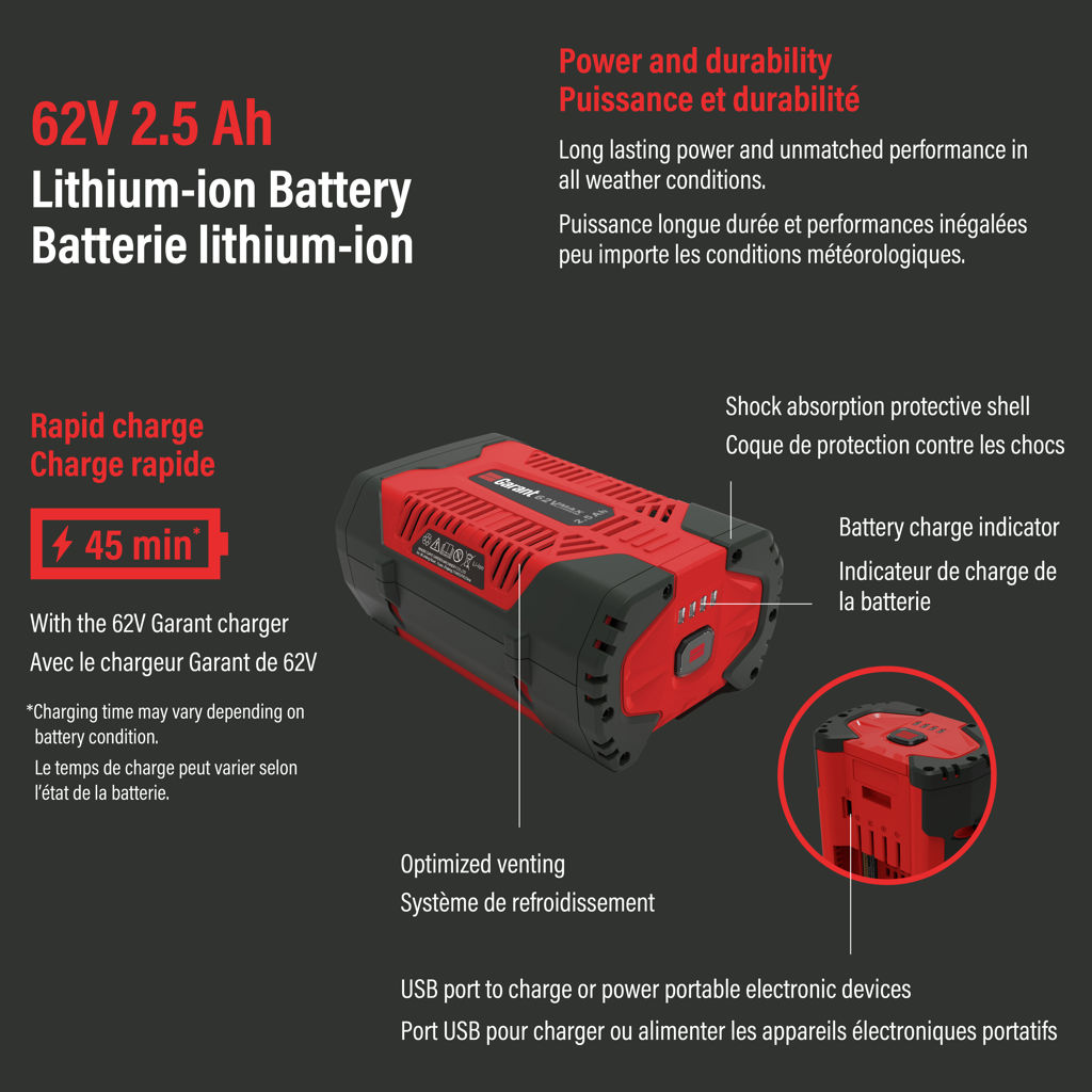 Conçue pour les travaux légers ou en hauteur, la batterie lithium-ion 62V 2,5 Ah de Garant offre une performance fiable dans un format ultra-compact.