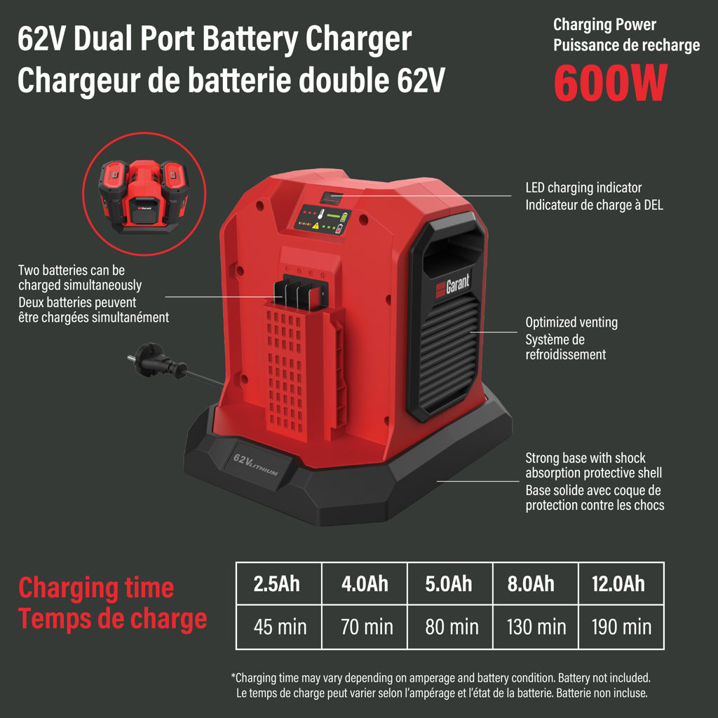 Compatible avec toutes les batteries lithium-ion Garant 62V, ce chargeur est le compagnon idéal pour entretenir vos équipements de jardinage, de déneigement ou d'entretien extérieur.