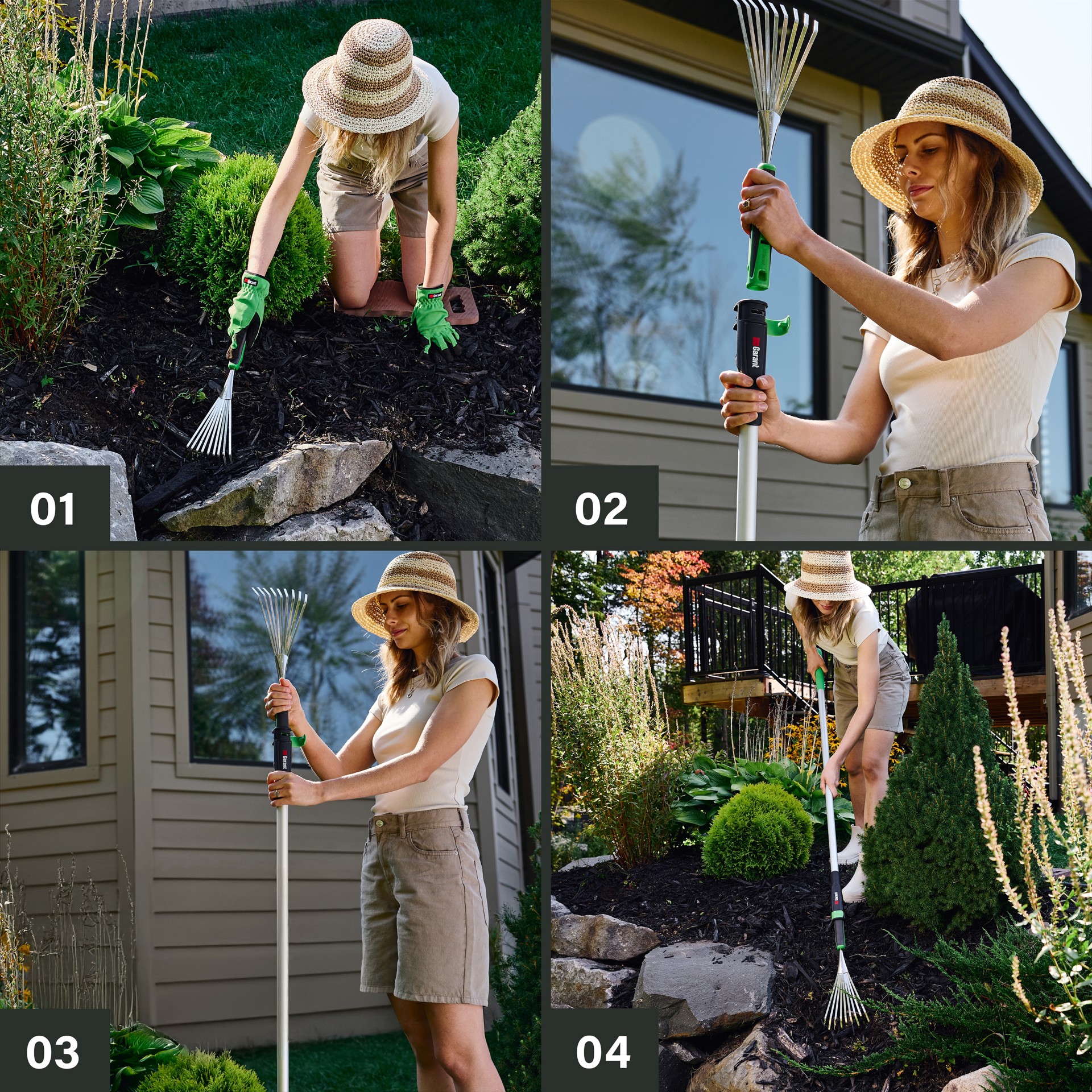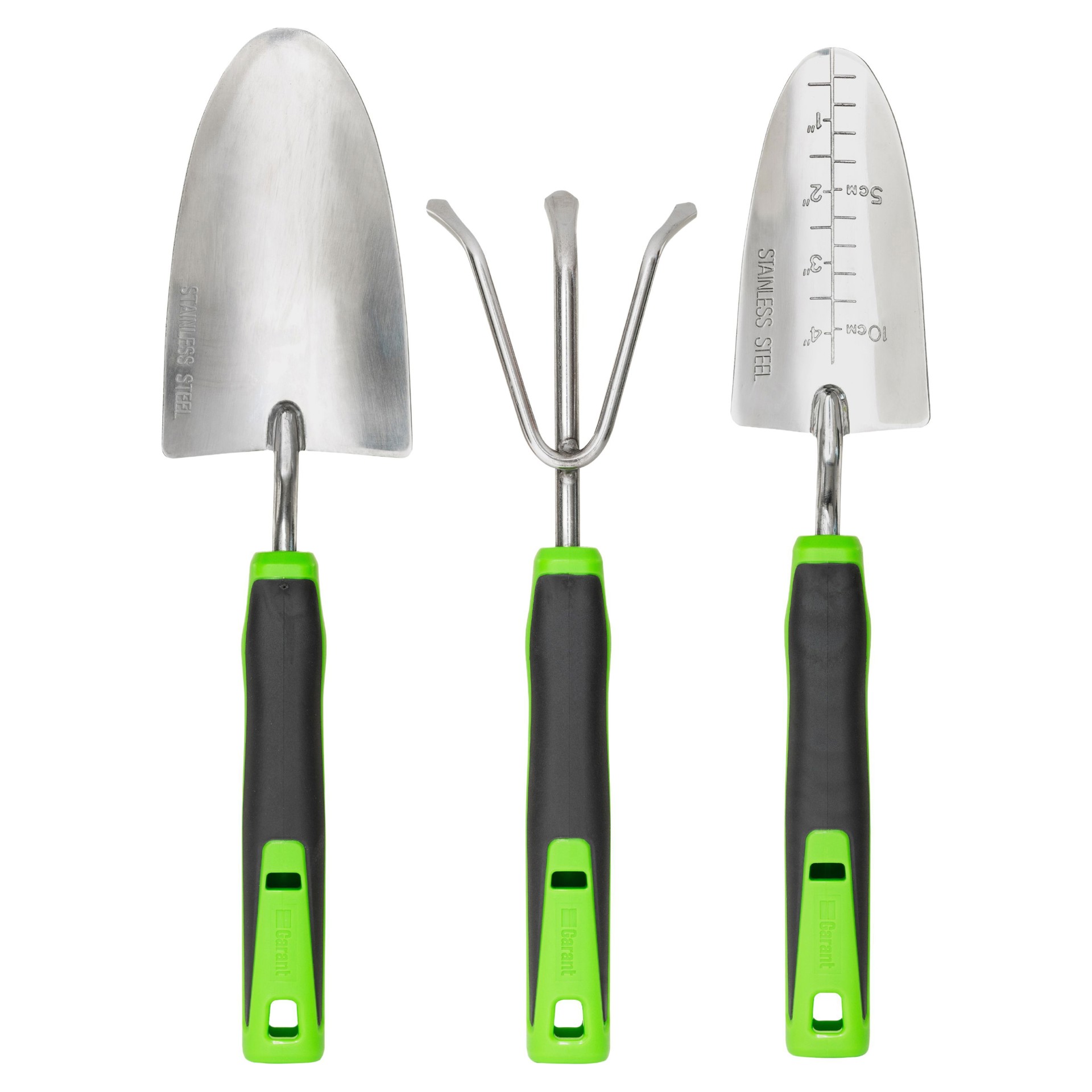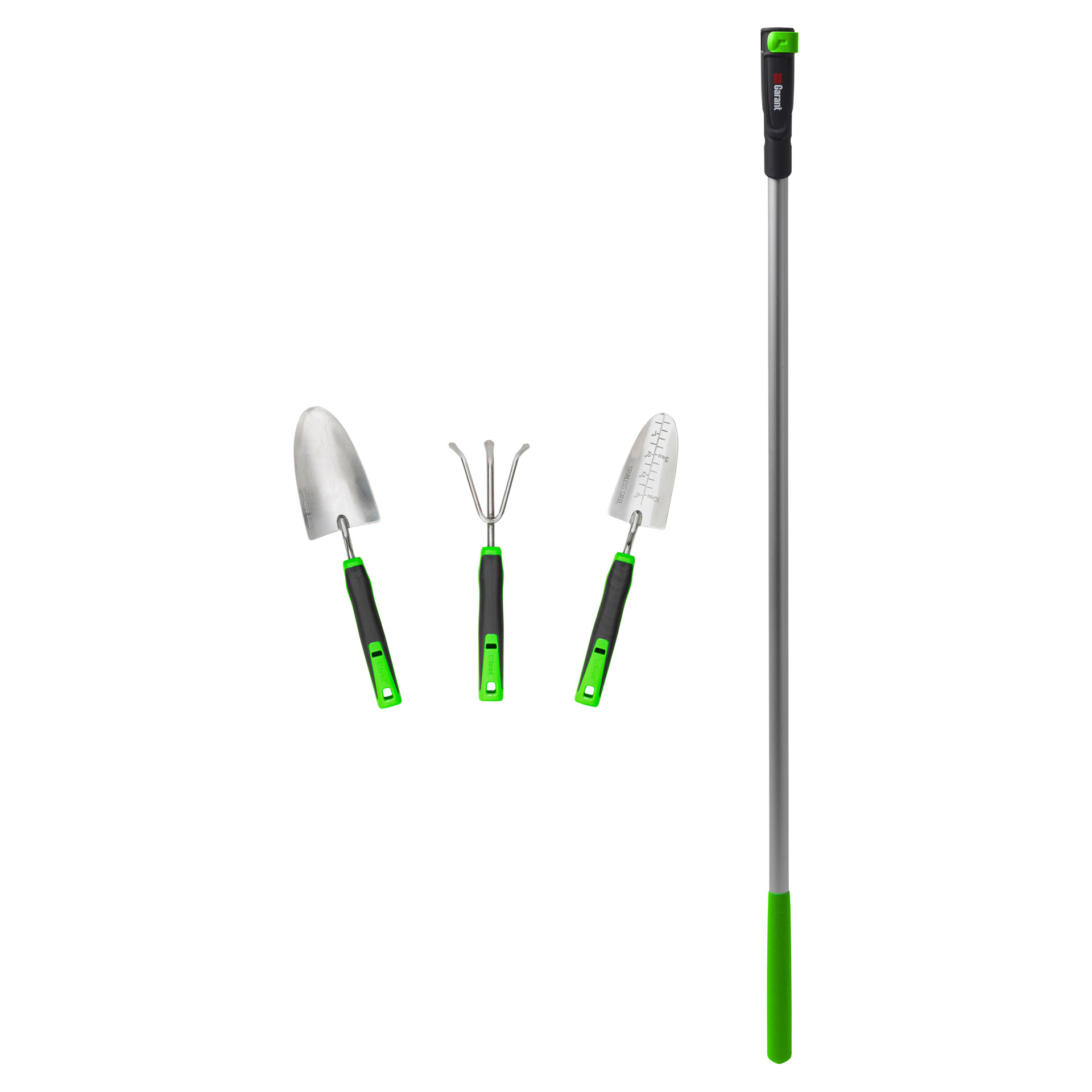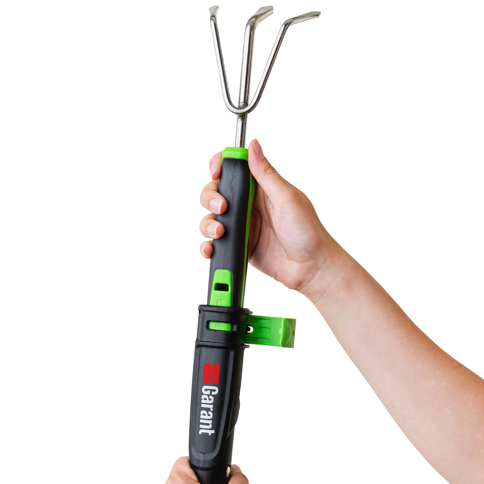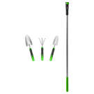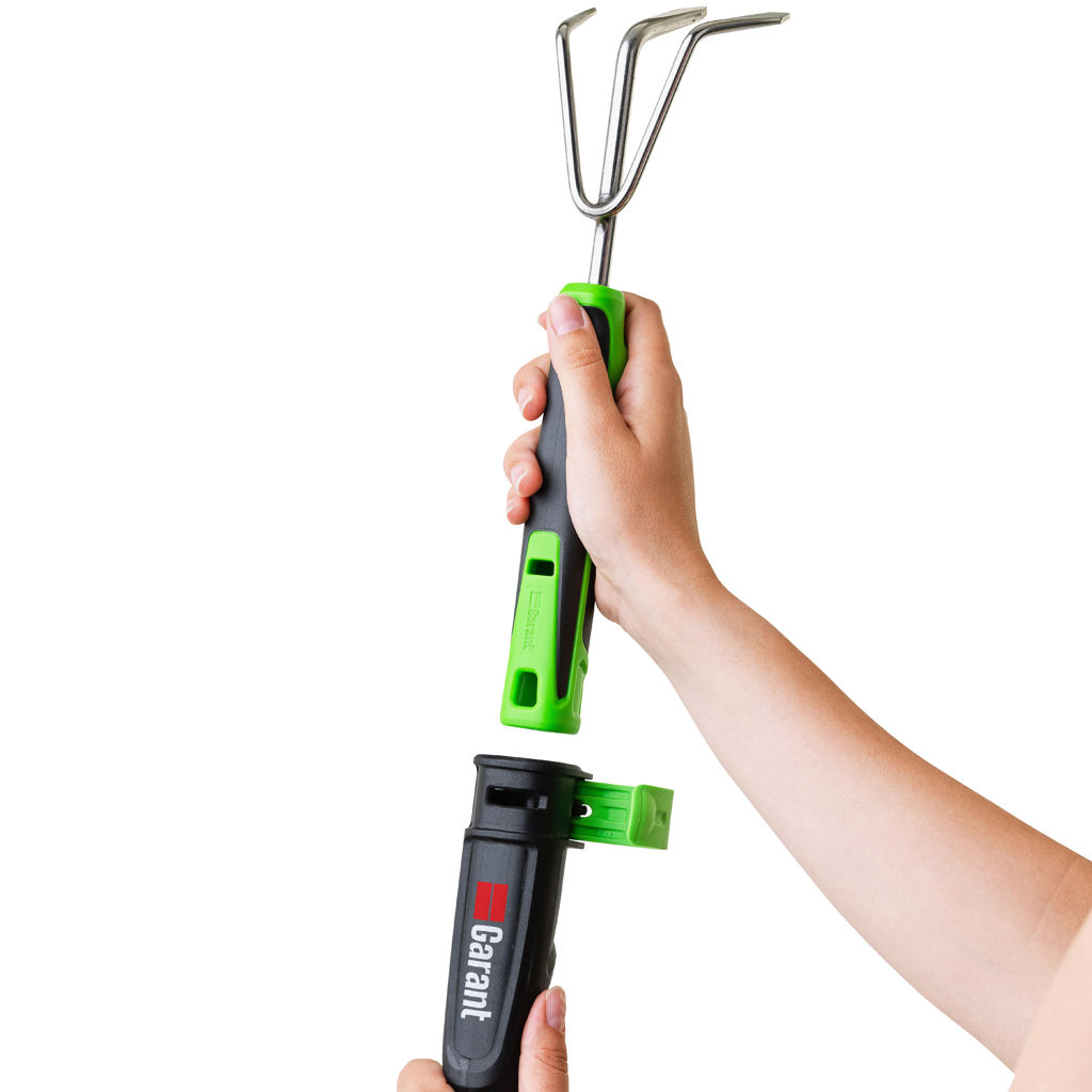 L'ensemble inclut 3 outils de jardinage Connexion Rapide Garant: truelle, transplantoir et sarcloir. Tête interchangeable pour permettre à l'utilisateur de travailler dans la position idéale.