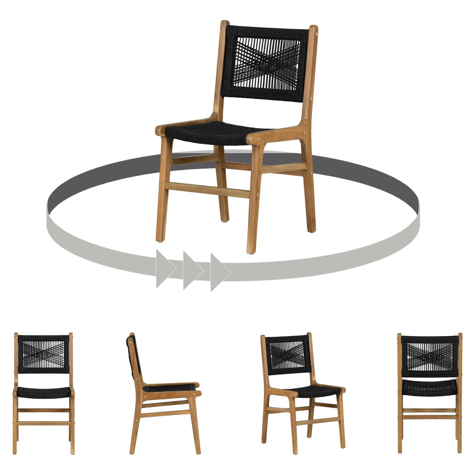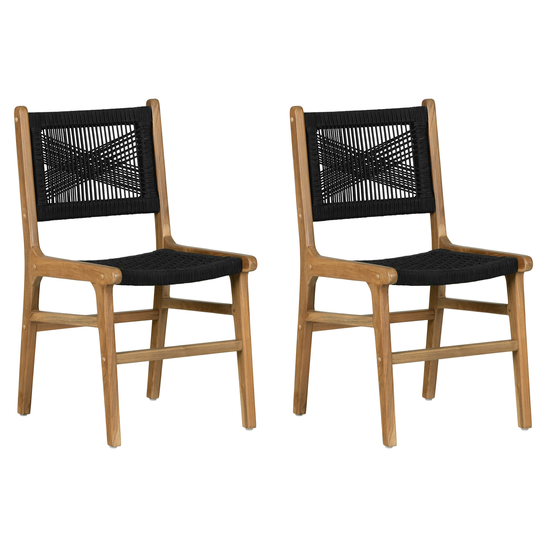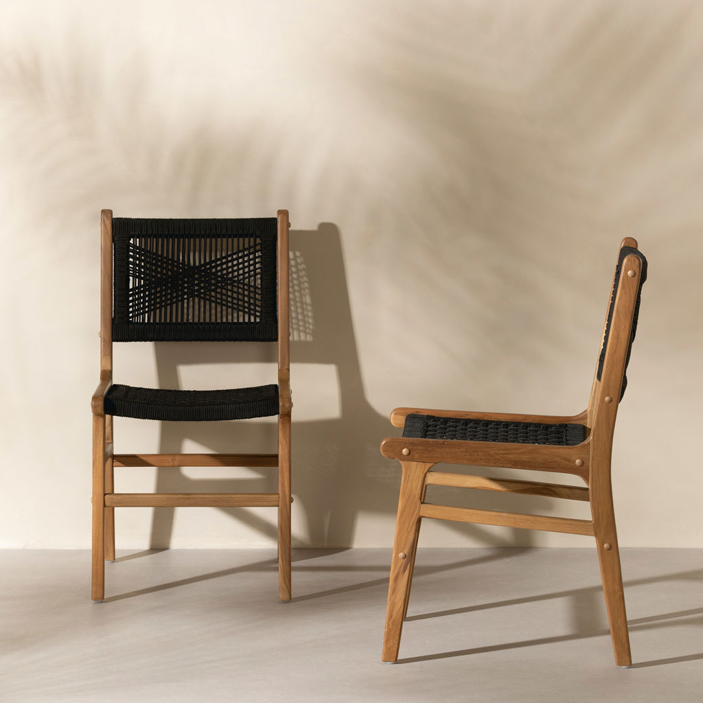 Optez pour ces 2 chaises d´extérieur conçues pour s´adapter à des conditions météorologiques variées. La corde d´oléfine est extrêmement solide. Il s´agit d´une fibre synthétique imperméable prisée dans l´industrie du mobilier de jardin. Le bois de teck quant à lui se démarque par sa haute résistance à l´humidité et aux chocs. Enduisez-le d´une huile protectrice chaque année pour être assuré de préserver sa couleur d´origine. Cette sélection de matières n´est pas anodine! Elle vous permettra de profiter de vos nouveaux meubles des années durant!