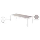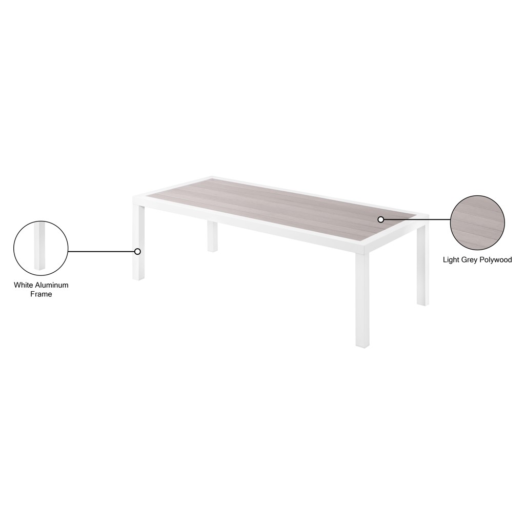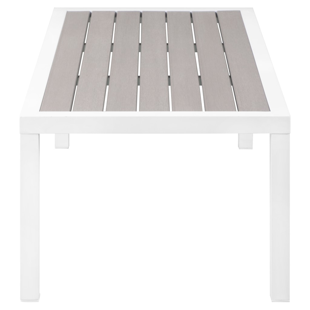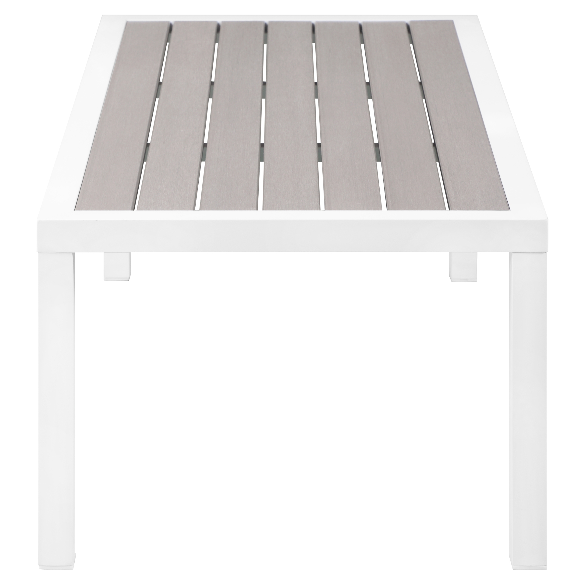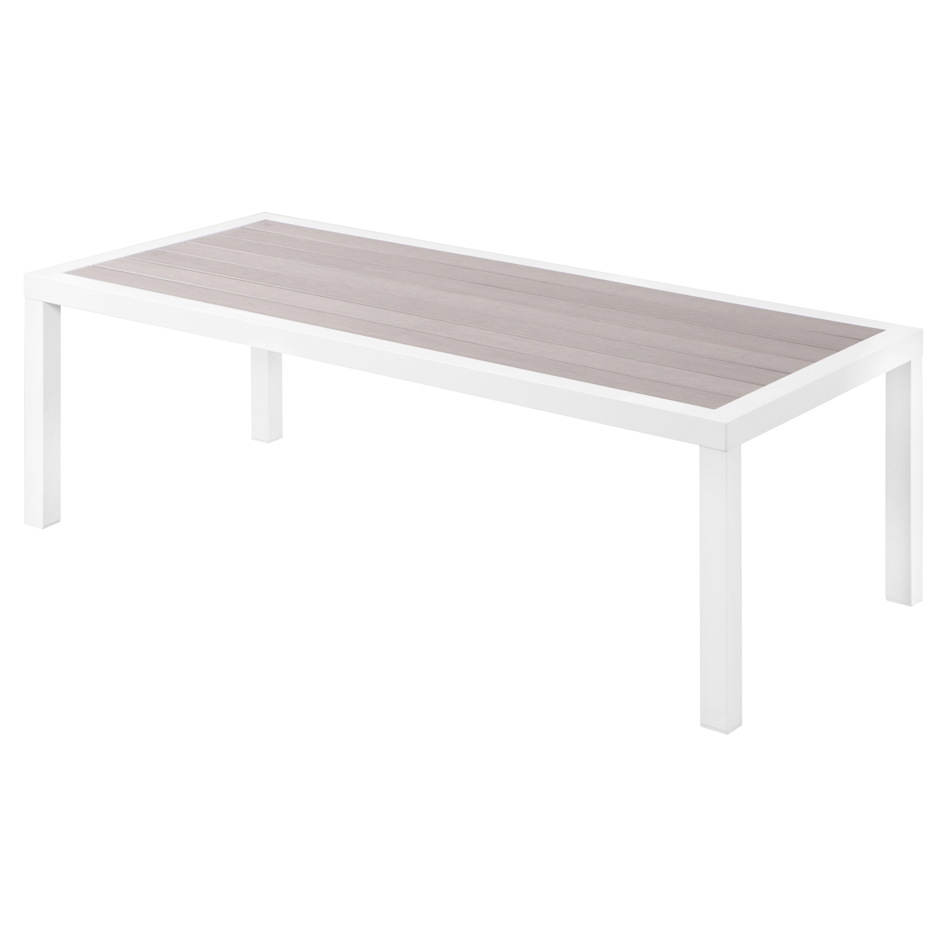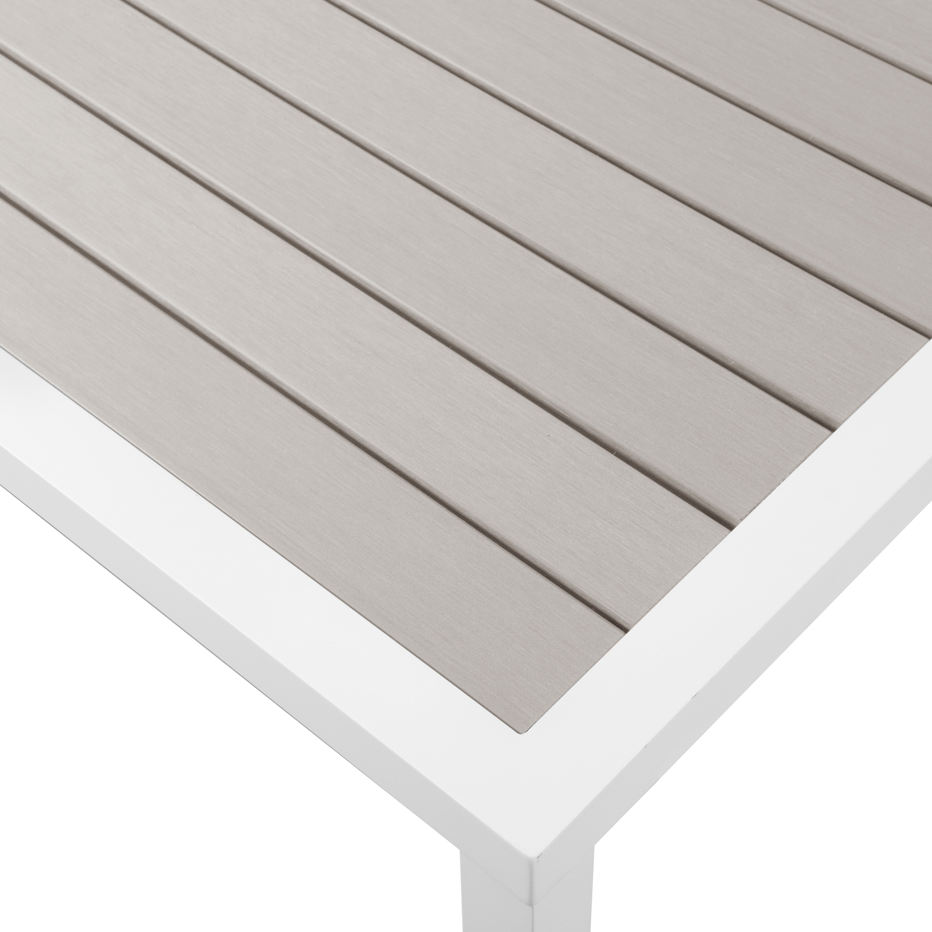 Le dessus de la table est fabriqué à partir de panneaux décoratifs en bois et en plastique gris et est à lattes, de sorte que l'humidité se dissipe facilement à travers ses fissures. Un cadre en aluminium ajoute une durabilité résiliente à la conception de cette table, garantissant qu'elle dure et dure, saison après saison.