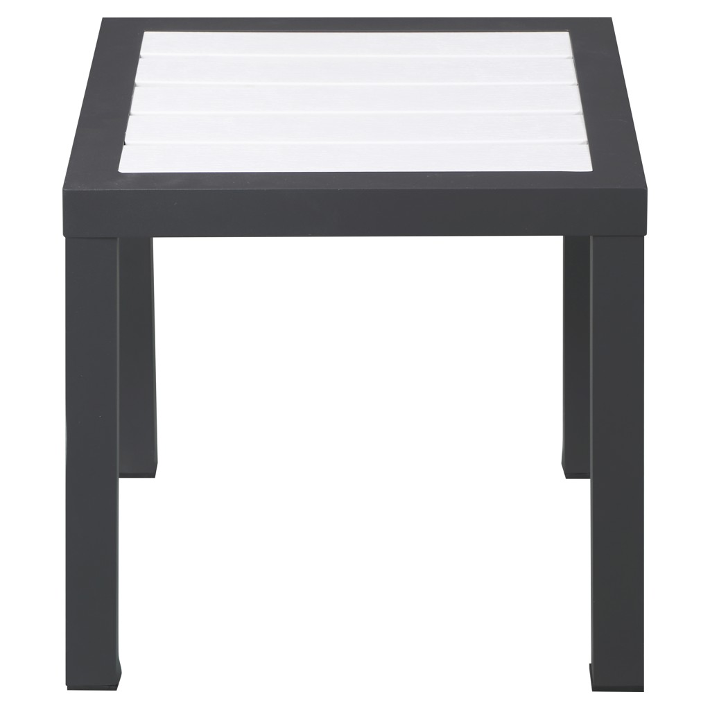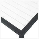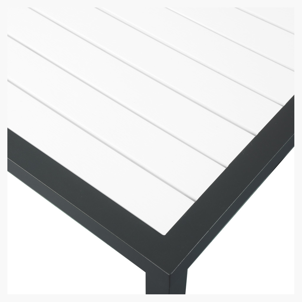 Le dessus de la table est fabriqué à partir de panneaux décoratifs en bois et en plastique blanc et est à lattes, de sorte que l'humidité se dissipe facilement à travers ses fissures. Un cadre en aluminium ajoute une durabilité résiliente à la conception de cette table, garantissant qu'elle dure et dure, saison après saison.