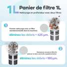 La cartouche filtrante de 1 litre est facile à retirer et à nettoyer, ce qui facilite l'entretien et le stockage.