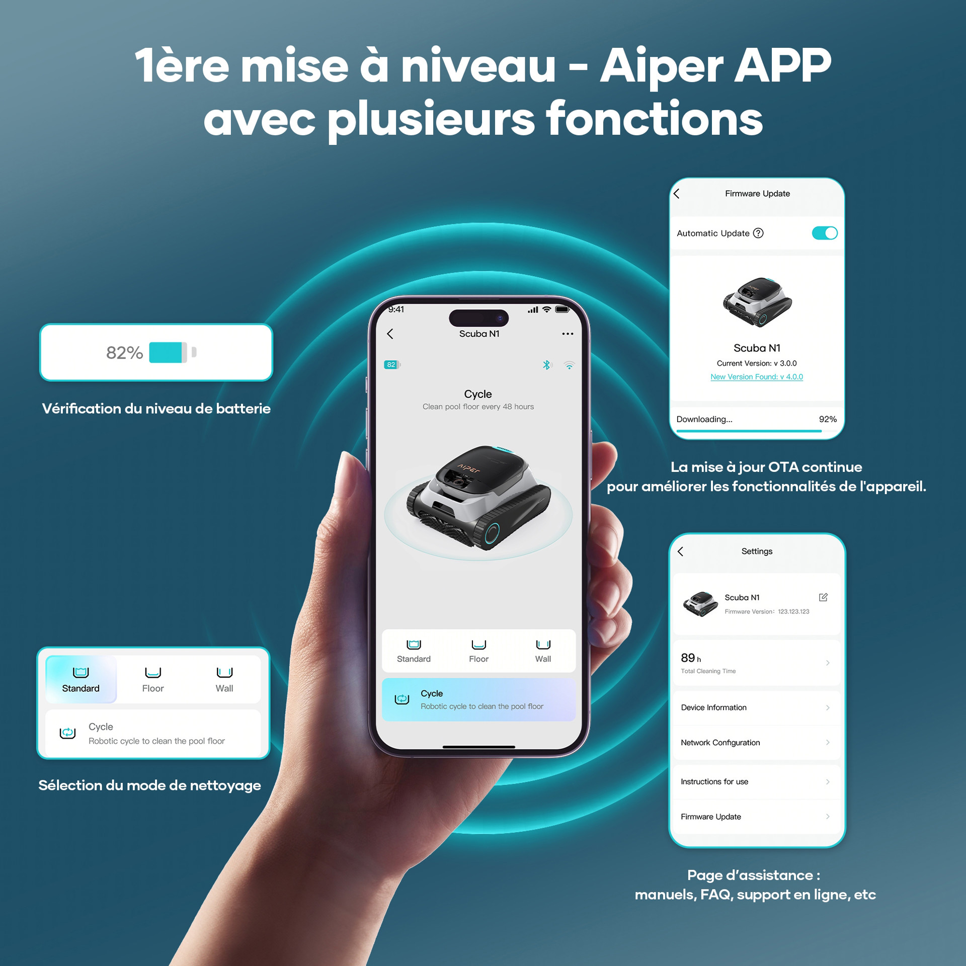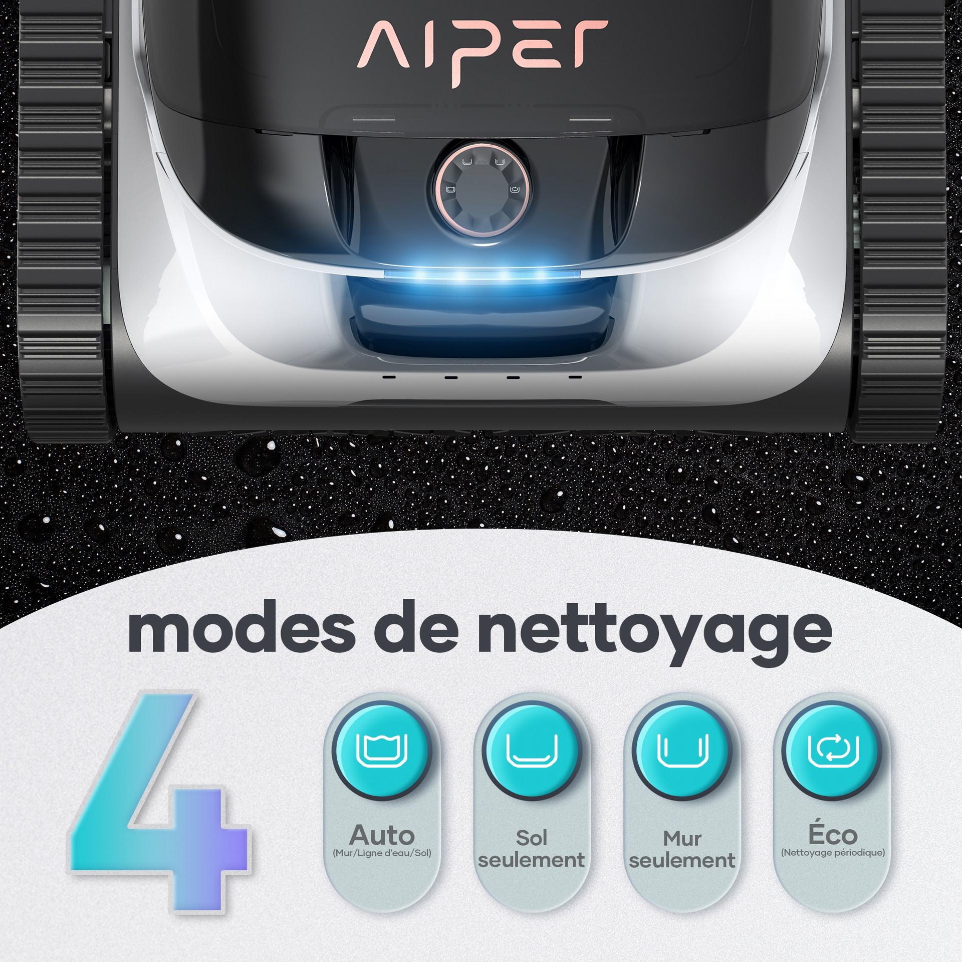 Optimisez le nettoyage de la piscine avec les multiples modes du robot piscine AIPER Scuba N1 Plus: Sol, Paroi, Sol + Paroi ou Éco (Nettoyage périodique). Adaptez chaque session aux besoins spécifiques de votre piscine pour un nettoyage efficace et économique en temps.