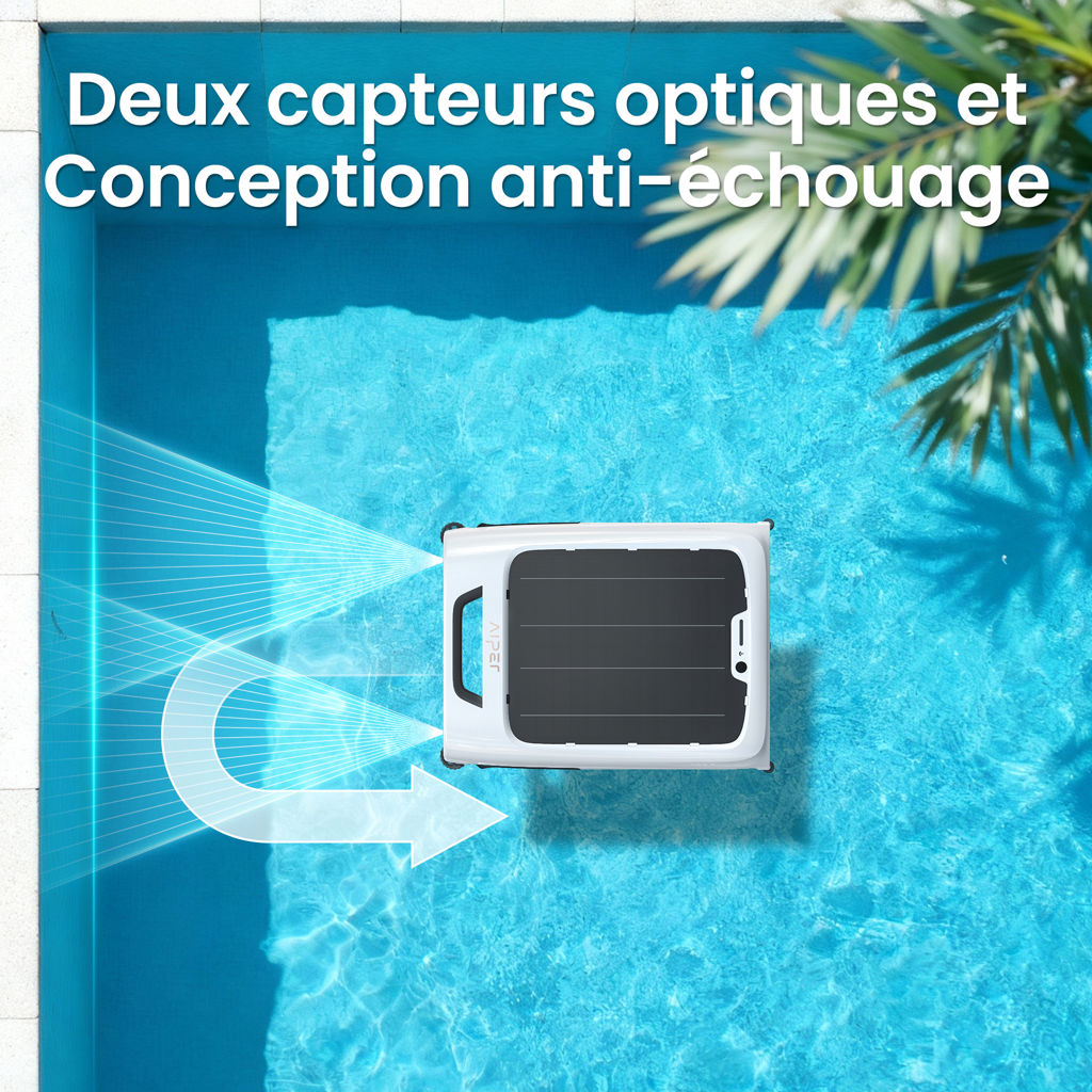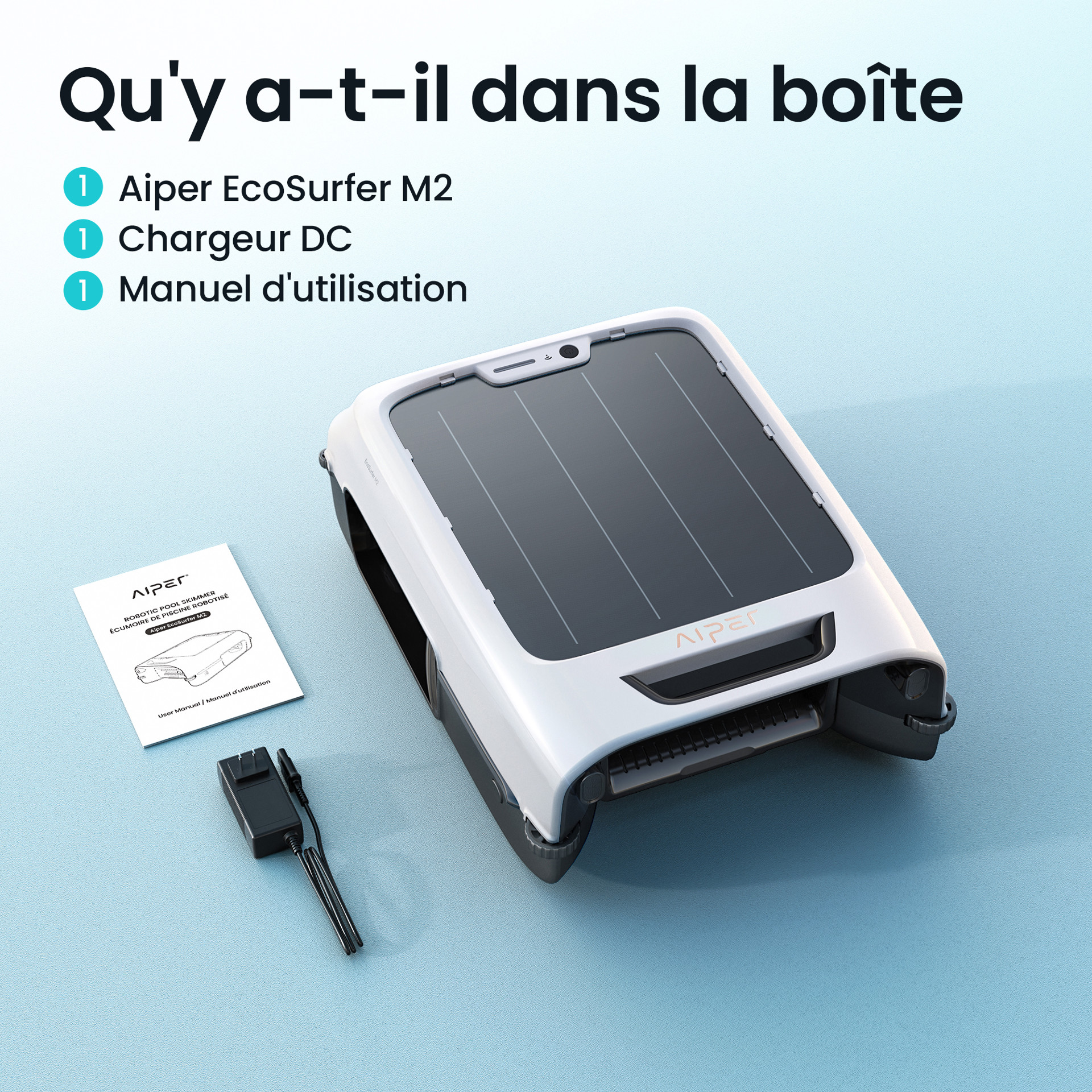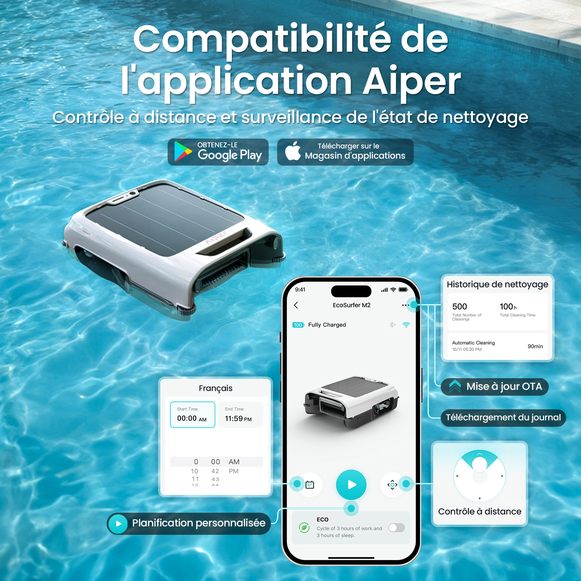L'Aiper EcoSurfer M2 assure un nettoyage écologique de votre piscine grâce à l'énergie solaire, offrant jusqu'à 35 heures d'autonomie sans câble de recharge. Sa roue à aubes et ses moteurs sans balais collectent efficacement les débris en surface, tandis que l'application Aiper vous offre un contrôle total pour la programmation, la personnalisation et la navigation manuelle.