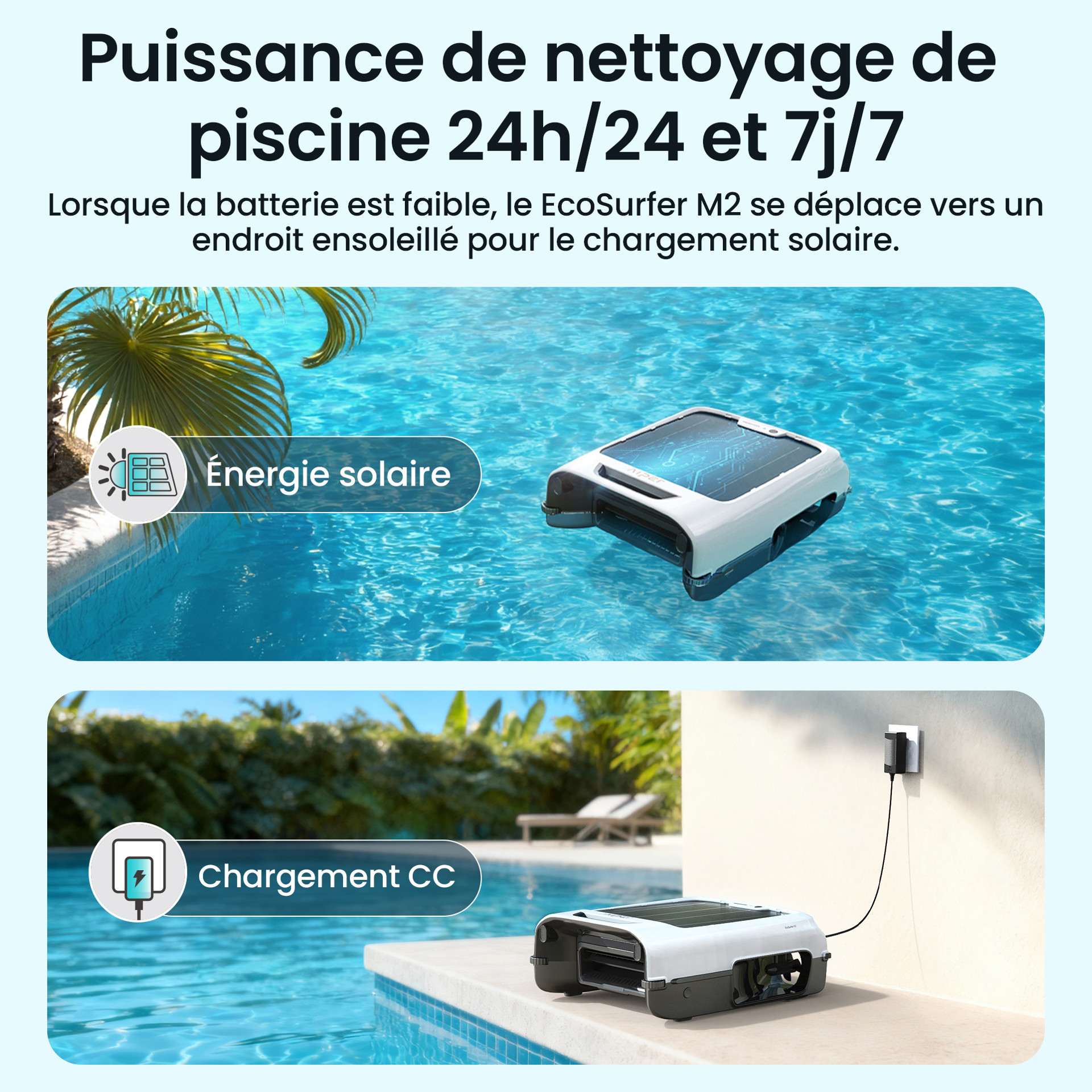 Non seulement le EcoSurfer M2 offre une autonomie de 35 heures, mais, lorsque la batterie est faible, le EcoSurfer M2 se déplace instinctivement et cherche un endroit ensoleillé pour recharger sa batterie à l’énergie solaire, garantissant ainsi une performance de nettoyage ininterrompue !